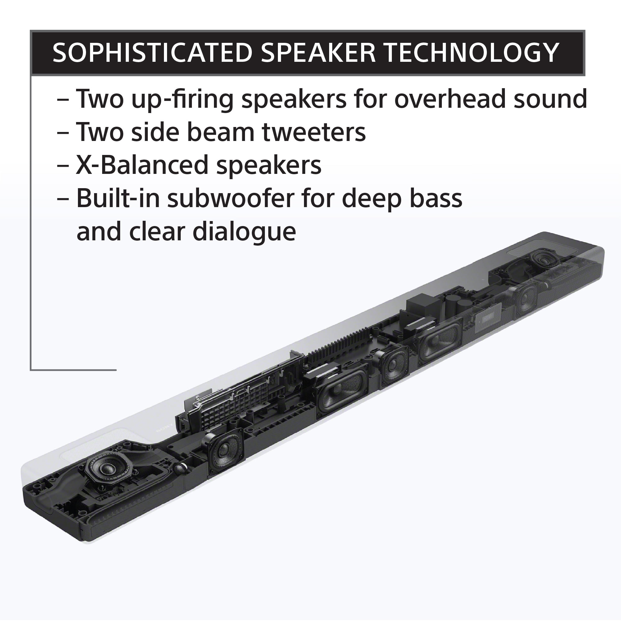 Thanks to Sony’s virtual surround technology, the soundbar can position sound in vertical space Using front speakers only, Sony’s unique digital sound field processing technology virtually reproduces the surround sound field Powerful speakers work together to deliver clear, wide-ranging sound throughout your room Reflect sound off the ceiling for immersive overhead audio using X-balanced speaker technology