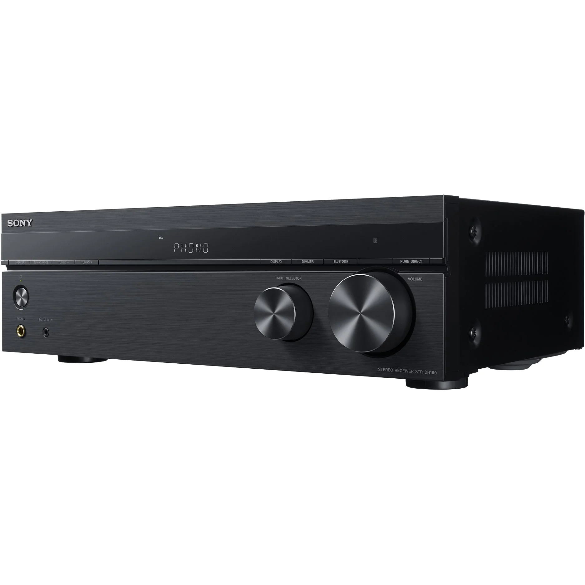 Key Features: Phono input for your turntable: Plug your turntable directly into the receiver via the phono input for appropriate pre-amplification and EQ. Smarter Bluetooth connectivity: Not only can you wirelessly stream and play music from other Bluetooth devices, but with Bluetooth Standby, you can turn on your receiver remotely.. Connect other audio equipment: The STR-DH190 has four analog audio inputs and one output, so you can easily connect your other audio equipment and recording devices. Low-profile design: Low-profile design (5 ¼? tall) fits easily and conveniently into conventional AV cabinets Connect up to four-speakers: The STR-DH190?s A+B function lets you connect two pairs of speakers. You can easily switch between A or B or use all of them together at the same time. FM tuner with 30-station presets: An FM tuner with 30 digital presets with station names, as well as auto tuning. Remote control, headphone output and 3.5 mm input: Remote control, headphone output and 3.5 mm aux input for use with other audio devices Power amplifier for minimal distortion: A discreet amplifier gives high power and a pure sound. Precision audio with a reinforced chassis: A reinforced rigid, frame and beam chassis design reduces external speaker sound pressure and vibration to help maintain signal fidelity for more focused, powerful sound. Expertly designed to reduce vibration: Rigid parts hold the heat sink in place, reducing transmitted vibration from speaker sound pressure. The optimal layout for the Phono and transformer: The phono amplifier and transformer are positioned optimally to minimize interference from the magnetic field. Large capacity power transformer built for clarity: Care and attention to the highest quality audio starts with the power transformer. Sound-matched to PS-HX500 and PS-LX300USB turntables: Pair your receiver with either the PS-HX500 or PS-LX300USB to get optimal sound from your vinyl.
