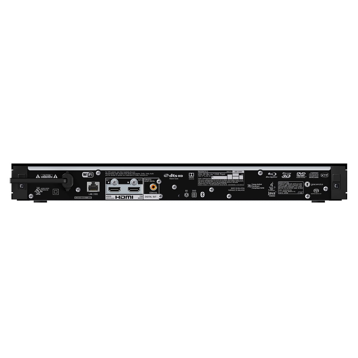 Bring home a real theater experience Get the real theater experience with this 4K Ultra HD Blu-ray Player. 4K UHD resolution gives you the big screen picture, while Dolby Atmos and DTS:X create the authentic theater atmosphere. Get closer to reality with 4K Ultra HD Blu-ray Find yourself at the heart of every movie and series. 4K Ultra HD Blu-ray shows everything in finer detail than ever before, so you feel like you’re seeing the real thing. Discover new depths of realism with 4K High Dynamic Range Go deeper into the detail with High Dynamic Range (HDR). Combined with the clarity of 4K, HDR brings previously hidden areas alive with new brightness, shades and colors. HDR10 An HDR10 signal contains up to 100x the brightness of a standard (SDR) signal, massively increasing peak brightness while retaining deep and highly-detailed blacks, for an entirely new viewing experience. HDR vs SDR HDR signals contain up to 100x the brightness of a standard (SDR) signal, massively increasing peak brightness while retaining deep and highly detailed blacks, for an entirely new viewing experience. All the colors in nature Support for the new BT.2020 color spaces means access to a much wider range of colors than conventional TV signals offer. This ultra-wide color space means content creators can deliver much more saturated and realistic color, from deep aquatic blues to natural greens and vibrant reds. DOLBY VISION Bring scenes to life with striking highlights, deeper darks, and vibrant colors. Dolby Vision is an HDR solution that creates an immersive, engaging cinematic experience in your home. Dolby Atmos Dolby Atmos treats sounds as separate objects, releasing them from typical channels to move freely around and even above you, for deeply immersive surround sound. DTS:X DTS:X can create an unlimited number of audio objects which adapt to your speakers in real time, to get the biggest impact out of every movie soundtrack. Sound that takes you to another place: Dolby Atmos and DTS:X Listen as lightning cracks, sirens wail, and car horns blare all around you in startling clarity with Dolby Atmos and DTS:X, the leading audio codecs favored by cinemas everywhere. DSEE HX Upscale the frequency and dynamic range of MP3s and other compressed music and even your CDs to near high-resolution quality, so you can get the full experience of the original recording. Get the best out of every track Like going from HD video to 4K, High-Resolution Audio tracks are far higher quality than MP3s and even CDs, letting you hear every breath, every drumbeat, every note. A match made in home theater Pair the UBP-X800M2 with the STR-DN1080 receiver for the ultimate home entertainment experience. From the stylish, coordinated design through to the enhanced picture and sound quality, the beauty’s in the detail. Sony unique chassis Our unique frame-and-beam chassis offers a rigid structure to eliminate micro-vibrations, as well as effective electrical shielding, so all you experience is the highest sound and picture quality. Play anything The UBP-X800M2’s playing power goes far beyond 4K UHD Blu-ray discs. You can watch, listen to, and stream almost anything you like ? including most High-Definition video and High-Resolution Audio formats, and a host of popular streaming services. …