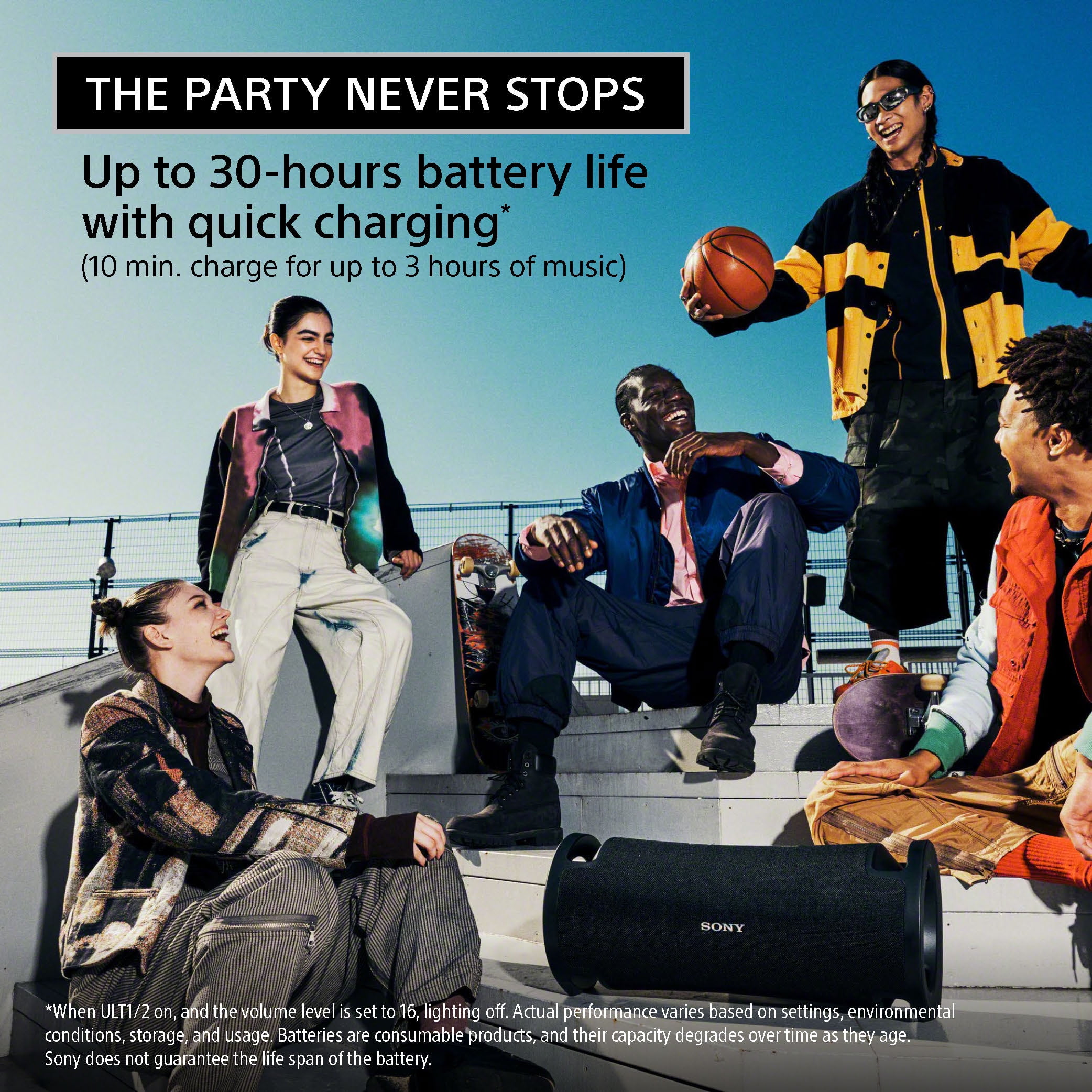 Press the ULT button to boost your bass. Powerful sound with X-Balanced Speaker Unit. Lighting to liven up your party. Take the party outside with an IP67 rating. Endless partying with up to 30 hours of battery life and quick charging. Position horizontally or vertically. Perfect karaoke partner. Inputs and setting in one place. Add an extra speaker for stereo sound. Bluetooth® Fast Pair and Multipoint connection. Link up to 100 compatible speakers to synchronize music and lighting through Party Connect. Sound Field Optimization. 7-band equalizer to adjust your sound settings.
