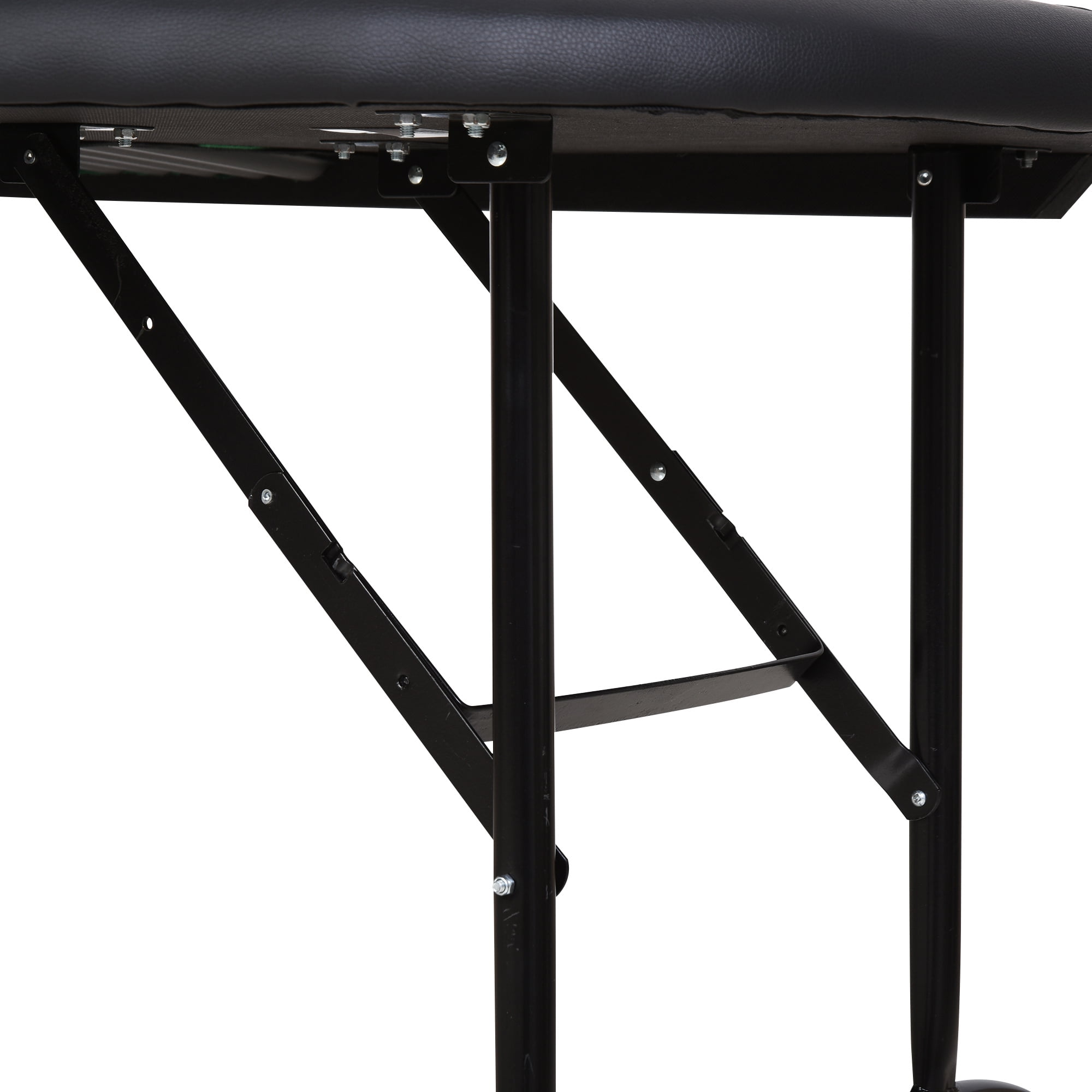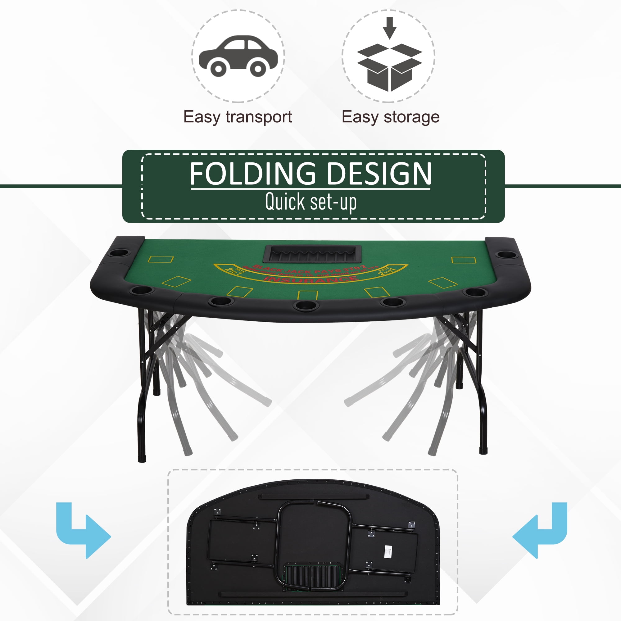 Half-Shape Foldable Poker Table: Bring the casino home with this half foldable poker and casino table. Retro meets modern design for a unique table that’s excellent for any game room. Professional Surface: The design of our game table follows the professional blackjack poker layout and rules. This card table features card placement areas and a 9-row dealer chip tray. 7 Build-in Cup Holders: Convenience without a mess, this folding poker table comes with seven plastic cup holders that provide players with a sturdy place to hold their drinks. Comfortable Padded Rails: Casino-style padded armrests let players comfortably set their arms on our foldable poker table set during a game. Portable and Compact: A simple folding design makes cleaning up and traveling a cinch. This felt table quickly folds flat for easy storage in the closet or trunk. Specifications: Color: Green Materials: MDF, Felt, Steel Unfolded Dimensions: 71.75″ L x 35.75″ W x 29.5″ H Folded Dimensions: 71.75″ L x 35.75″ W x 2.25″ H Cup Holder Diameter: 3.25″ Dia Chip Tray Dimensions: 17″ L x 8.75″ W Net Weight: 47 lbs. Weight Capacity: 66 lbs.