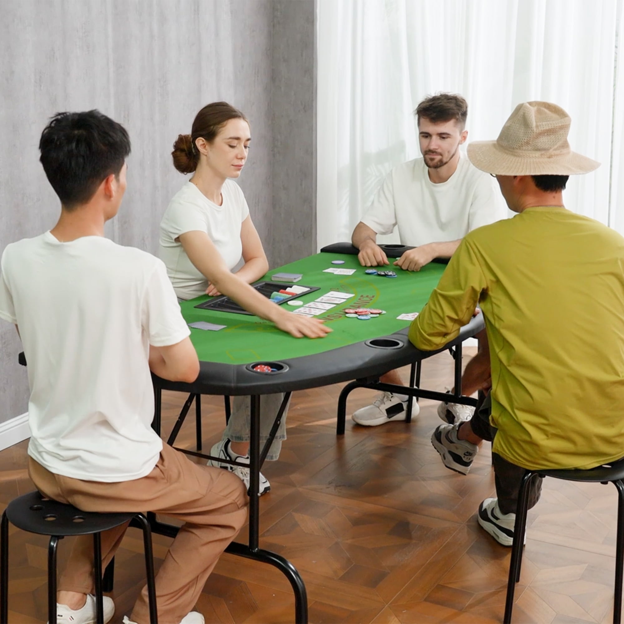 Challenge your friends to your very own exciting poker tournaments with a professional poker table from Soozier. A look and feel that showcases quality and style ensures that you and your buddies will be playing long into the night. With an extra-large design that holds 7 players comfortably, everyone can freely take part in the action with this game table. With 7 cup holders for storing drinks and padded armrest rails, the poker table set is ideal for long-lasting gaming sessions. This felt table compactly folds in half and stores easily for your traveling convenience. Recreate the Vegas experience at home or anywhere you go and have the time of your life with Soozier as your playing partner!