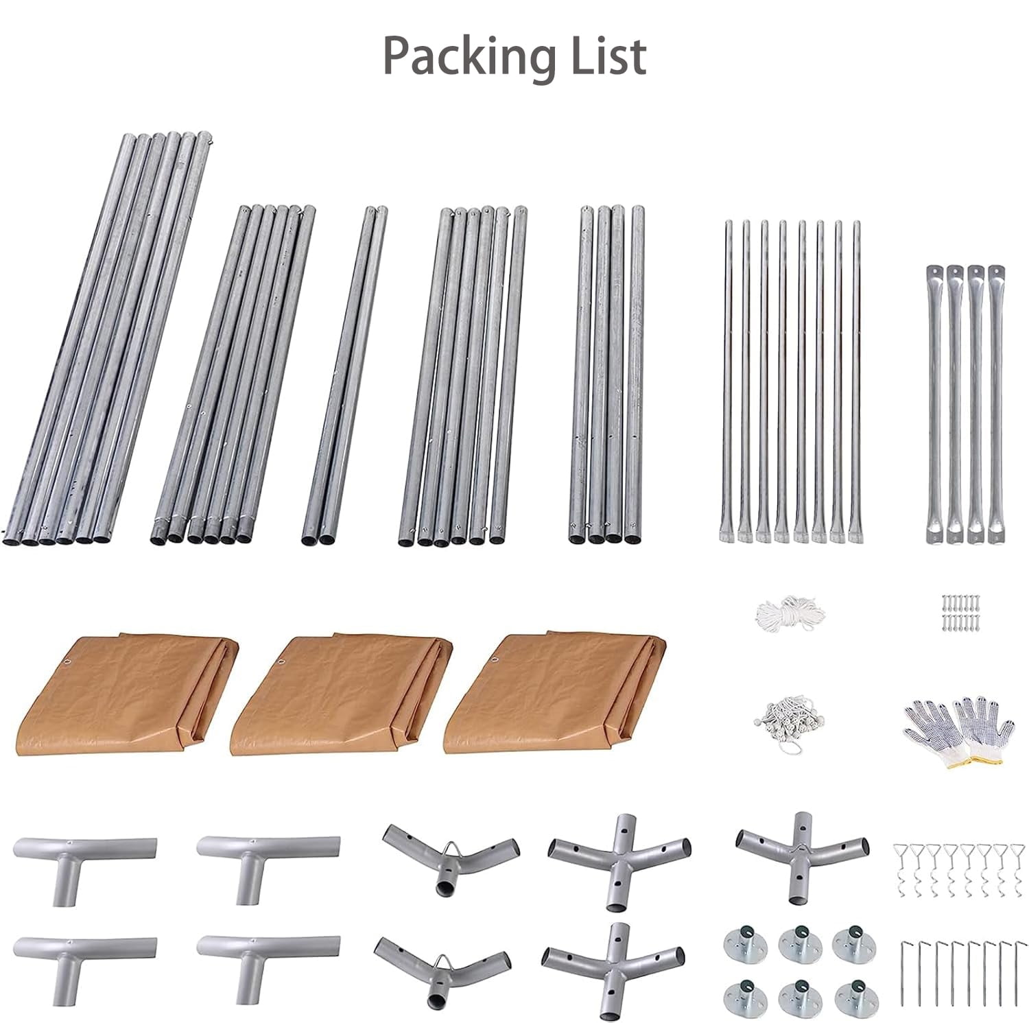 Pole Materials: 1.5Inch(38mm), Updated Rust-free Galvanized Steel Cover Materials: 180g Polyethylene, Anti-UV, Water-proof, tear-proof Top peak Height: 9.5ft Sidewall Height: 6.5ft Wide Usage: perfect for Car, Truck, Party, Wedding, Boats, Storage, Shelter, Horse Shade, Motorcycle, etc.