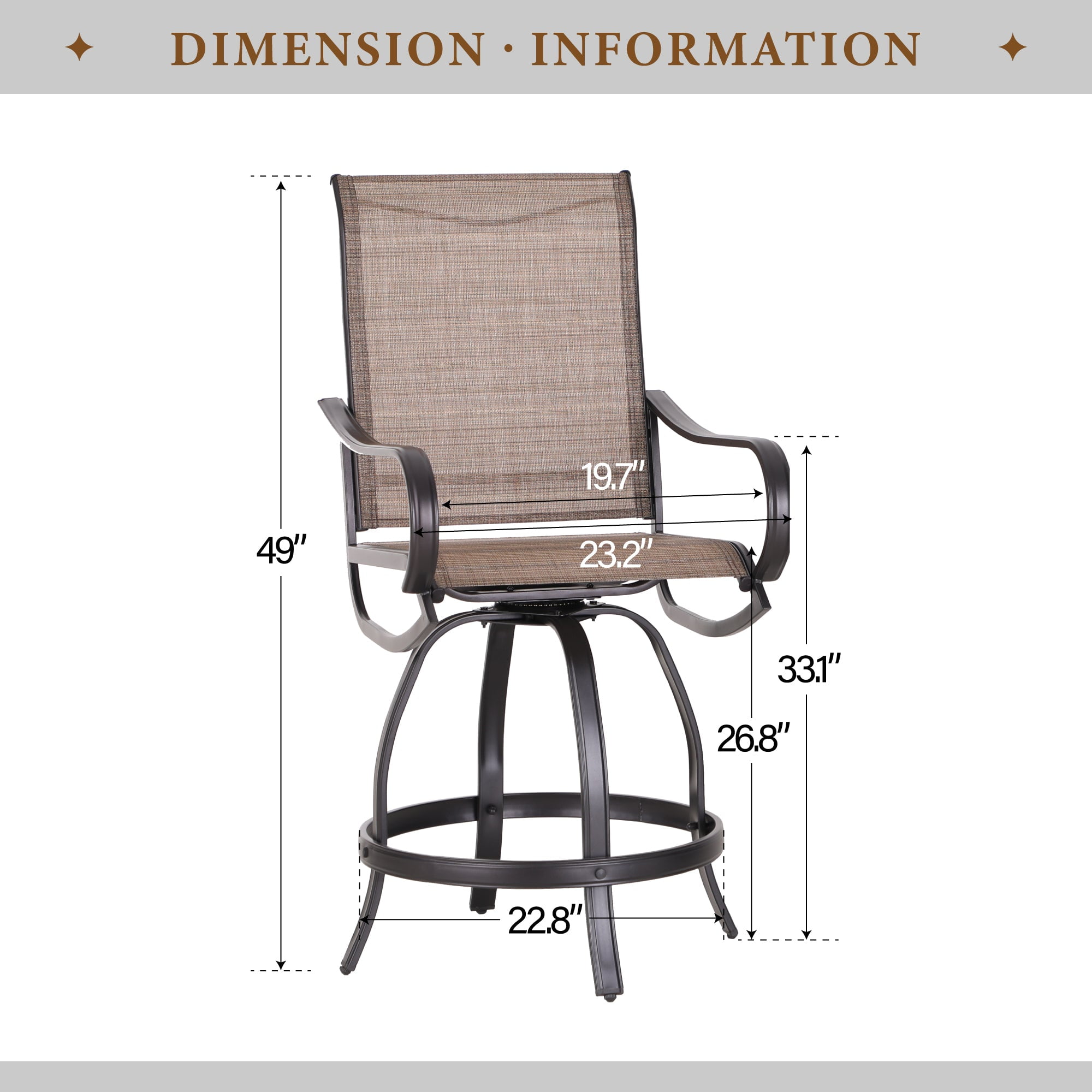 This classic designed bar stools feature a breathable textilene material and ergonomic armrests. The back design allows air ventilation, bringing a comfort level when sitting on it for long periods of time. With the 360°rotation design makes it easier for you to talk to the left or right side. Meanwhile, the foot tube gives you extra space to rest your legs. The bottom of the dining chair is equipped with adjusting screws, which can adapt to the uneven ground environment and against floor scratching.High bar stool composed of metal steel frame, which can last a long life. Perfect for Indoor, outdoor, garden, park, patio, porch, poolside and yard. Specification: Type: Outdoor Patio Swivel Bar Stools Color: Black and Brown Material: Steel/Textilene Overall Size: (L)23.2″x(W)28.2″x(H)49″ Seat Height – Floor to Seat: 26.8″ Seat Back Height: 22.2″
