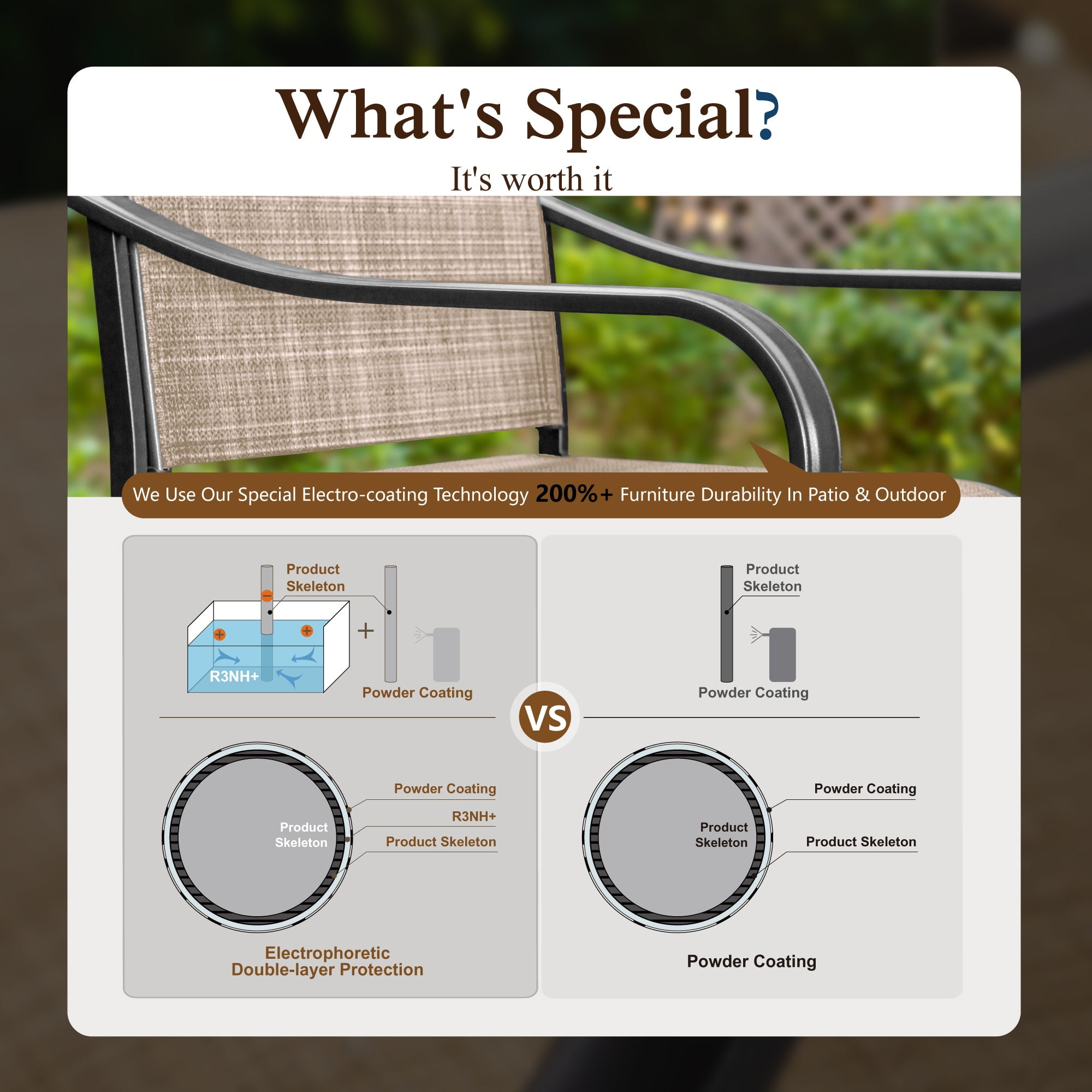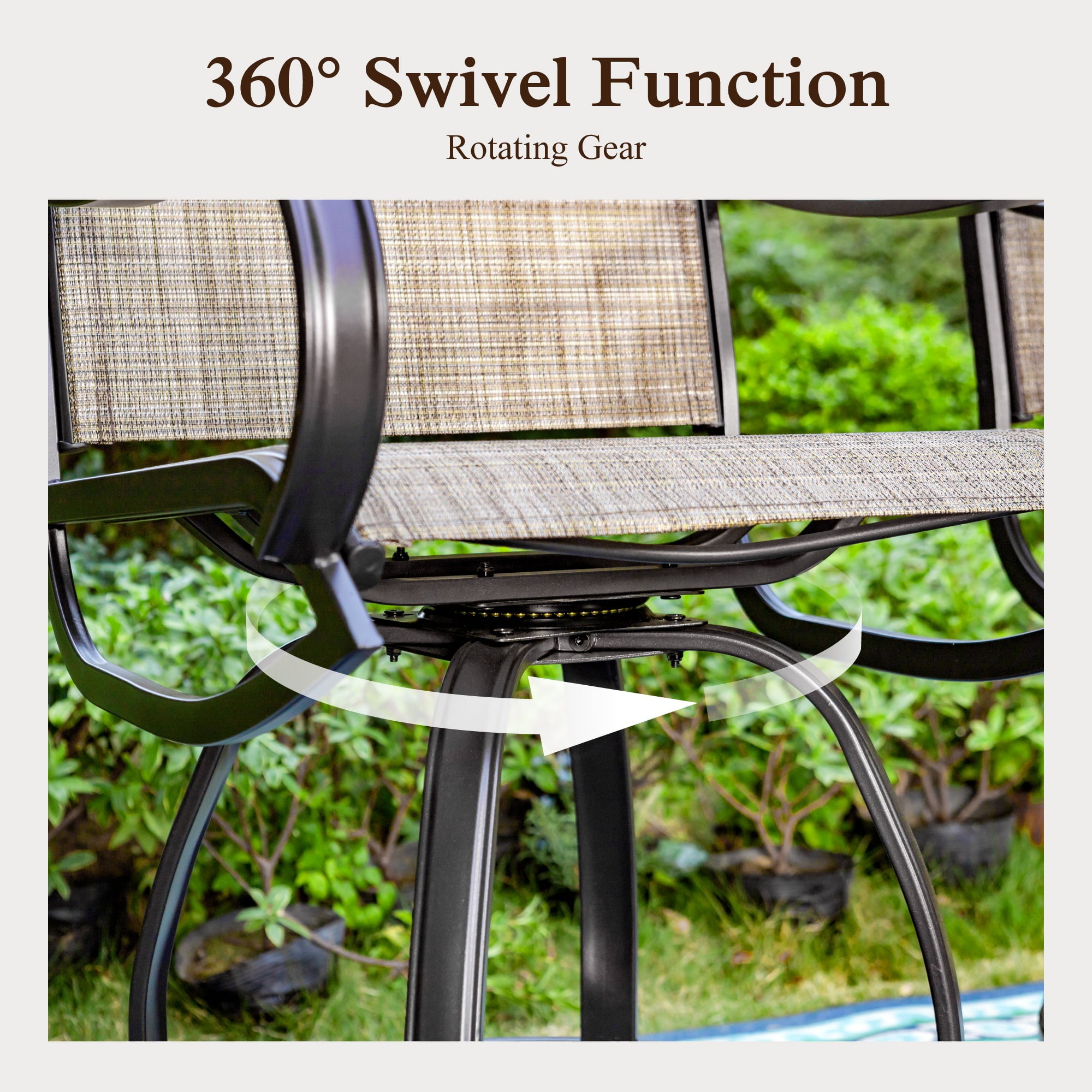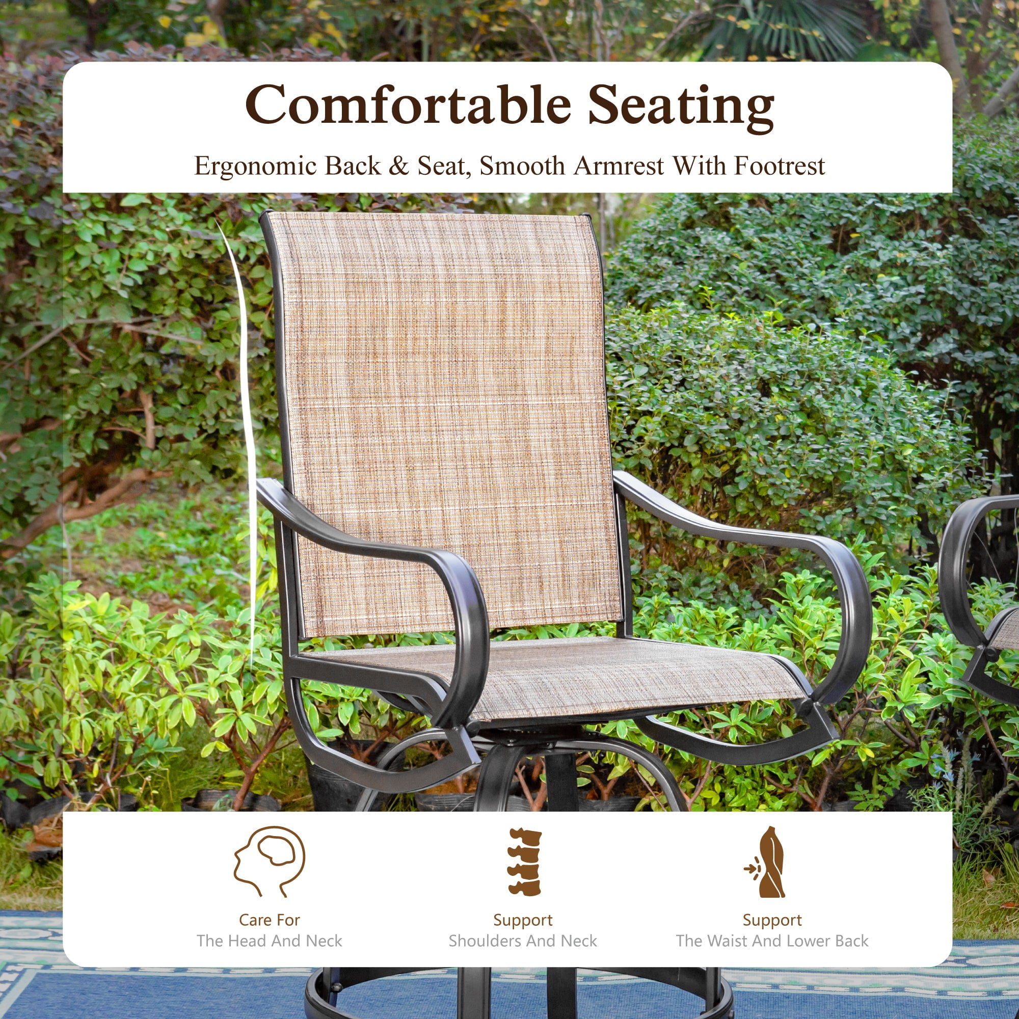 Special 360 degree swivel design with ergonomic back, this high bar stool set is convenient for you to rotate in any direction without movement Made of heavy-duty steel frame, the bar chair is weather-resistant for long-lasting use Ergonomic curved armrests design maximizes your relaxation experience Bottom adjustable feet mat ensure the steadiness of each stool The back and the seat of patio chairs are made of textilene mesh fabric which is sweat absorbing, which make you fresh and cool in summer Ideal for any outdoor space including yards, patios, gardens, porches or indoors