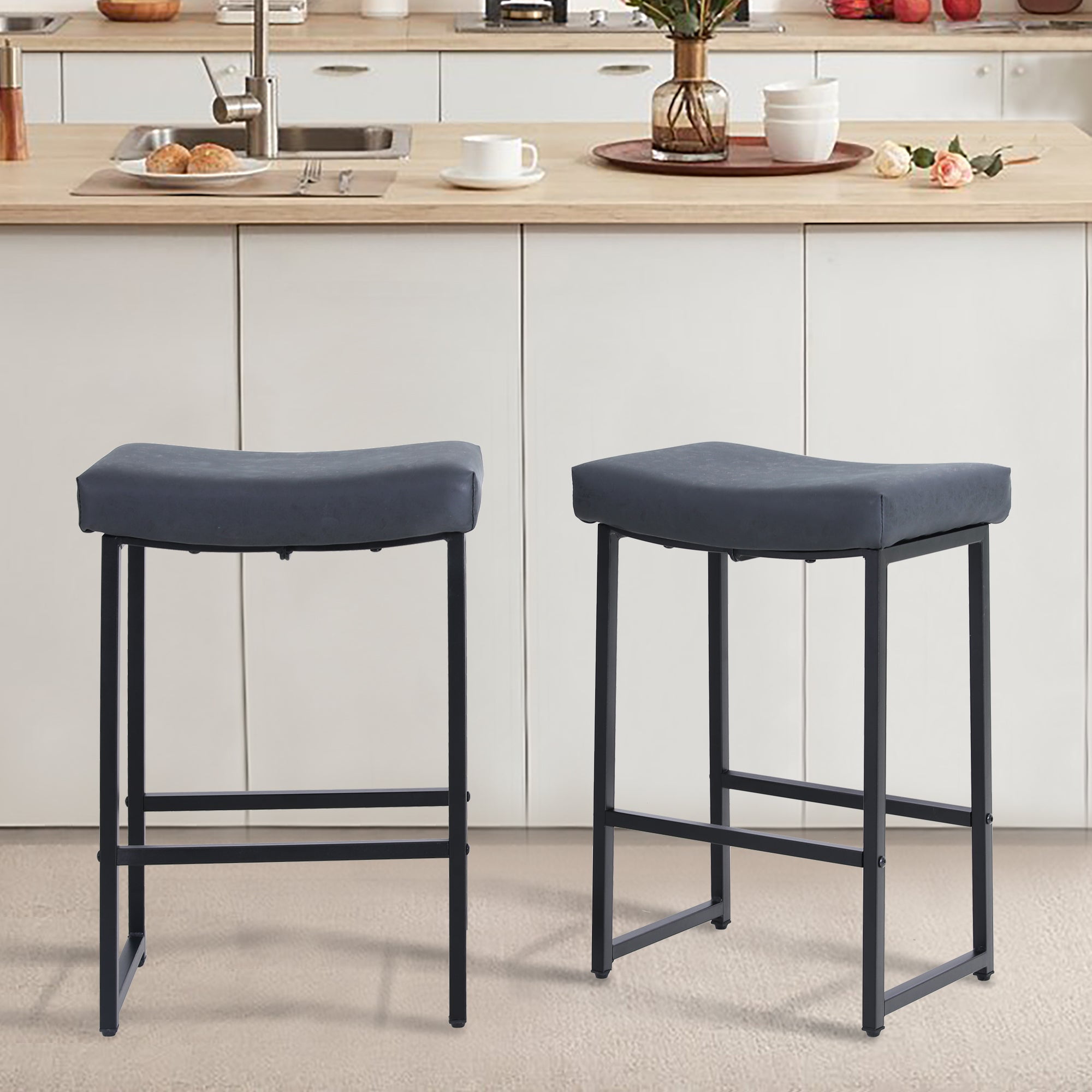 Built with metal frame with powder coating, the counter height bar stools are durable and elegant,can be used for many years. Unique rectangle seat top covered with wear-proof and water resistant pu leather. You can clean the seat top by a damp cloth or sponge. Fulfilled with high-density padded foam, the seat of this bar stool provides a super soft but well-supportive seat for people of different weight, it can supports up to 300 lbs. The footrests under the seat for releasing your feet and providing enough safety and stability.The bottom of the legs have anti-scratch pads, so you don’t have to worry about scratching the floor. The bar stools are for countertops and fit perfectly for home kitchen counter. Suitable for multiple scenes:Bar stools industrial modern design and counter height is perfect for any dining table, kitchen counter, island, or home bar. Backless barstools are properly stored and tucked under counter, saving space for your house.