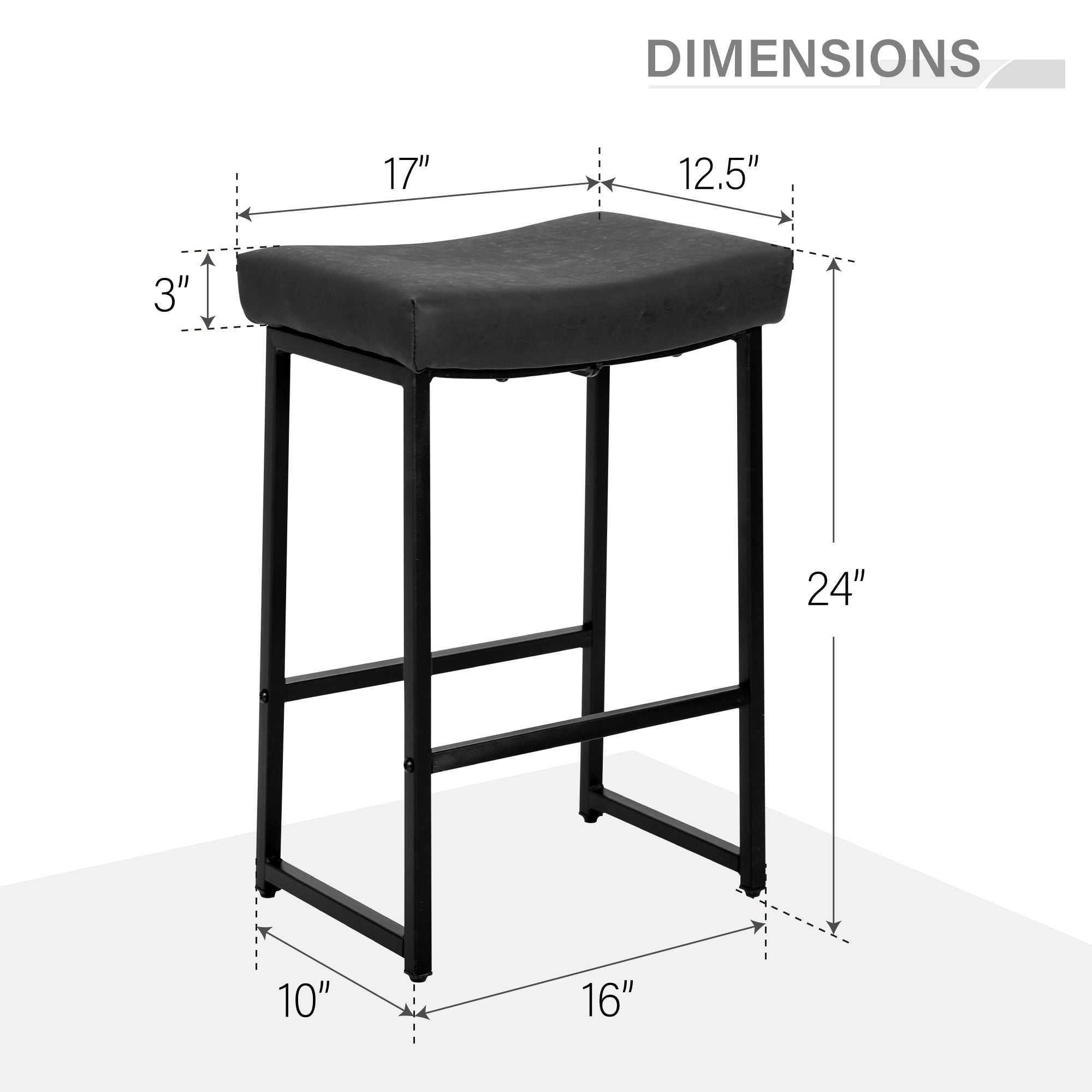 Made of solide metal frame with powder coating, these stools provide you years of durable use. Fulfilled with high-density padded foam, the seat of this bar stool provides a super soft but well-supportive seat for people of different weight,it can supports up to 300 lbs. Ergonomically saddle shape pluses feet pedals for much comfort. What’s more, these upholstered stools are pretty easy to assemble with our easy-to-follow instruction. With simple and elegant design, these stools are compatible with your home, bars, office, etc. Specifications: Color: Black Material: metal steel frame and PU leather seating Seat Width: 17″ Seat length: 12.5″ Seat Height: 24″ Package includes: 2 x Height Bar Stools