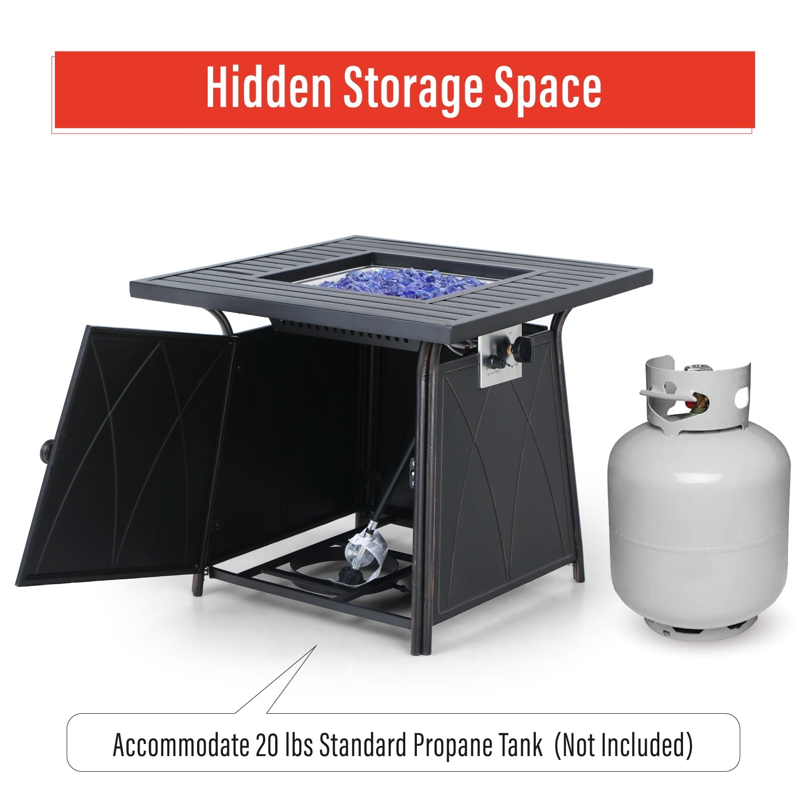 Sophia & William patio square gas fire pit table Our Fire Pit Table is perfect to fit many people around for a bonfire in the patio, yard or garden. When it is not heated ,it can be easily converted into a covered outdoor dining table, coffee table or lounge bar. 50,000BTU burner is made of stainless steel for a longer working life. Automatic ignition with pulse switch to ensure successful rapid ignition every time. The fire pit table uses the liquid propane fuel, which can provide the stable and clean combustion, so there is not any ash or smoke to plague you or pollute environment. The flame is adjustable, you can find the most comfortable temperature and warm environment in any season and at any time.The ignition device is combined with anti-rust stainless steel basin bottom for longer life. When not burning, it can be easily converted into an outdoor dining table, coffee table, or casual bar. Package Included: 1 x outdoor square fire table with removable lid Blue fire glass (11lbs) + Instruction & all screw, wrench allen