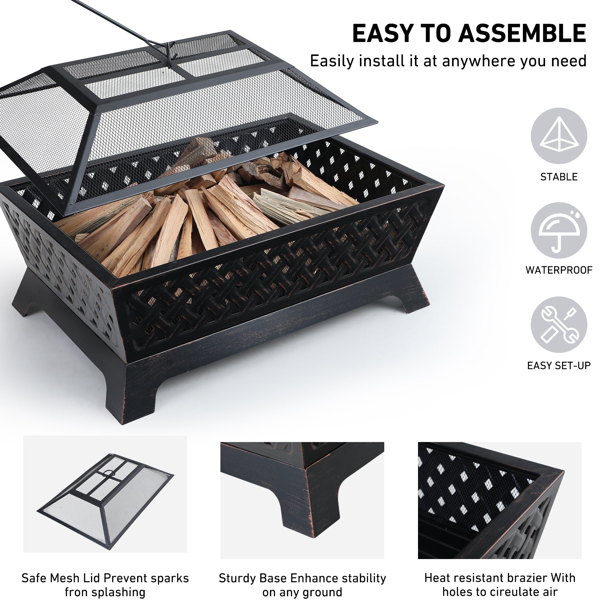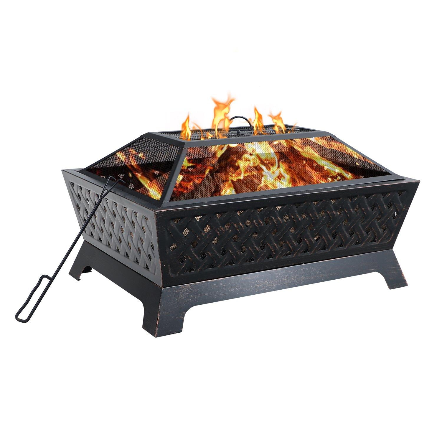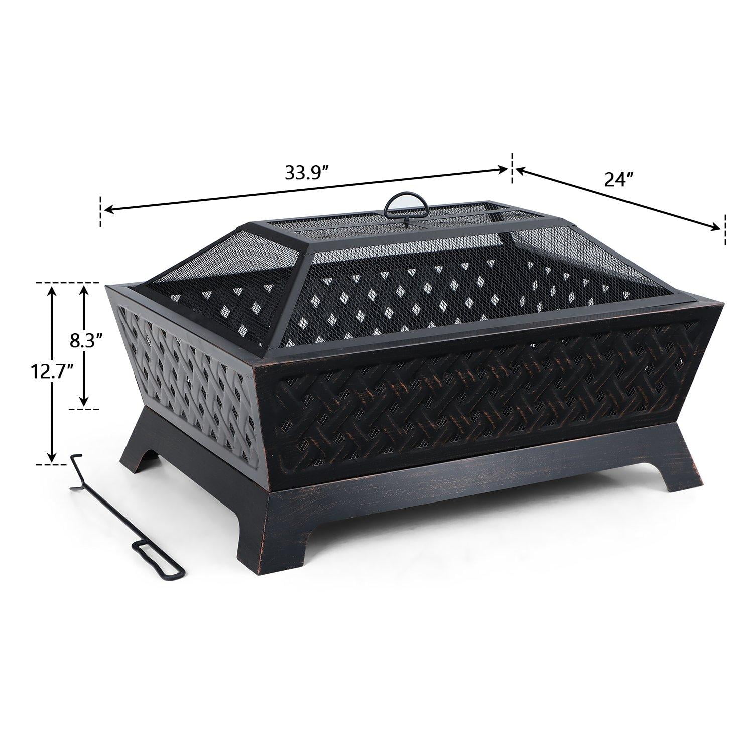 Overall Size L 33.9″ x W 24″ x H 12.7″, 12.7″ Height Deep Steel Bowl Large, deep steel bowl accommodates large fires for added warmth and convenience Made of heavy-duty iron with finished high temp bronze paint. Durable iron construction makes this fire pit a long-lasting outdoor heating solution 4 metal legs ensure its stable structure and strong weight capacity The poker helps you remove the spark screen and move logs more easily The bottom of the fire pit has a water leakage hole and a firewood rack design, which can better protect the bottom and play a role in ventilation when a fire is burning Mesh cover encloses the fire for safety as well as preventing sparks or debris. It comes with a poker for you to lift and set the mesh lid Grid Screen not only makes the fire inside visible and attractive, but also lets airflow and heat flow circulate to provide continuous warmth and comfort Suitable for Any Occasion: backyard, outdoor entertaining, bonfire pit, RV trip, camping, tailgating, beach, party, BBQ, relaxing, chilly evenings