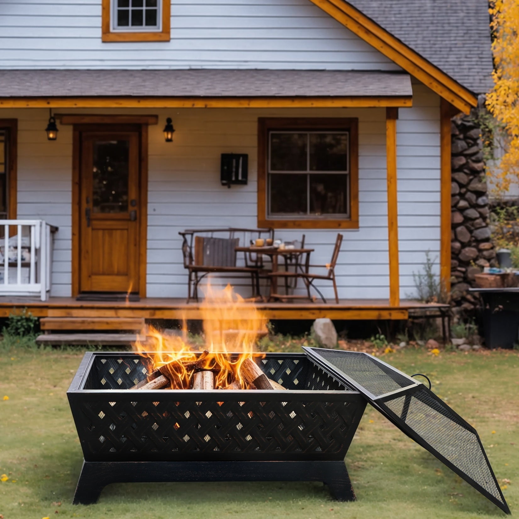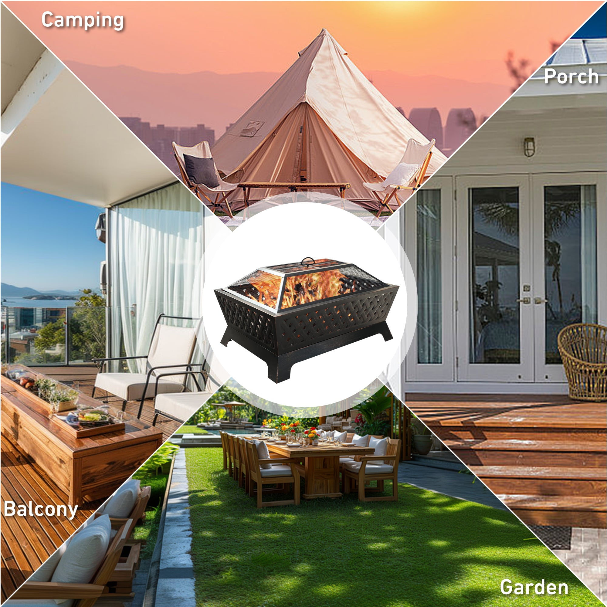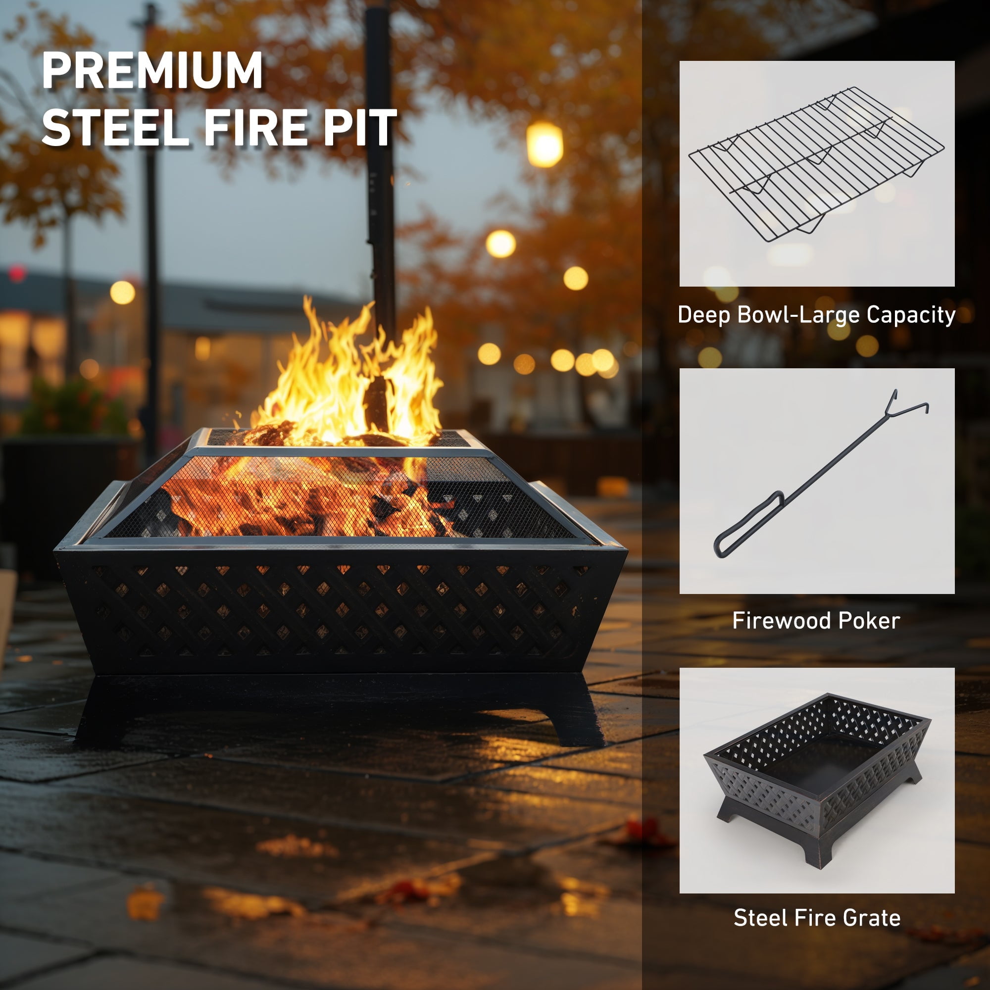 Overall Size L 33.9″ x W 24″ x H 12.7″, 12.7″ Height Deep Steel Bowl Large, deep steel bowl accommodates large fires for added warmth and convenience Made of heavy-duty iron with finished high temp bronze paint. Durable iron construction makes this fire pit a long-lasting outdoor heating solution 4 metal legs ensure its stable structure and strong weight capacity The poker helps you remove the spark screen and move logs more easily The bottom of the fire pit has a water leakage hole and a firewood rack design, which can better protect the bottom and play a role in ventilation when a fire is burning Mesh cover encloses the fire for safety as well as preventing sparks or debris. It comes with a poker for you to lift and set the mesh lid Grid Screen not only makes the fire inside visible and attractive, but also lets airflow and heat flow circulate to provide continuous warmth and comfort Suitable for Any Occasion: backyard, outdoor entertaining, bonfire pit, RV trip, camping, tailgating, beach, party, BBQ, relaxing, chilly evenings