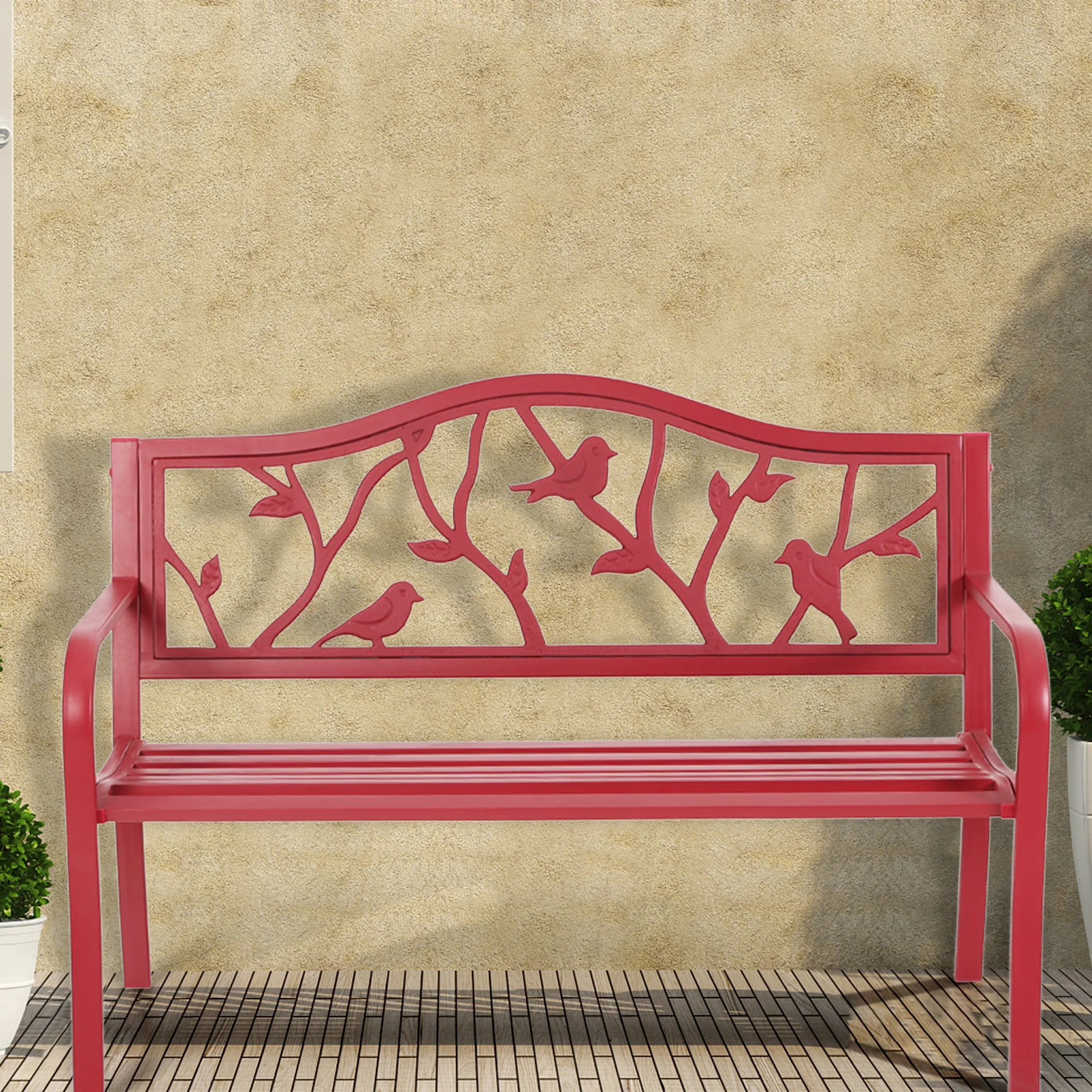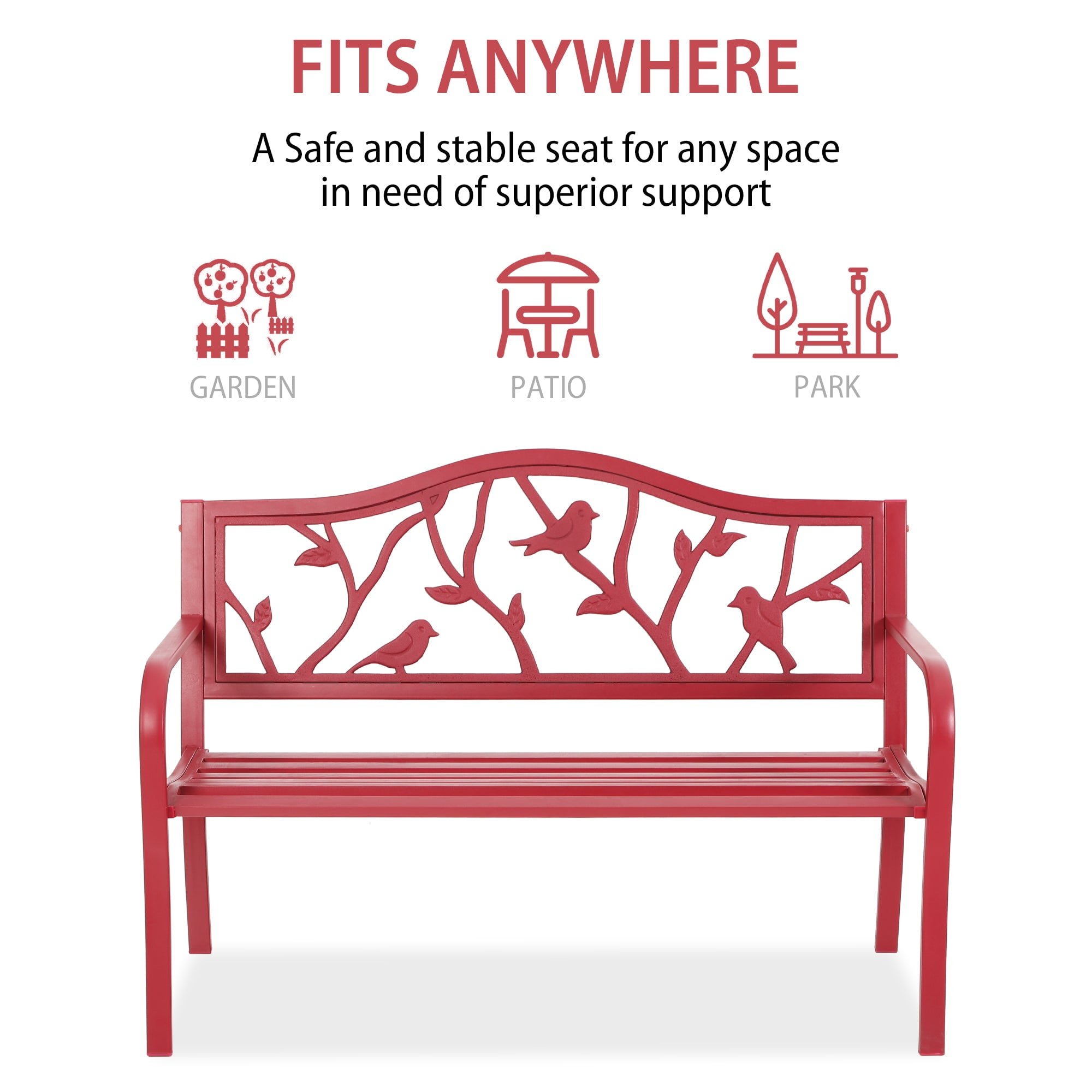 This red bird garden bench is made of 100% heavy duty metal with rust-resistant e-coating, UV resistant and sun-proof. Lovely red-bird pattern will add elegance to your front or backyard, which will be a great addition to garden or make a completion for your path. Assembled size is 50.40″L x 24″W x 35″H, allows 2-3 people to sit, wider and stronger armrests and backrest design makes you feel more comfortable. Load capacity: 600+ lbs. This garden bench is very simple to assemble, comes with the all hardware accessories and instruction manual. The patio bench needs no complicate maintenance and can be placed outdoor for a long time, it’s smooth surface is easy to clean with a damp cloth. Bench can be enjoyed while reading a book, drinking coffee, or simply conversing with family and friends for any garden, backyard, entryway, or sun room. Specifications Dimension: W 50.39″” x D 23.5″” x H 35″” Weight: 30.86 lbs Material: Steel frame Color: red Max loading weight: 600 lbs Seat size for: 2-3 adult people
