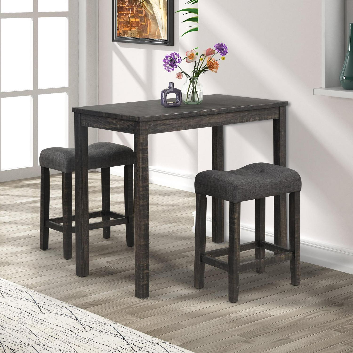– The counter height dining set includes a table and two matching stools. Available in gray and taupe finish