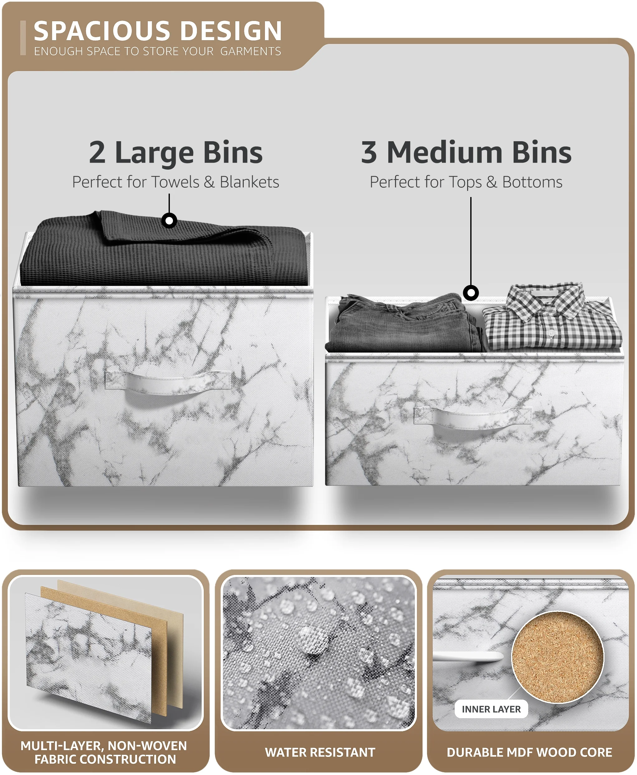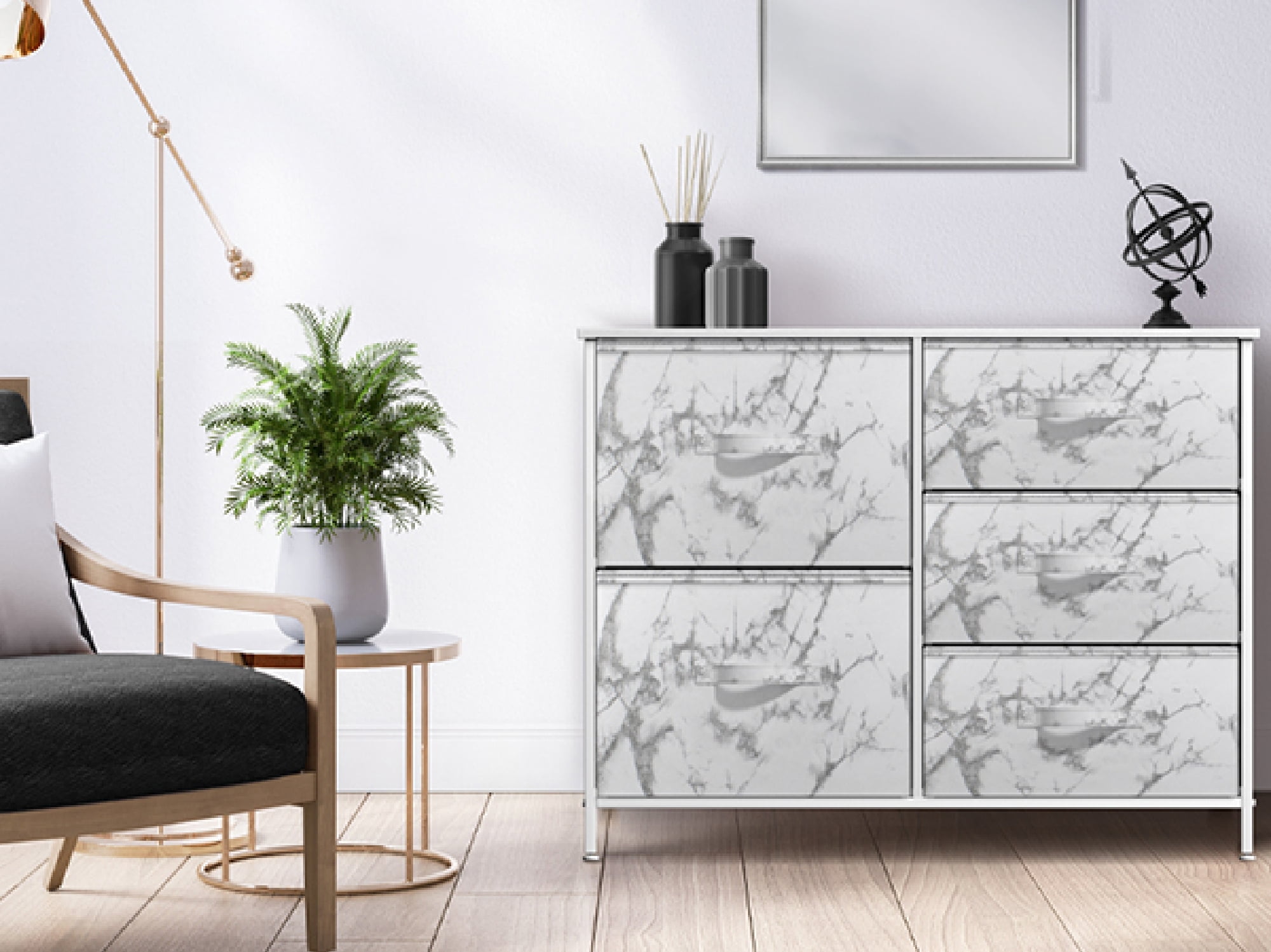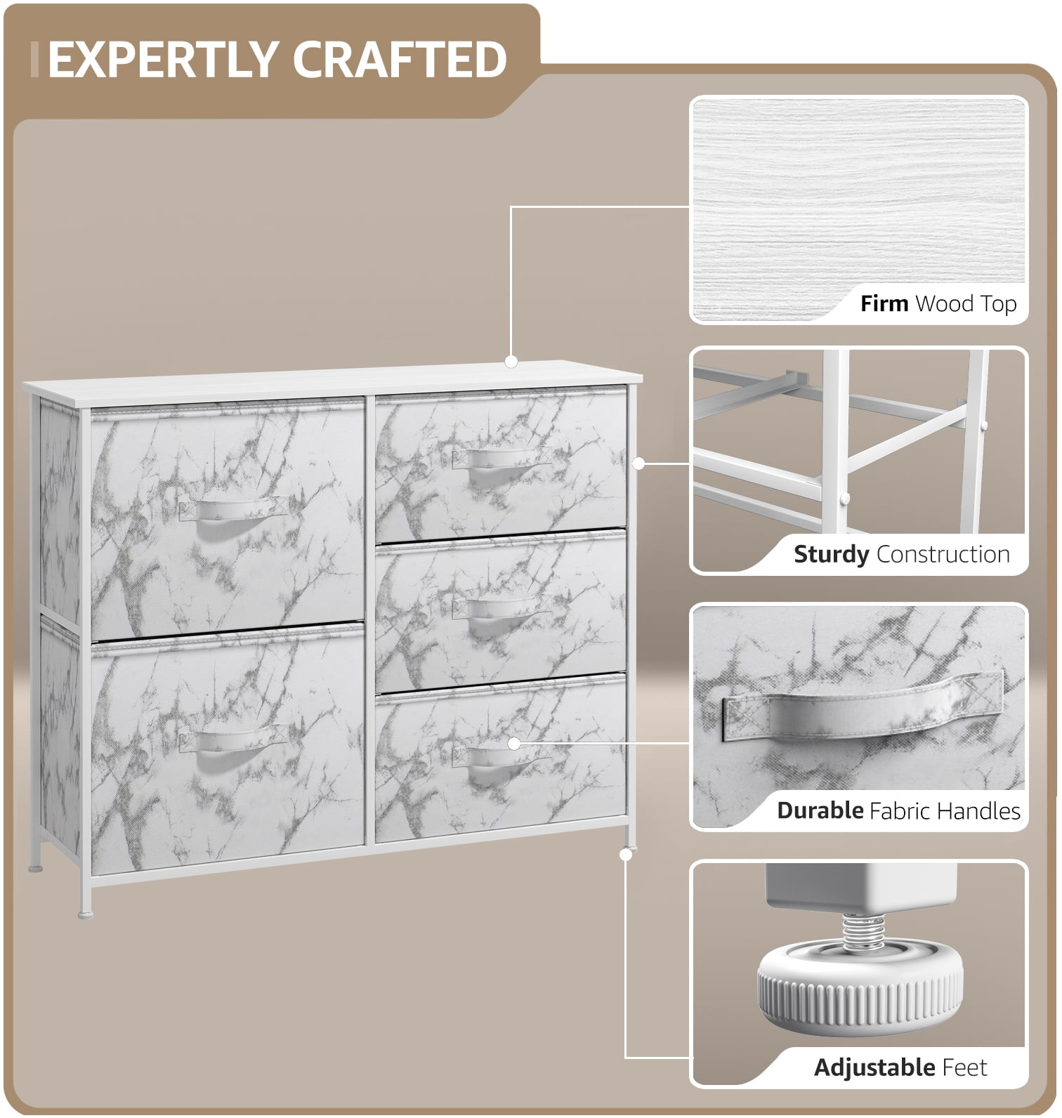 Sorbus 5-Drawer Dresser: Chest Organizer, Steel Frame, Wood Top, Marble/White Fabric Bins