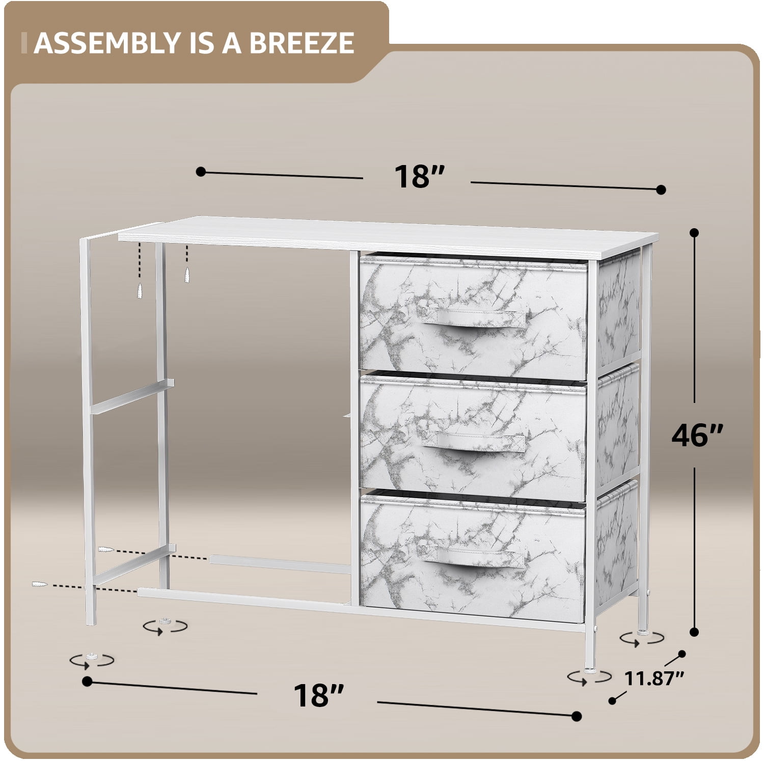 5-DRAWER DRESSER (White- White Marble) Style meets function with this dresser chest, complete with a wood surface and colorful storage drawers Pairs beautifully with the Sorbus Foldable Furniture Collection (sold separately) DISPLAY & DE-CLUTTER Wood top provides hard surface for displaying books, lamps, alarm clocks, electronics, and more Drawers great for storing baby and kid clothes, blankets, linens, toys, plushies, accessories, knitting supplies, and household clutter KID FRIENDLY DESIGN Sleek wide storage Made with strong steel frame and durable MDF wood top with smooth white finish Drawers made of breathable, non-woven fabric Pastel colors in peach, teal, purple, yellow, aqua Wipe clean Minimal assembly required Hardware and instructions INCLUDED Measures approximately 33.50†L x 11.87†W x 27.55†H