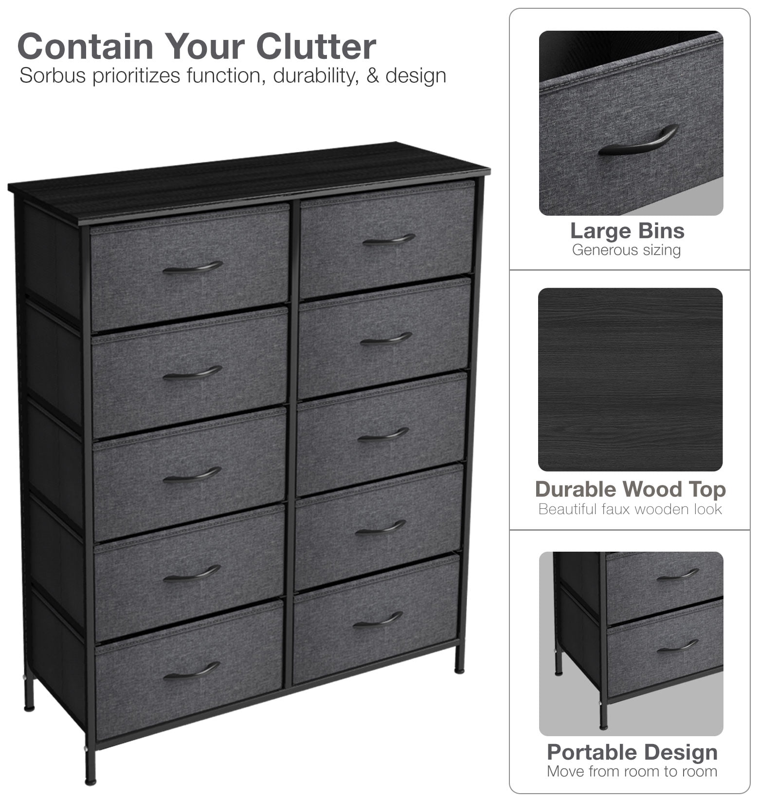Keep your household clutter neatly tucked away in the Sorbus Portable & Tall 10-Drawer Fabric Dresser for Clothes. The lightweight design allows for effortless transport and reorganization. This chest of drawers features removable fabric drawer shelves that are great for storing clothing, toys, accessories, and any other items that are making a mess. Place this Sorbus dresser in a closet, next to your bed, use it as a tv stand, or add storage to a home office; the opportunities for organization are endless. When not in use, the fabric drawers can fold flat. For added convenience, these drawers wipe clean. This dresser is the perfect blend of rustic and modern design, featuring faux wooden fabric cubbies and contemporary black accessories. Getting organized has never looked better!