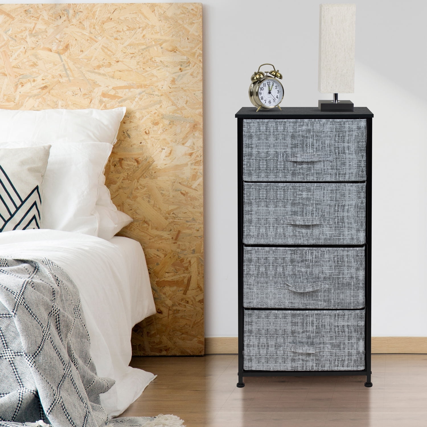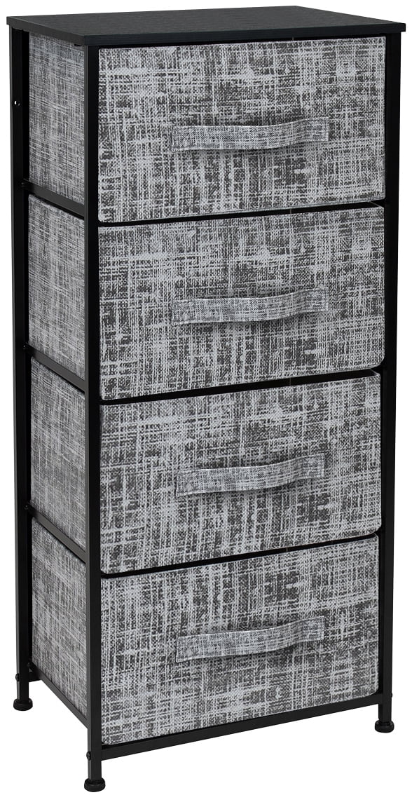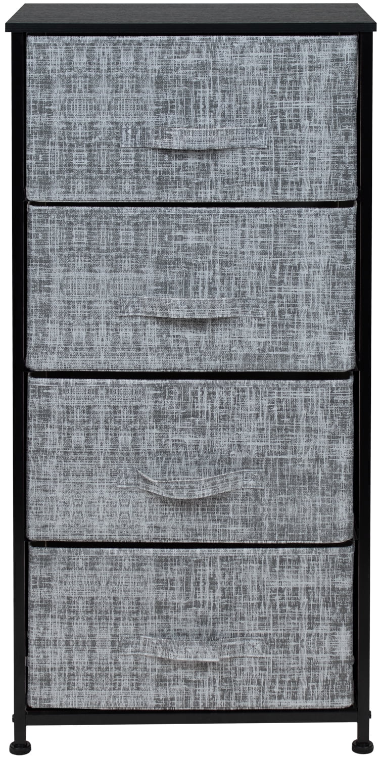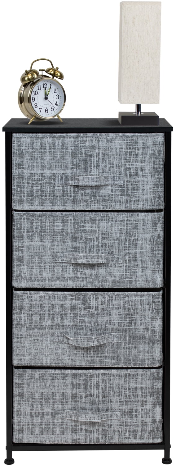 Give your bedside essentials a cozy landing spot with the Sorbus 4-Drawer Nightstand. This beautiful chest features a tabletop surface and pull-out drawers to tuck away household clutter. The thoughtful design is compact for small living spaces and works equally well by the bed or sofa. Store anything from books, reading glasses, alarm clocks, and other bedside necessities. The lightweight frame makes this unit easy to transport around the home and when not in use, simply fold the fabric drawers flat for storage. Use alone as a single nightstand or pair with any drawer configuration from the Sorbus Furniture Collection. With everything you need right by your side, getting organized has never looked better! Great for any room. Choose this charming chest for a touch of function and understated appeal. Set it in your master suite or guest room as a side bed table for devices, magazines, fresh flowers, and more. In the nursery, the drawers help organize story books while the nightstand is the ideal height for a reading lamp. As a living room accent table, this unit provides sufficient space for remotes, coasters, and drinks, perfect for a movie night in or entertaining guests during the big game! About the design. 4-drawer nightstand with gray textured print. Lightweight and easy to assemble. Hardware and instructions INCLUDED. Drawers made of non-woven fabric. Made of steel and MDF wood with black finish. Accessories shown in image NOT INCLUDED. Measures approximately 17.75” L x 11.87” W x 37.50” H