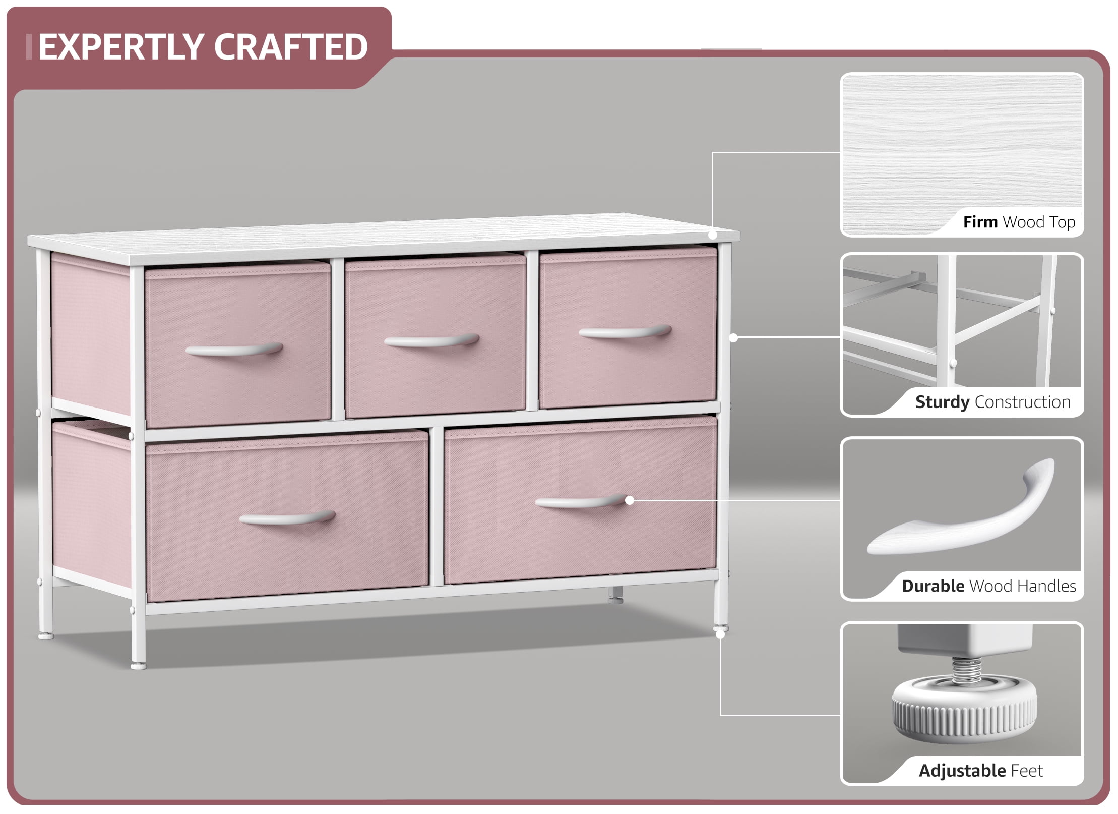 5-DRAWER DRESSER — Style meets function with this dresser chest, complete with a wood surface and colorful storage drawers — Pairs beautifully with the Sorbus Foldable Furniture Collection DISPLAY & DE-CLUTTER — Wood top provides hard surface for displaying books, lamps, alarm clocks, electronics, and more — Drawers great for storing baby and kid clothes, blankets, linens, toys, plushies, accessories, knitting supplies, and household clutter KID FRIENDLY DESIGN Sleek wide storage Made with strong steel frame and durable MDF wood top with smooth white finish Pastel color fabric drawers made of non-woven fabric Wipe clean Minimal assembly required Hardware and instructions INCLUDED Measures approximately 39.50″ L x 11.87″ W x 24.62″ H