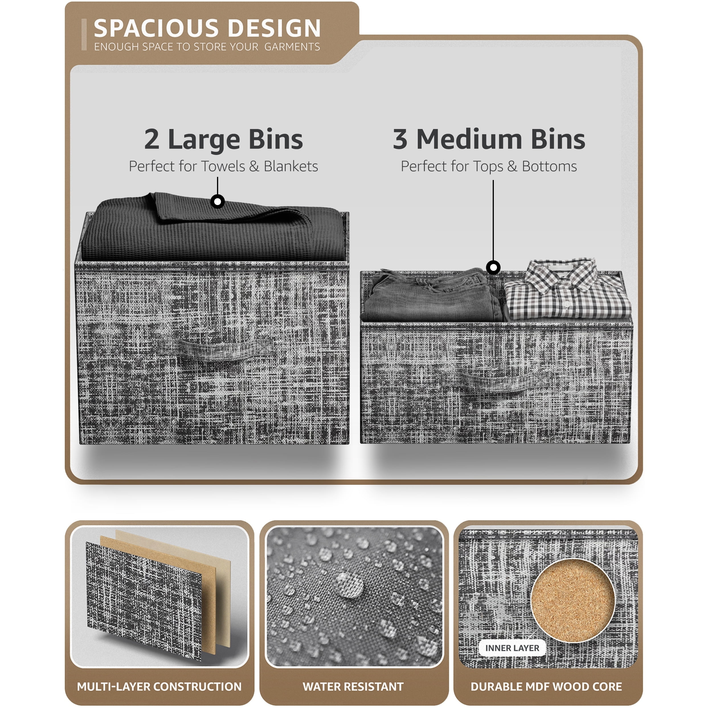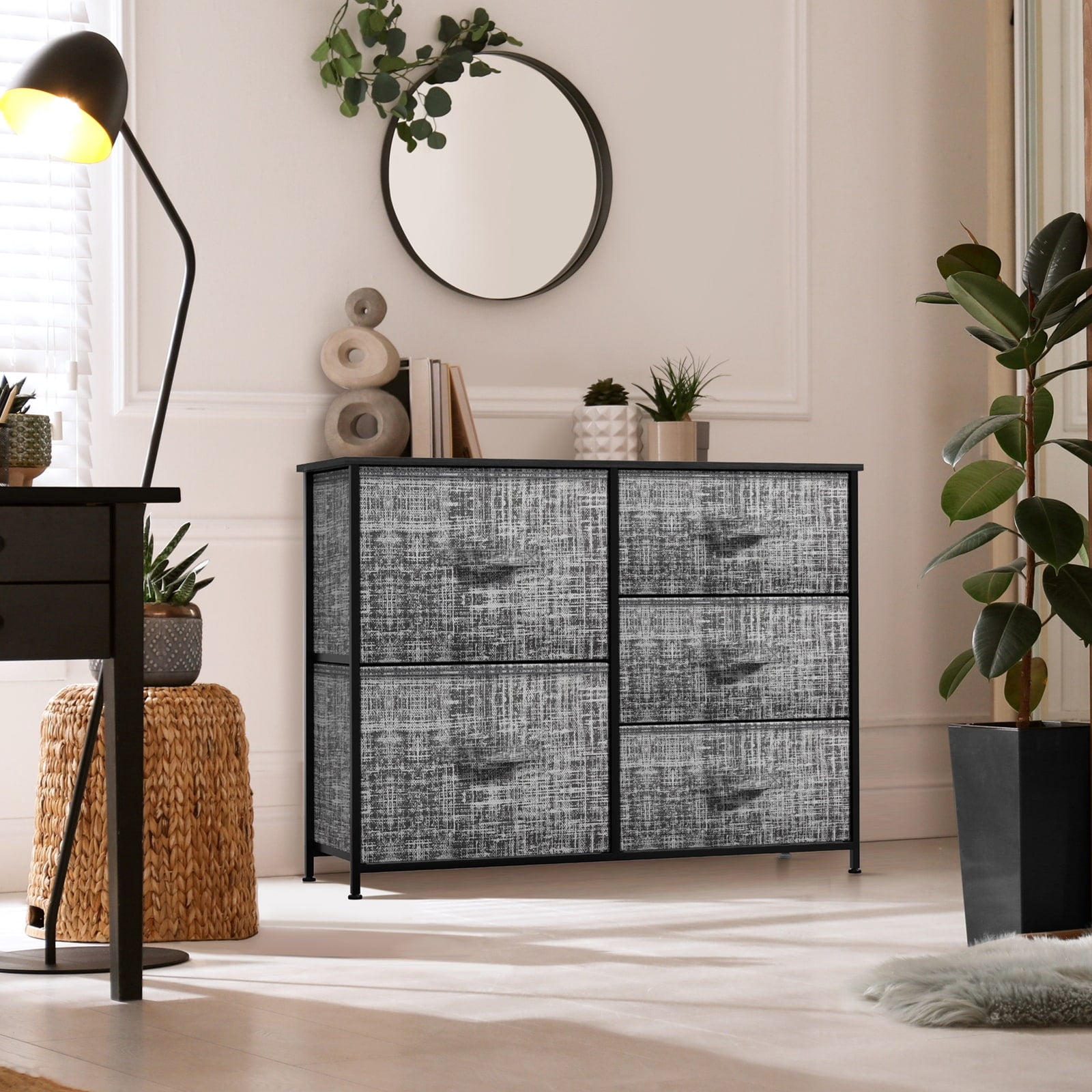 Give your bedside essentials a cozy landing spot with the Sorbus 5-Drawer Dresser. This beautiful chest features a tabletop surface and pull-out drawers to tuck away household clutter. The thoughtful design is compact for small living spaces and works equally well by the bed or sofa. Store anything from books, reading glasses, alarm clocks, and other bedside necessities. The lightweight frame makes this unit easy to transport around the home and when not in use, simply fold the fabric drawers flat for storage. Use alone as a single unit or pair with any drawer configuration from the Sorbus Furniture Collection. With everything you need right by your side, getting organized has never looked better! Great for any room. Choose this charming chest for a touch of function and understated appeal. Set it in your master suite or guest room as a side bed table for devices, magazines, fresh flowers, and more. In the nursery, the drawers help organize story books while the nightstand is the ideal height for a reading lamp. As a living room accent table, this unit provides sufficient space for remotes, coasters, and drinks, perfect for a movie night in or entertaining guests during the big game! About the design. 5-drawer dresser with gray textured print. Lightweight and easy to assemble. Hardware and instructions INCLUDED. Drawers made of non-woven fabric. Made of steel and MDF wood with black finish. Accessories shown in image NOT INCLUDED. Measures approximately 33.50” L x 11.87” W x 27.55” H.