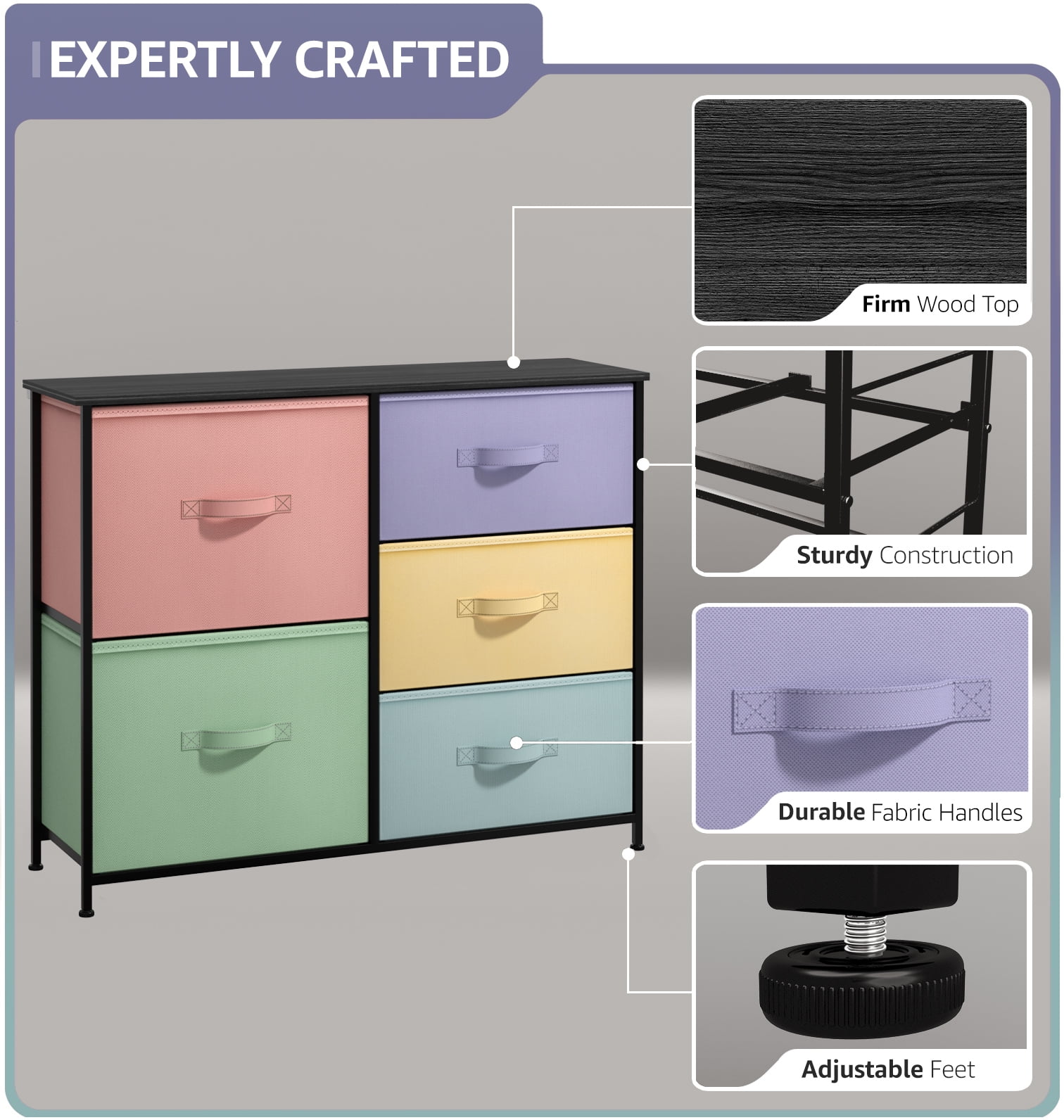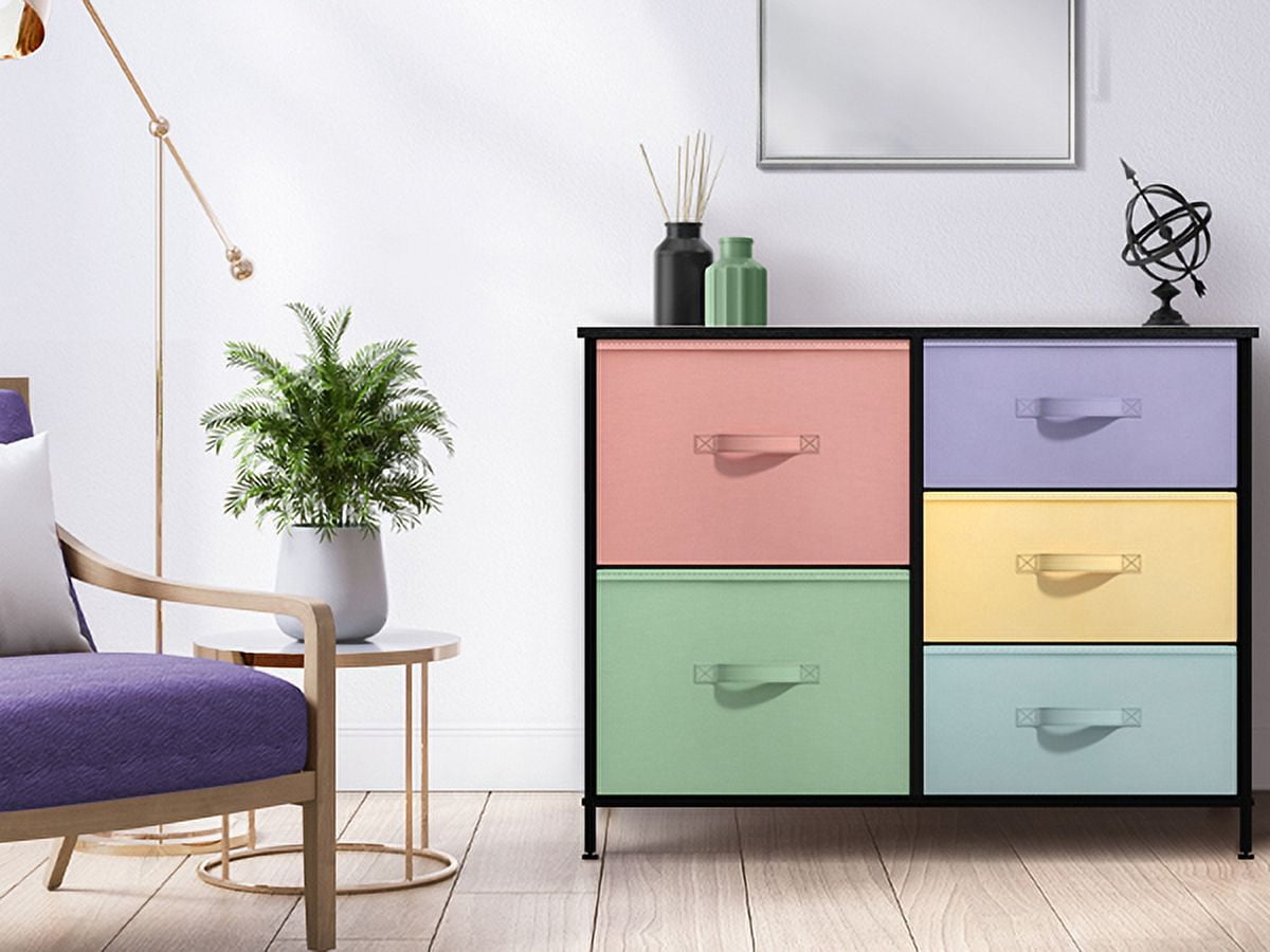 5-DRAWER DRESSER (PASTEL/BLACK) — Style meets function with this dresser chest, complete with a wood surface and colorful storage drawers — Pairs beautifully with the Sorbus Foldable Furniture Collection (sold separately) DISPLAY & DE-CLUTTER — Wood top provides hard surface for displaying books, lamps, alarm clocks, electronics, and more — Drawers great for storing baby and kid clothes, blankets, linens, toys, plushies, accessories, knitting supplies, and household clutter STYLISH FOR ANY ROOM — Suitable for nursery, playroom, kids’, tween, teens bedroom, guest room, closet, hallway, college dorm, small apartment solutions, etc — Versatile as dressers for bedroom, storage cube dresser, 5 drawer dresser, small closet dresser, storage chest, living room dresser, sofa end tables, office supply storage, kids nightstand, or baby nursery table FOLDABLE DRAWERS — Soft fabric drawers with reinforced base — Easy pull handle for quiet opening and closing — Removable drawers fold flat for easy storage when not in use — Entire unit is portable, lightweight, and easy to relocate — Large drawer approx. 11” deep — Medium drawer approx. 7.50” dee KID FRIENDLY DESIGN — Sleek wide storage — Made with strong steel frame and durable MDF wood top with smooth black finish — Drawers made of breathable, non-woven fabric — Pastel colors in peach, teal, purple, yellow, aqua — Wipe clean — Minimal assembly required — Hardware and instructions INCLUDED — Measures approximately 33.50” L x 11.87” W x 27.55” H