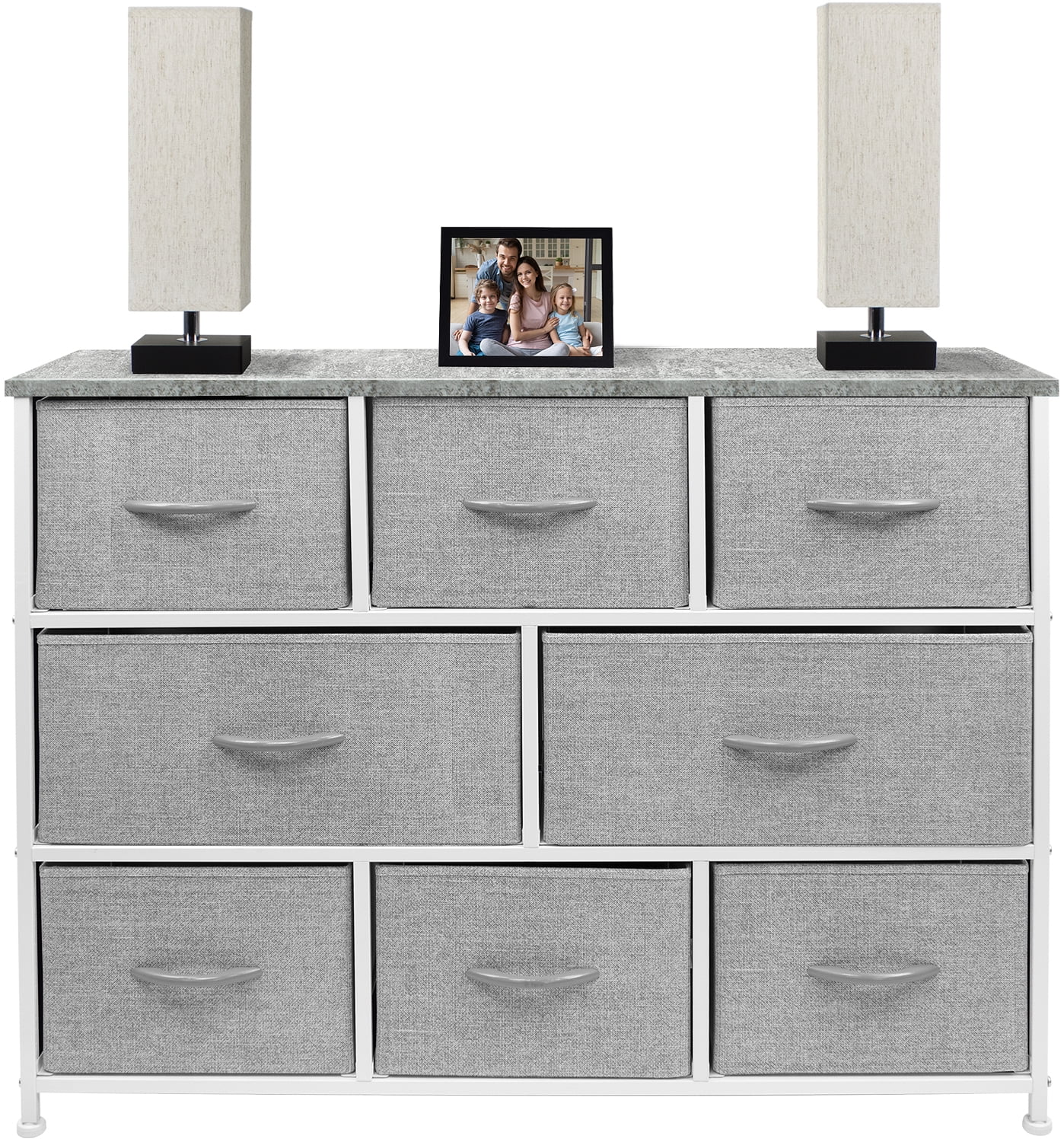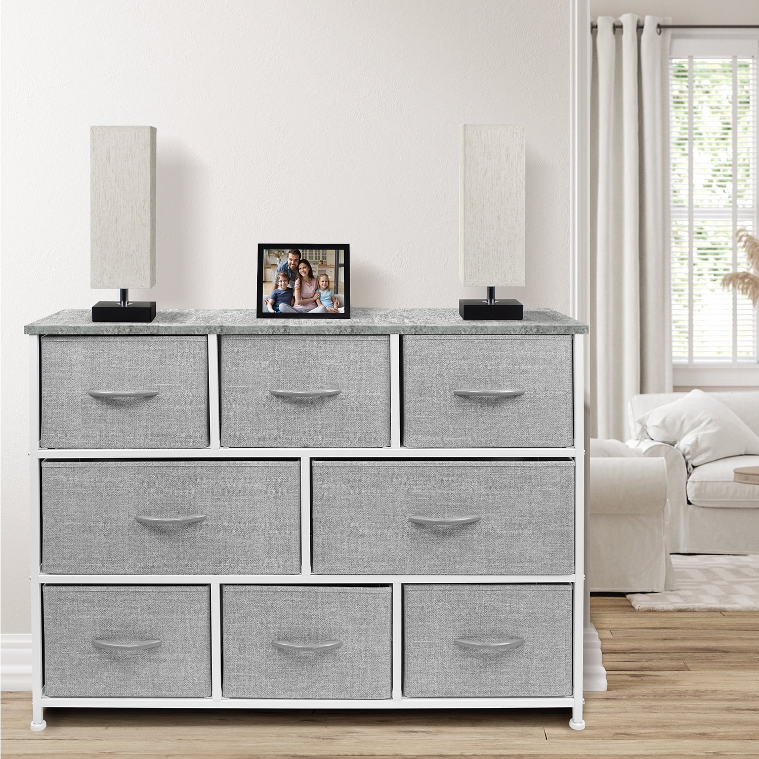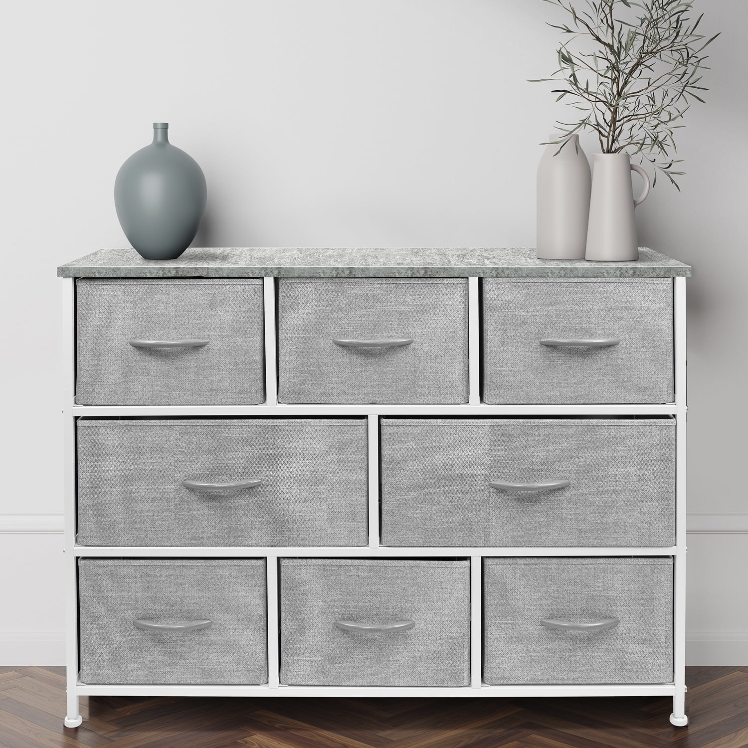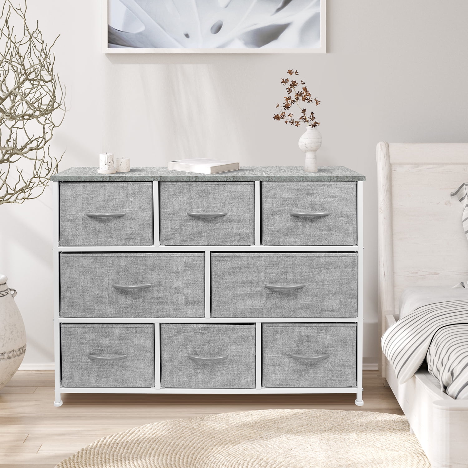 Versatile storage: Store and organize clothes, toys, linens, and more in the Sorbus 8 Drawer Dresser. Durable and portable: This dresser features a strong steel frame, MDF wood top, and easy-clean fabric drawers. Its lightweight design makes it easy to move around. Modern style: The sleek design complements many décor styles and is suitable for various rooms. Spacious drawers: Each drawer measures 8 inches deep and features a reinforced base for easy use. Easy assembly: No tools required! The dresser comes with hardware and instructions for quick assembly.