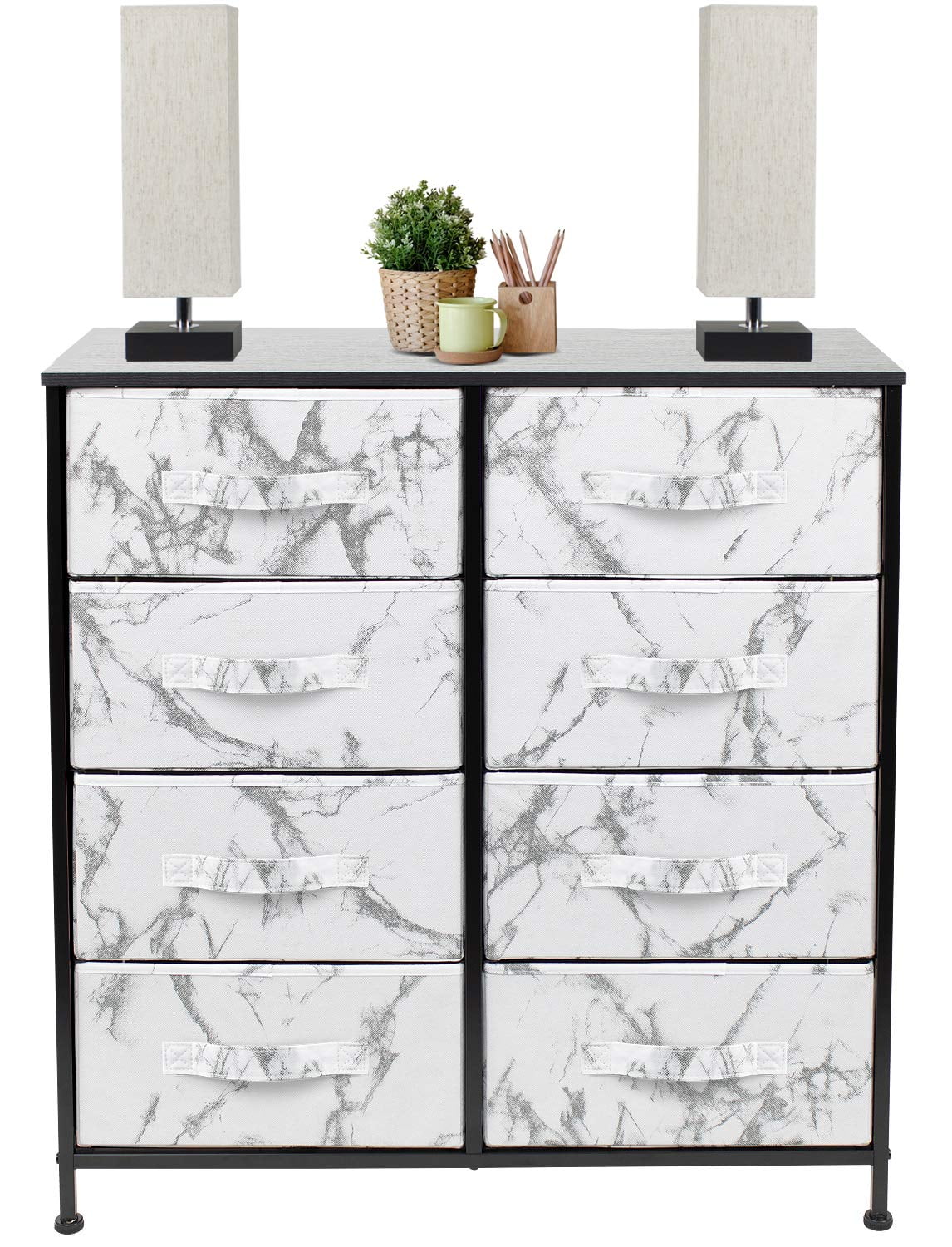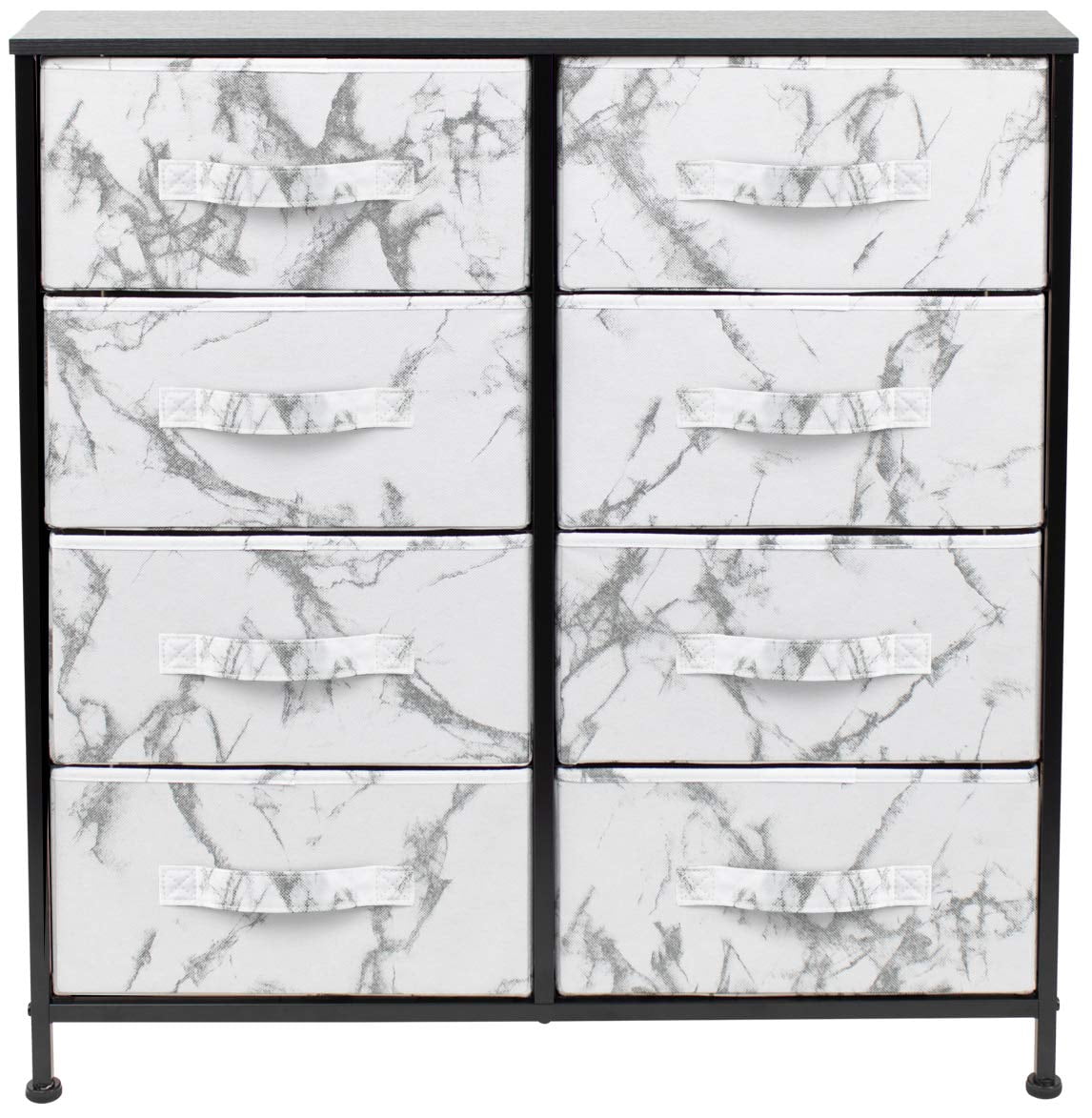 8-DRAWER DRESSER — Style meets function with our dresser chest, complete with a wood surface and storage drawers — Pairs beautifully with the Sorbus Foldable Furniture Collection DISPLAY & DE-CLUTTER — Wood top provides hard surface for displaying lamps, alarm clocks, books, eyeglasses, charging station, and more — Drawers great for storing clothes, blankets, linens, baby clothes, lingerie, purses, scarves, socks, accessories, gadgets, toiletries, cosmetics, hair/beauty products, paperwork, toys, knitting supplies, and household clutter SMART & STYLISH DESIGN — Sleek wide storage — Made with strong steel frame and durable MDF wood top with smooth black finish — Charcoal gray drawers made of breathable, non-woven fabric — Wipe clean — Minimal assembly required — Hardware and instructions INCLUDED — Measures approximately 31.50” L x 11.75” W x 32.12” H