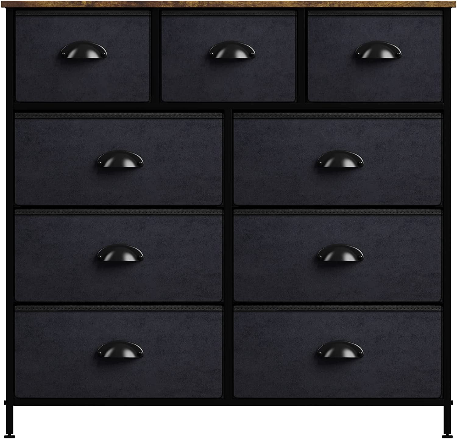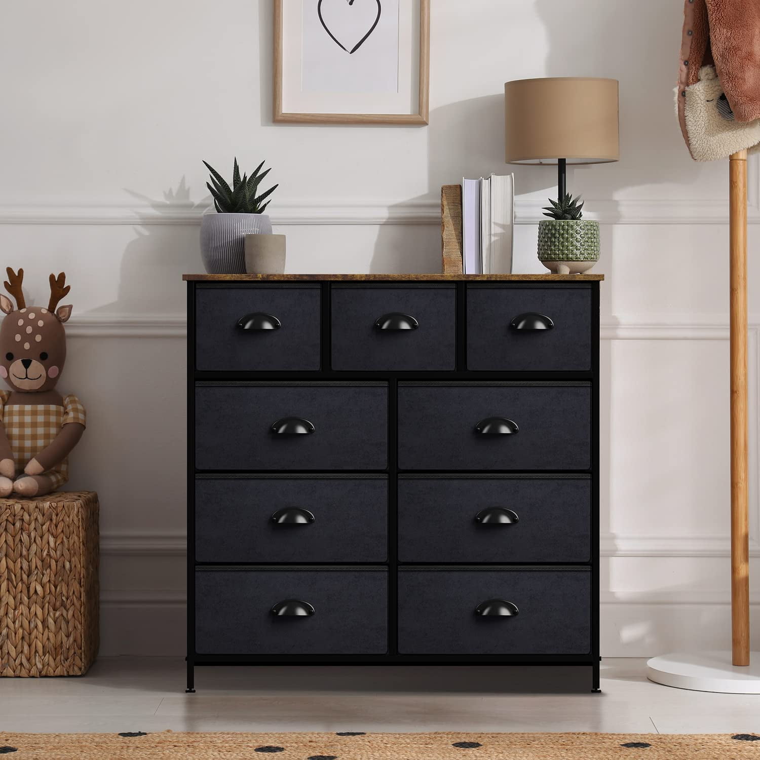 Give your bedside essentials a cozy landing spot with the Sorbus 9-Drawer Dresser. This beautiful chest features a rustic tabletop surface and pull-out drawers to tuck away household clutter. The thoughtful design is compact for small living spaces and works equally well by the bed or sofa. Store anything from books, reading glasses, alarm clocks, and other bedside necessities. The lightweight frame makes this unit easy to transport around the home and when not in use, simply fold the fabric drawers flat for storage. Use alone as a single nightstand or pair with similar styles from the Sorbus Furniture Collection. Versatile furniture for any room. Add this charming nightstand to your bedroom for blankets and towels while displaying fresh flowers and photo frames on the tabletop. Place in any walk-in closet to organize your already stylish wardrobe and accessories. In the nursery, this dresser keeps baby products, toys, and story books organized and within reach. The possibilities are endless! Minimal assembly required. 9-drawer dresser with rustic top and black drawers. Lightweight and easy to assemble. Hardware and instructions INCLUDED. Drawers made of non-woven (polyester) fabric. Steel frame. MDF wood surface with rustic brown/black finish. Accessories shown in image NOT INCLUDED. Measures approximately 39.5” L x 11.5” W x 39.5” H.