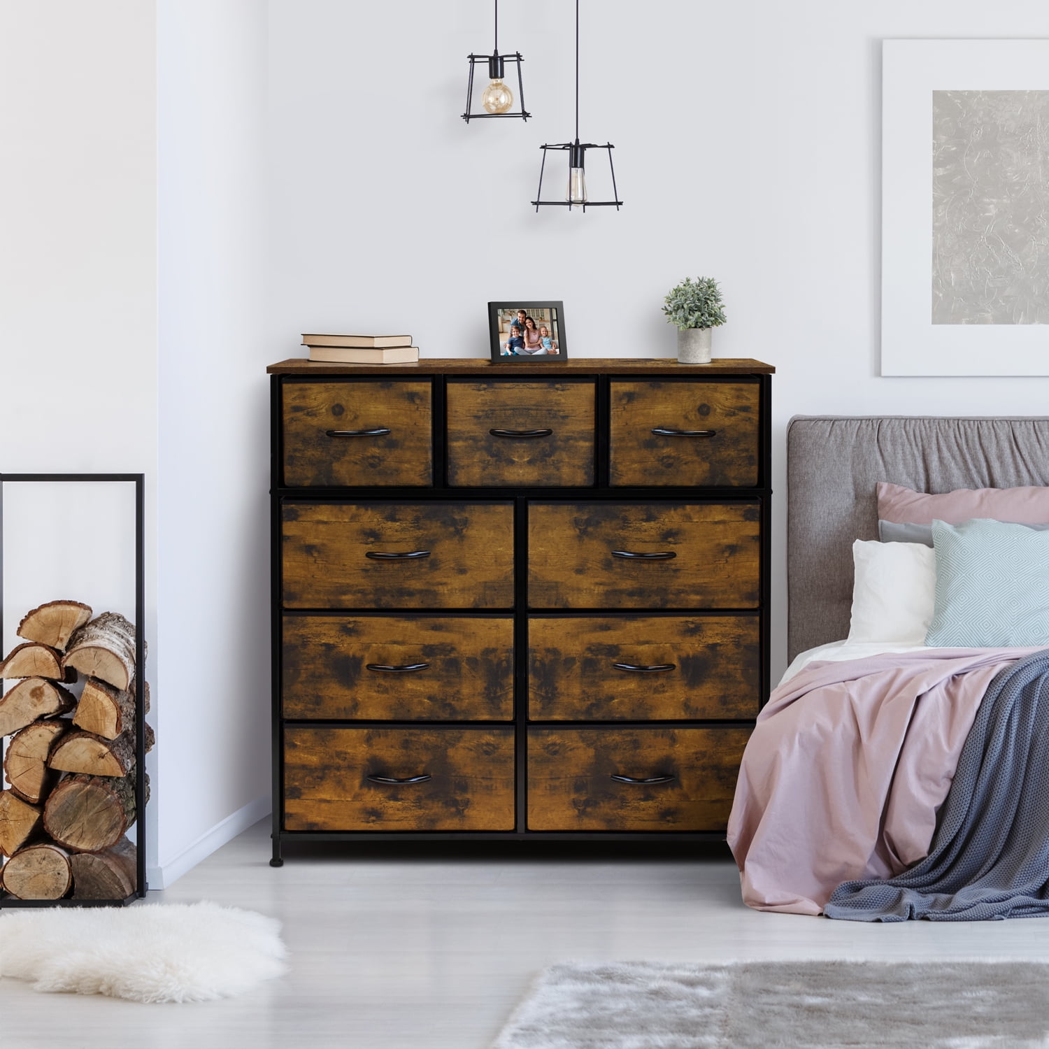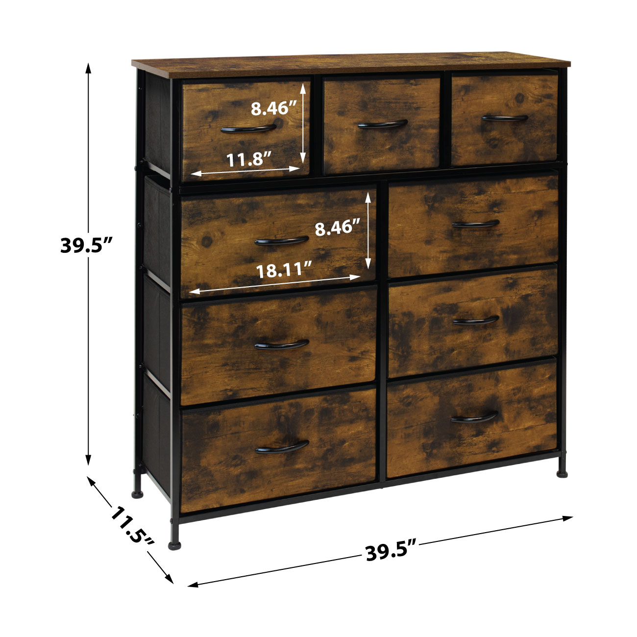 Deep Drawers: Great for concealing clothes, blankets, linens, toys, and household items Sturdy Frame: Strong steel frame with smooth MDF rustic wood top surface. Rustic Wood Print: Complements most decor like rustic farmhouse, vintage, industrial, etc. Minimal assembly required. 9-drawer dresser with rustic top and black drawers. Lightweight and easy to assemble. Hardware and instructions are included. Drawers are made of non-woven (polyester) fabric. Steel frame. MDF wood surface with rustic brown/black finish. The accessories shown in the image are not included. Measures approximately 39.5″ L x 11.5″ W x 39.5″ H.