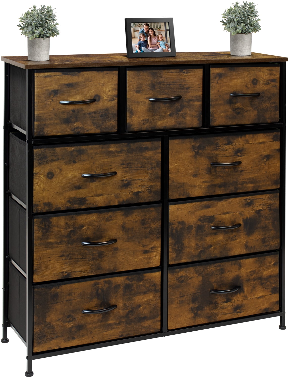 Give your bedside essentials a cozy landing spot with the Sorbus 9-Drawer Dresser. This beautiful chest features a rustic tabletop surface and pull-out drawers to tuck away household clutter. The thoughtful design is compact for small living spaces and works equally well by the bed or sofa. Store anything from books, reading glasses, alarm clocks, and other bedside necessities. The lightweight frame makes this unit easy to transport around the home and when not in use, simply fold the fabric drawers flat for storage. Use alone or pair with similar styles from the Sorbus Furniture Collection. Versatile for any room. Add this charming dresser to your bedroom for blankets and towels while displaying fresh flowers and photo frames on the tabletop. Place in any walk-in closet to organize your already stylish wardrobe and accessories. In the nursery, this dresser keeps baby products, toys, and story books organized and within reach. The possibilities are endless!