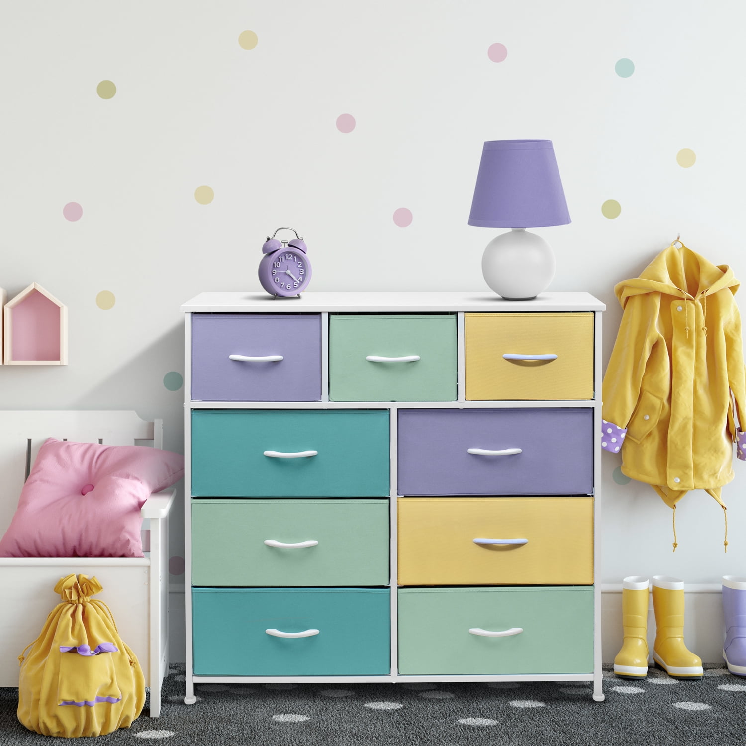 Update your child’s room with the Sorbus 9-Drawer Dresser! This colorful dresser chest features a tabletop surface and pull-out drawers to tuck away household clutter. Place all of your child’s folded t-shirts, jeans, and pajamas, or extra blankets and toys within the spacious fabric drawers. For display, the top surface can be used for lamps, books, clocks, and more. The playful color makes this furniture storage charming for any nursery, playroom, or bedroom. It is lightweight for easy transport and when not in use, simply fold the fabric drawers flat for storage. Complete the look with any style from the Sorbus Furniture Collection. Great addition to any room. Great addition to any room. Bring on the toys, books, and blankets! Display this charming dresser in the kid’s bedroom filled with linens and clothes or play area complete with coloring books, Legos, plushies, and dolls! The soft lightweight fabric makes it easy for kids to pull out their favorite toys for play dates or easily put them away. In the nursery, this chest brightens up your little one’s sleeping space for stylish baby storage. With kids and teens in mind, it complements rainbow décor, unicorn themes, and trendy ombré colors for a fun look. About the design. 9-drawer multi-color dresser (purple, teal, yellow, aqua). Lightweight and easy to assemble. Hardware and instructions INCLUDED. Drawers made of non-woven (polyester) fabric. Frame made of steel and MDF wood with white finish. Accessories shown in image NOT INCLUDED. Measures approximately 39.5” L x 11.5” W x 39.5” H.
