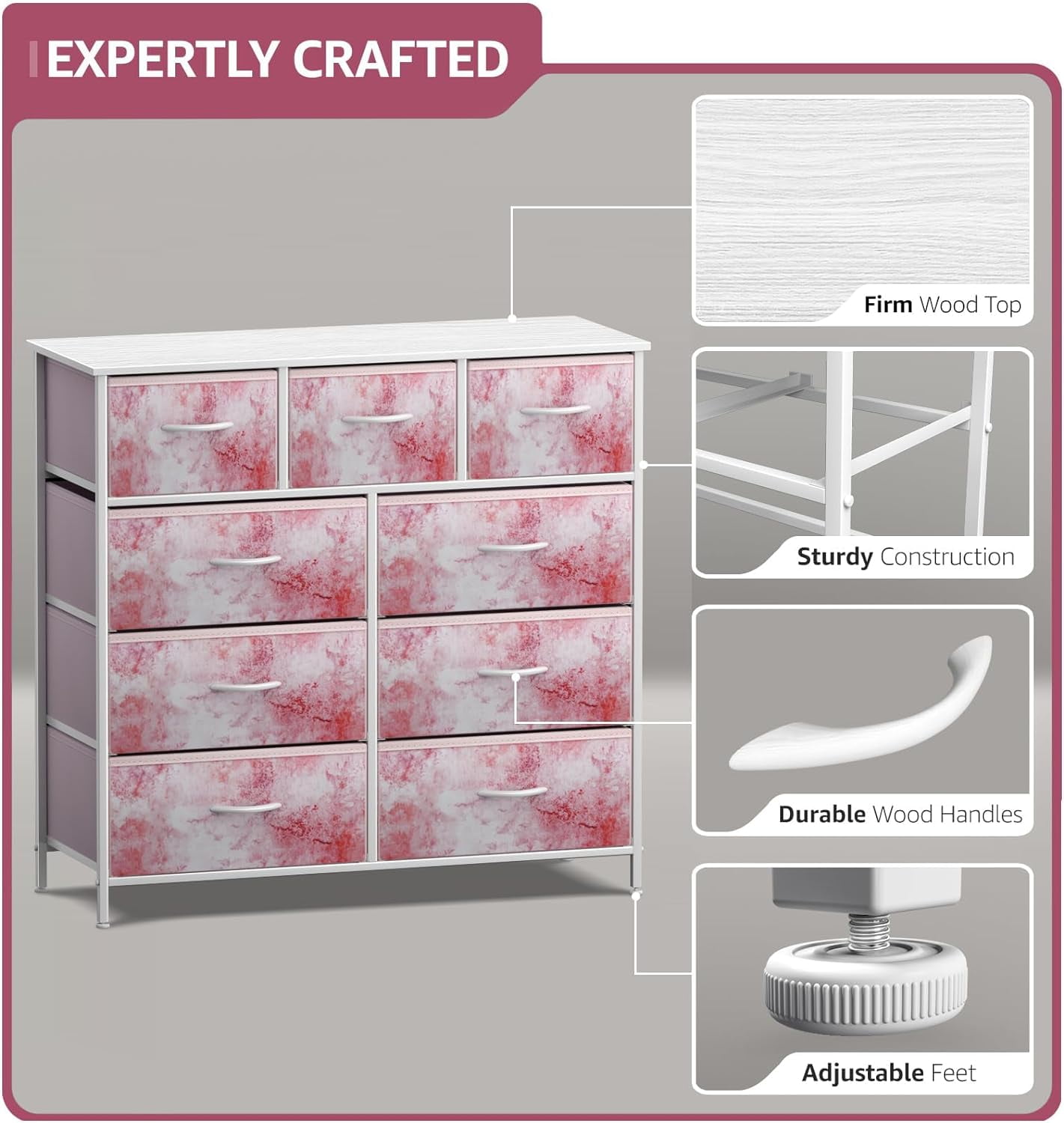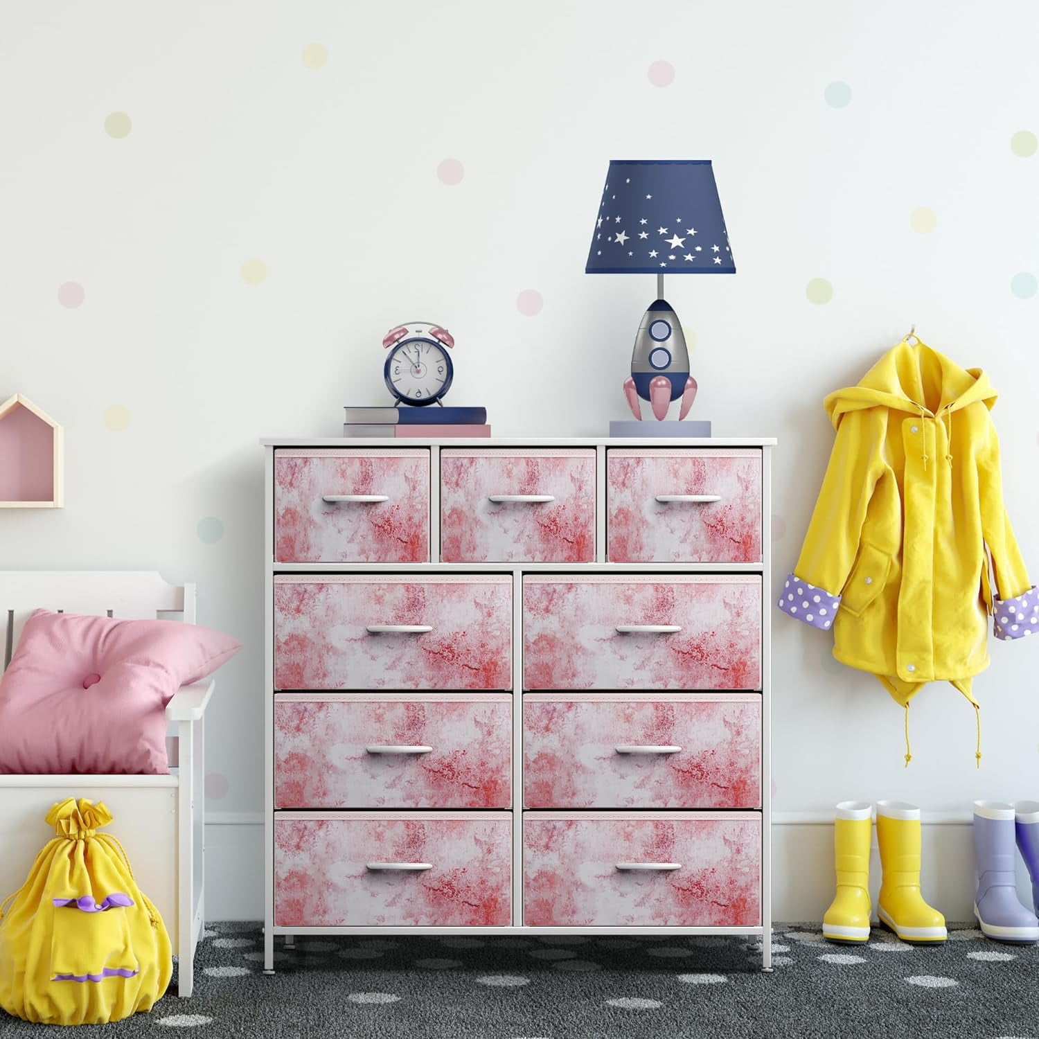 Pull Handles: Wood handles for easy opening/closing and transporting drawer bins. Deep Storage: Great for concealing clothes, blankets, linens, toys, and household items. Sturdy Design: Made with a steel frame, durable MDF wood top, and stable feet for support. Trendy design with easy assembly. 9-drawer dresser (Tie-dye Pink). Lightweight and easy to assemble. Hardware and instructions are included. Drawers are made of non-woven (polyester) fabric. Frame made of steel and MDF wood with a white finish. The accessories shown in the image are not included. Measures approximately 39.5″ L x 11.5″ W x 39.5″ H.