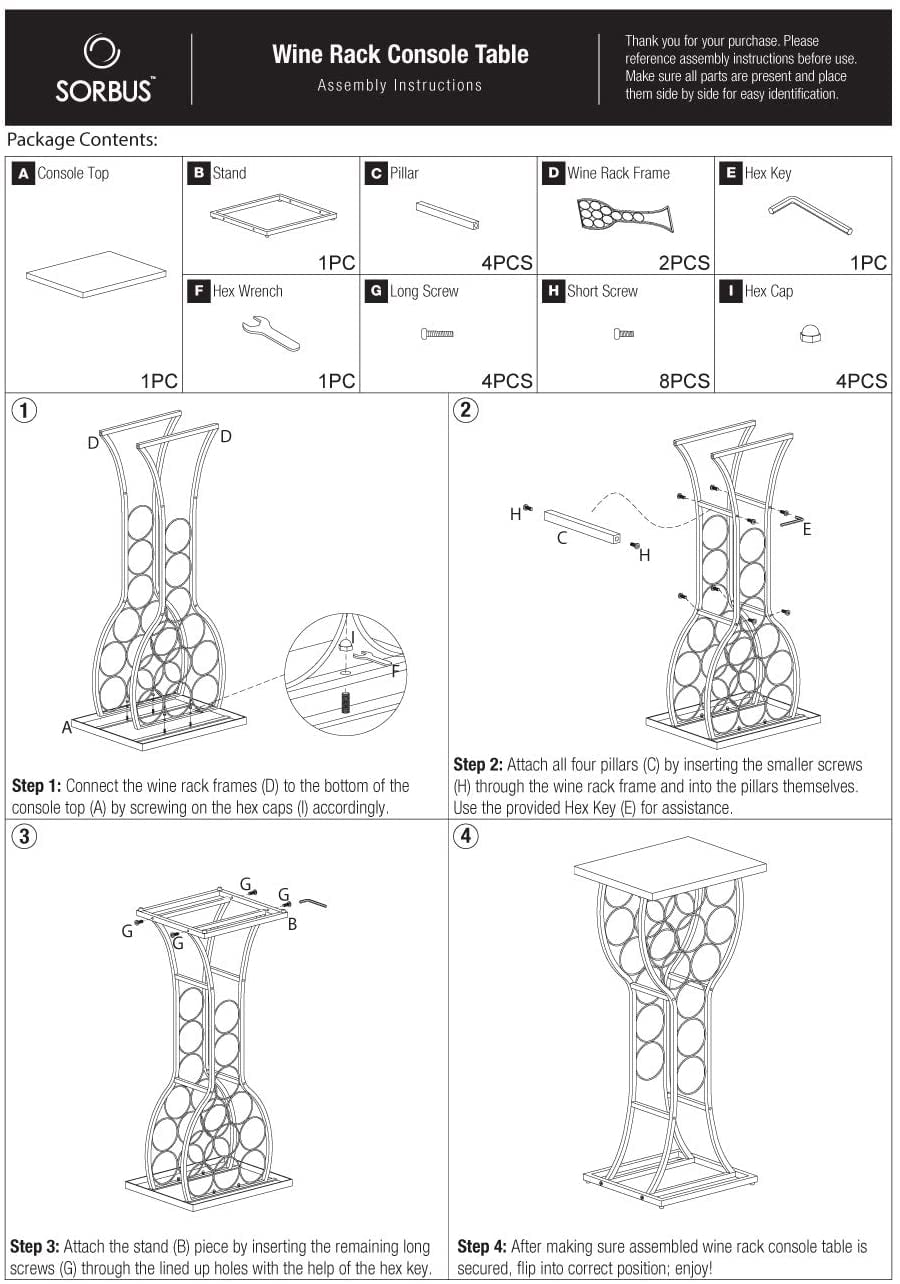 Put your favorite wine on display with the Sorbus Wine Rack Table! With distinctive style, this wine rack table is both stylish and dual-purpose. It holds up to 11 wine bottles and features a beautiful faux marble tabletop. The charming wine glass silhouette makes this design an interesting conversation piece for home décor and entertaining. Once assembled, you’ll simply love filling it with your favorite bottles of wine and accessories! Display against any wall for everyday bottle storage or to serve drinks and appetizers from the tabletop surface. With small spaces in mind, this console table is a wonderful complement to your wine collection. Perfect for entertaining, this wine rack transforms any space into a home bar. Entertain family and friends with your finest wine selections from any room around the home. This freestanding wine rack fits beautifully as a side table in the living room, dining room corner, or in the kitchen to save counter space. Need more storage? Add multiple wine tables to create a mini wine cellar truly worthy of a toast! It’s convenient for small gatherings, special occasions, or to accent the home bar area all year long. For special moments, this wine console table makes the perfect gift for holidays, birthdays, weddings, housewarming parties, and more. The elegant vertical design is compact for small spaces and easy to assemble. Easy setup with minimal assembly required. Instructions and Hardware included. Lightweight and functional. Place anywhere on floor with little effort. Designed with decorative wine glass inspired silhouette. Tabletop made of wood + veneer marble with black metal frame. Stores 11 bottles total. Holds most standard wine bottles. Wine bottles NOT INCLUDED. Measures approximately 14.75”L x 11.87” W x 33” H. (Round bottle holders 3.25”D).