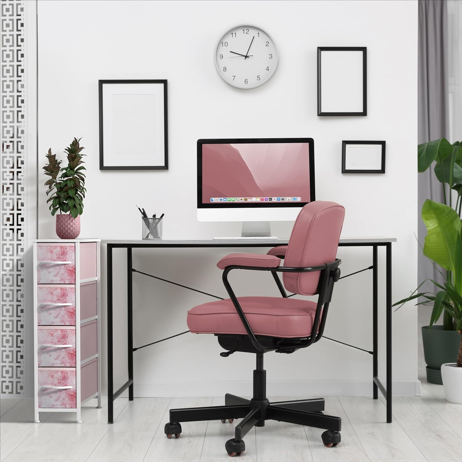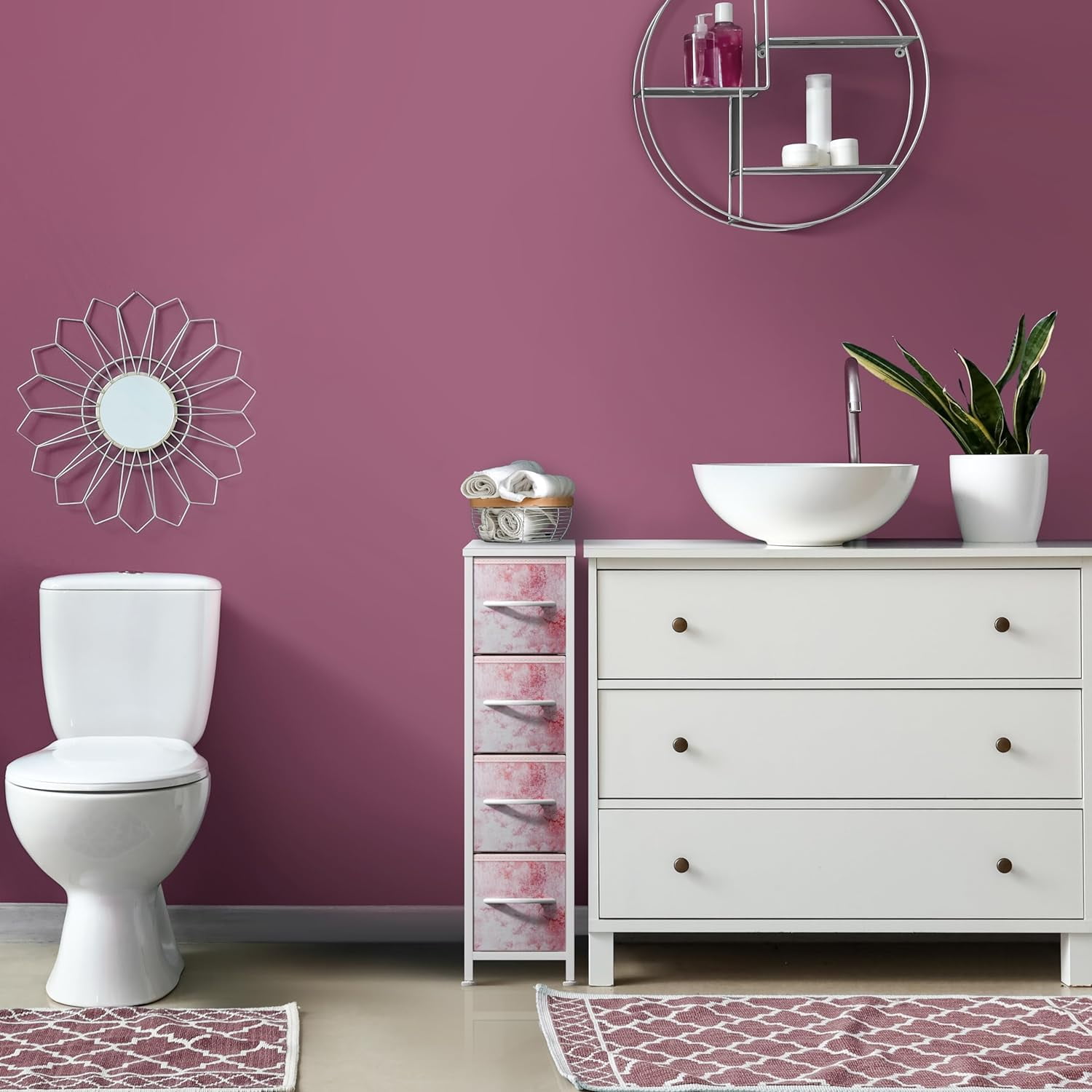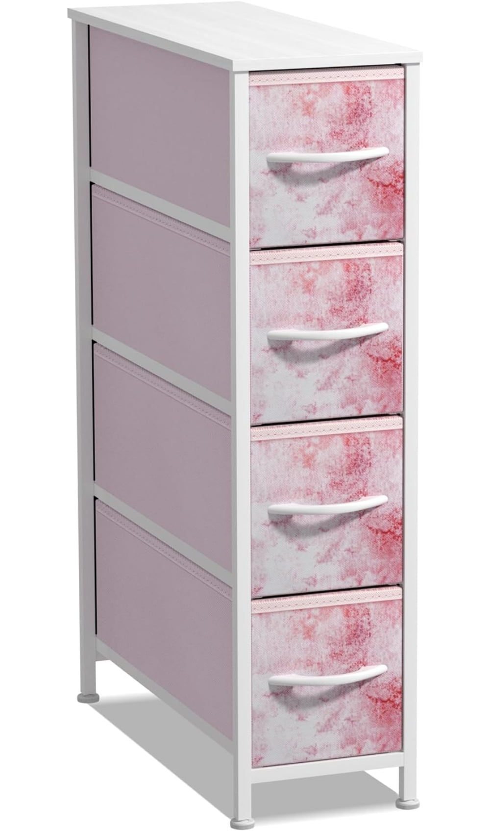 Pull Handles: Wood handles for easy opening/closing and transporting drawer bins. Sturdy Design: Made with a steel frame, durable MDF wood top, and stable feet for support. Foldable Drawers: Each drawer includes a fabric cardboard base. Drawers fold flat for easy storage Trendy design with easy assembly. 4-drawer narrow storage dresser (Tie-dye Pink). Lightweight and easy to assemble. Drawers are made of non-woven (polyester) fabric. Frame made of steel and MDF wood with a white finish. Measures approximately 7.87″ L x 19″ W x 29.87″ H.