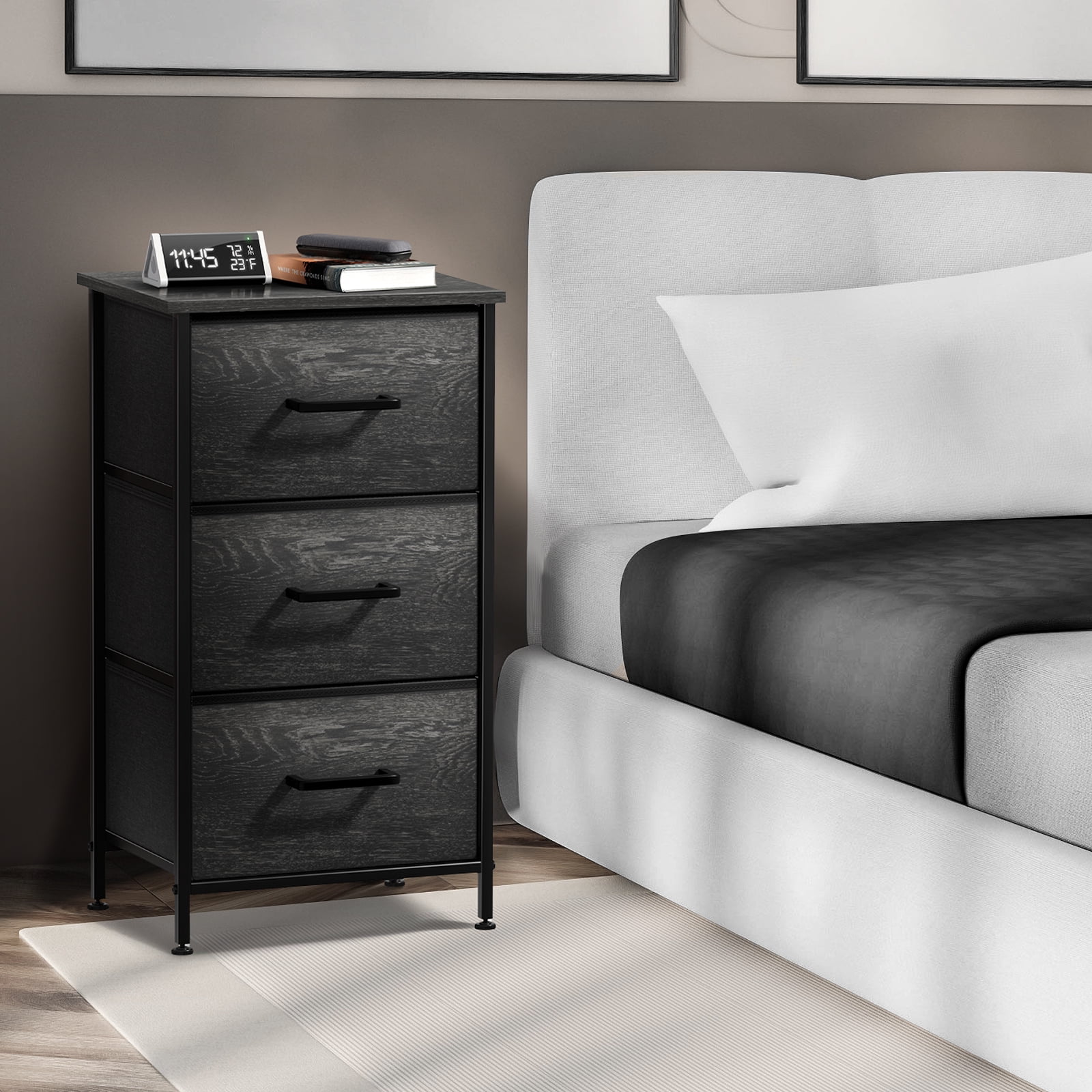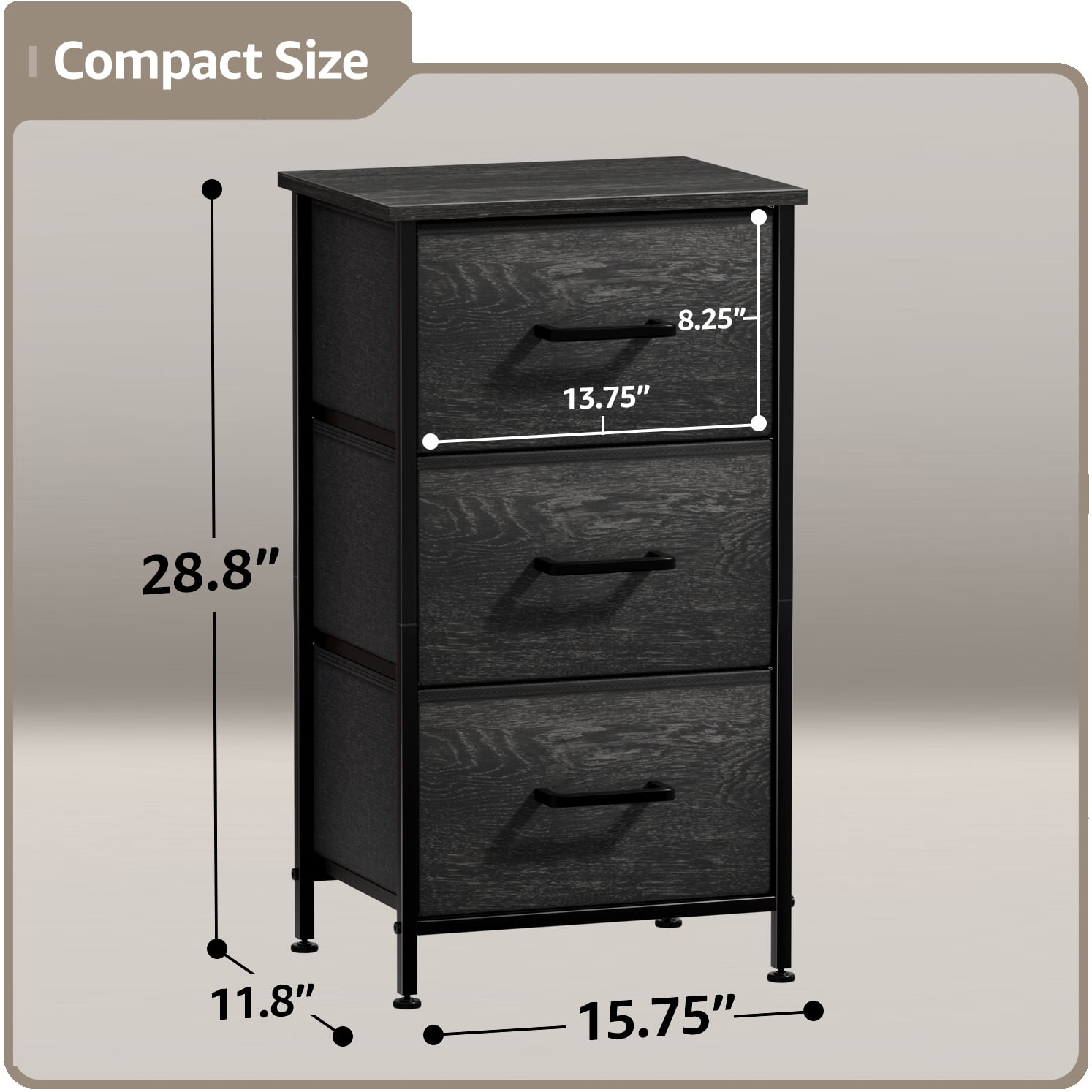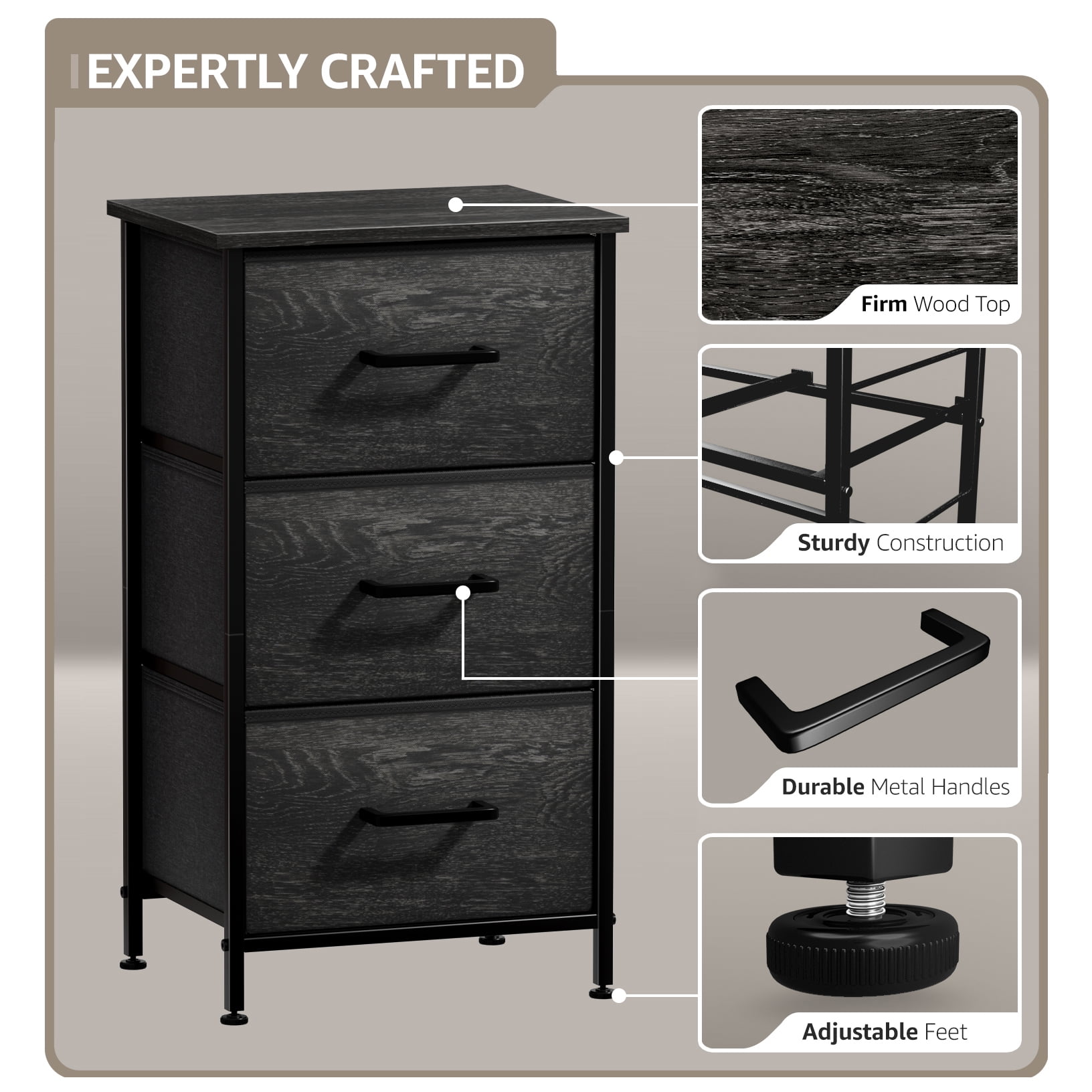 3 Drawer Fabric Storage Dresser — Sorbus Tall Storage Dresser Tower features a sturdy steel frame, polyester fabric drawers, durable handles, and a wooden, water-proof top. Display & Organize — Store clothes, blankets, crafts, linens, baby clothes, lingerie, purses, scarves, socks, accessories, gadgets, toiletries, makeup, cosmetics, office supplies, toys, knitting supplies, and more Multifunctional — Suitable for the bedroom, dorm room, living room, guest room, closet, nursery, hallway, college dorm, small apartment solutions, etc — Use as a nightstand, file cabinet, dresser, and more — Complements most décor whether traditional, rustic, or modern Easy assembly — Put your dresser together in minutes so you can organize your home right away Sturdy Design — The sturdy and durable steel frame offers stable support for your belongings. This dresser is perfect for storing light items such as socks and underwear as well as heavier items including jeans and jackets.