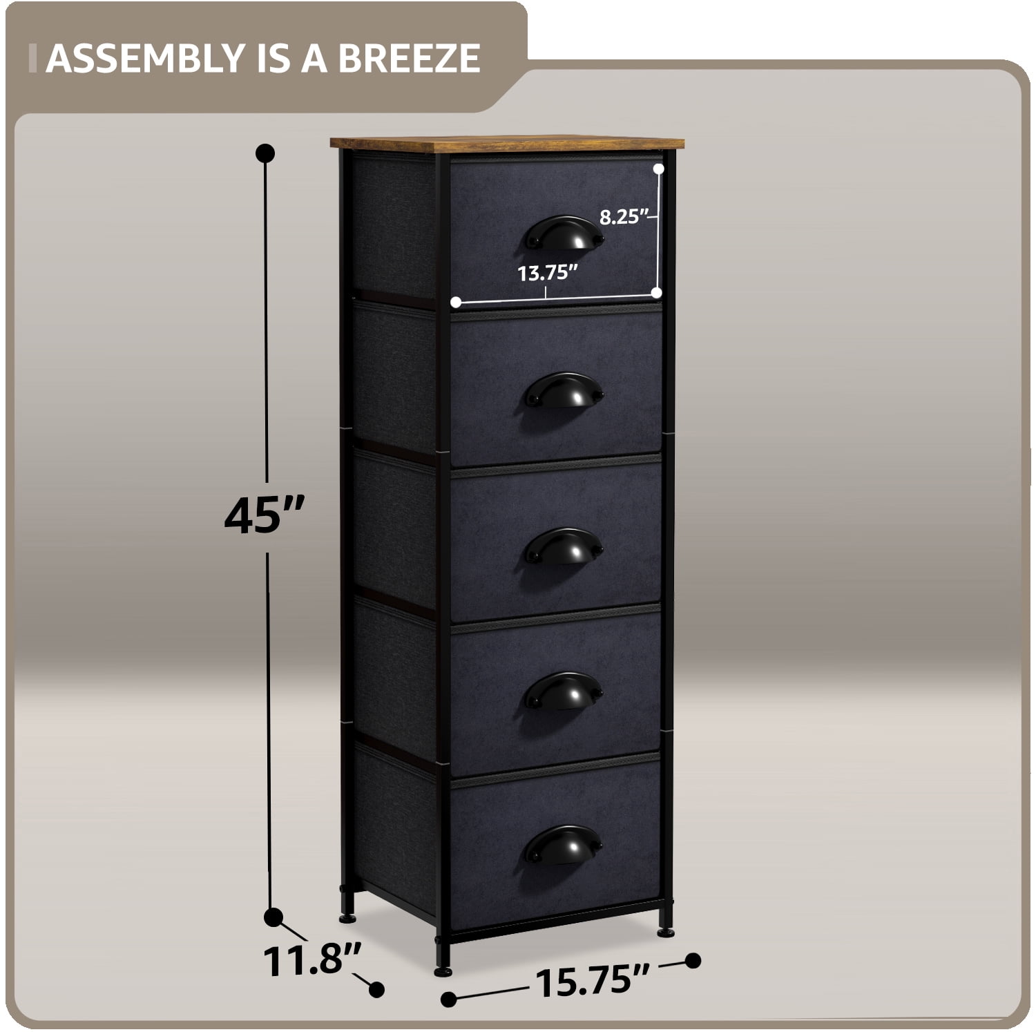 Sorbus Nightstand Dresser with 5 Drawers – Tall Storage Tower Unit Organizer for Bedroom, Hallway, Closet, College Dorm – Chest Drawer for Clothes, Steel Frame, Wood Top, Fabric Bins (Rustic Black)