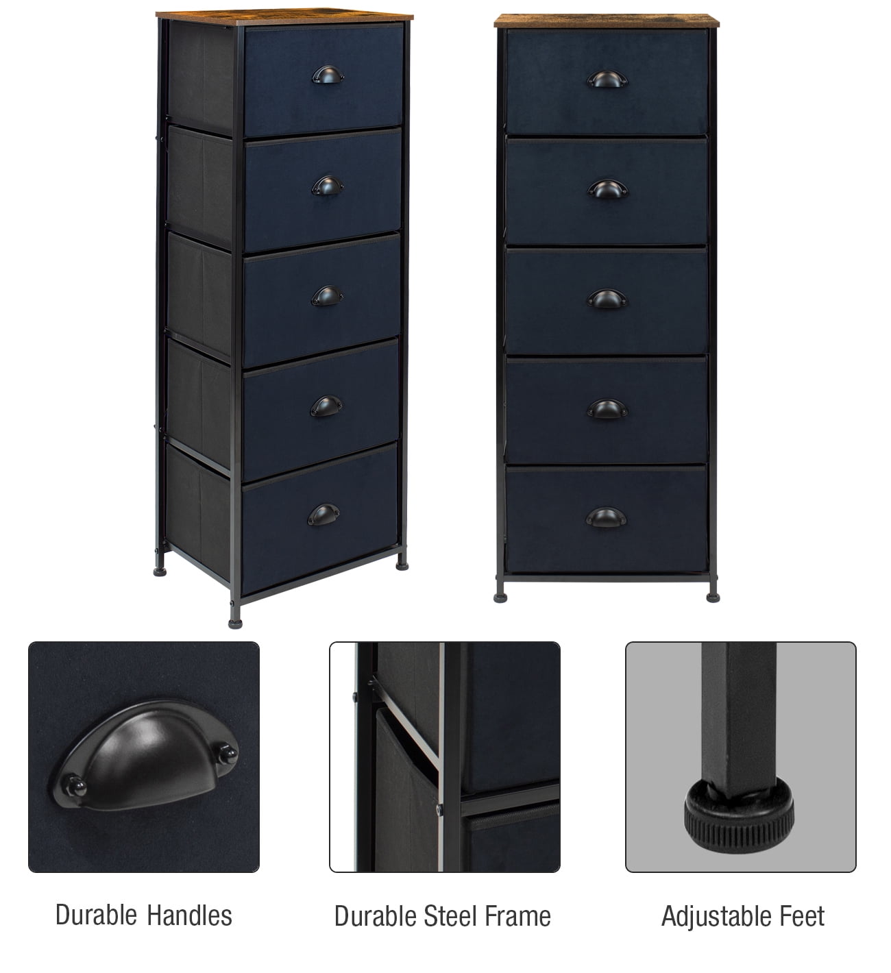 Deep Storage: Made with a steel frame, durable MDF wood shelf, and stable feet for support. Sturdy Design: Great for concealing clothes, blankets, linens, toys, and household items. Foldable Drawers: Each drawer includes a fabric cardboard base. Drawers fold flat for easy storage. Minimal assembly required. 5-drawer nightstand with rustic top and black drawers. Lightweight and easy to assemble. Hardware and instructions included. Drawers made of non-woven (polyester) fabric. Frame made of steel and MDF wood finish. Accessories shown in the image are not included Each drawer is 15.75″ L x 10.75″ W x 8.25″ H. Measures approximately 18″ L x 11.87″ W x 46″ H.