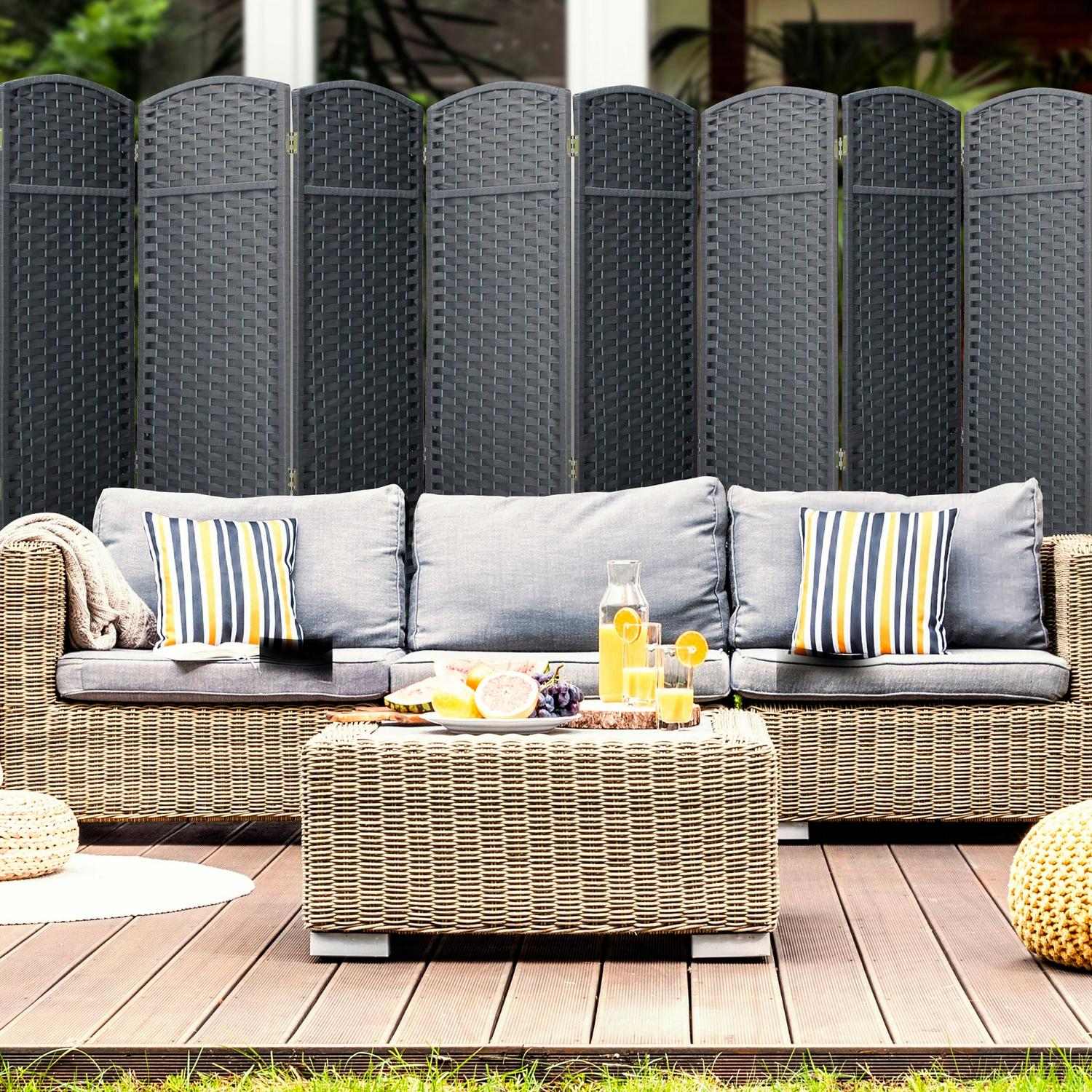 Divide and conquer your space with the Sorbus 8-Panel Room Divider. This eye-catching privacy screen is a beautiful way to divide a large room, section off a corner, or simply display. The double-hinged panels allow for folding in either direction and can be positioned in many configurations for flexibility. It’s lightweight for easy relocation and folds close for storage when not in use. This modern panel screen is perfect for partitioning any home, office, or college dorm. From the living room to the patio, room dividers instantly change your atmosphere! Whether moving into a studio, setting up a workstation, or dividing a bedroom for guests, this partition is a must have accessory! For privacy, it makes a great modesty screen for getting dressed, porch privacy from neighbors, or to cover windows indoors. It can also be used as a sunscreen on a covered porch or to make room distinctions in the basement without putting up real walls. The possibilities are endless! As a stylish background, this panel divider has an elegant look and blends well with most décor whether modern or traditional. No assembly required! The flexible frame expands opens/ folds close. Made of poplar wood frame with PP woven straps in beige color. If used outdoors, protect from elements and store indoors after use. Wipe clean with wet towel and dry in ventilated area. Overall unit measures approximately 10.5 ft L x 6ft H.