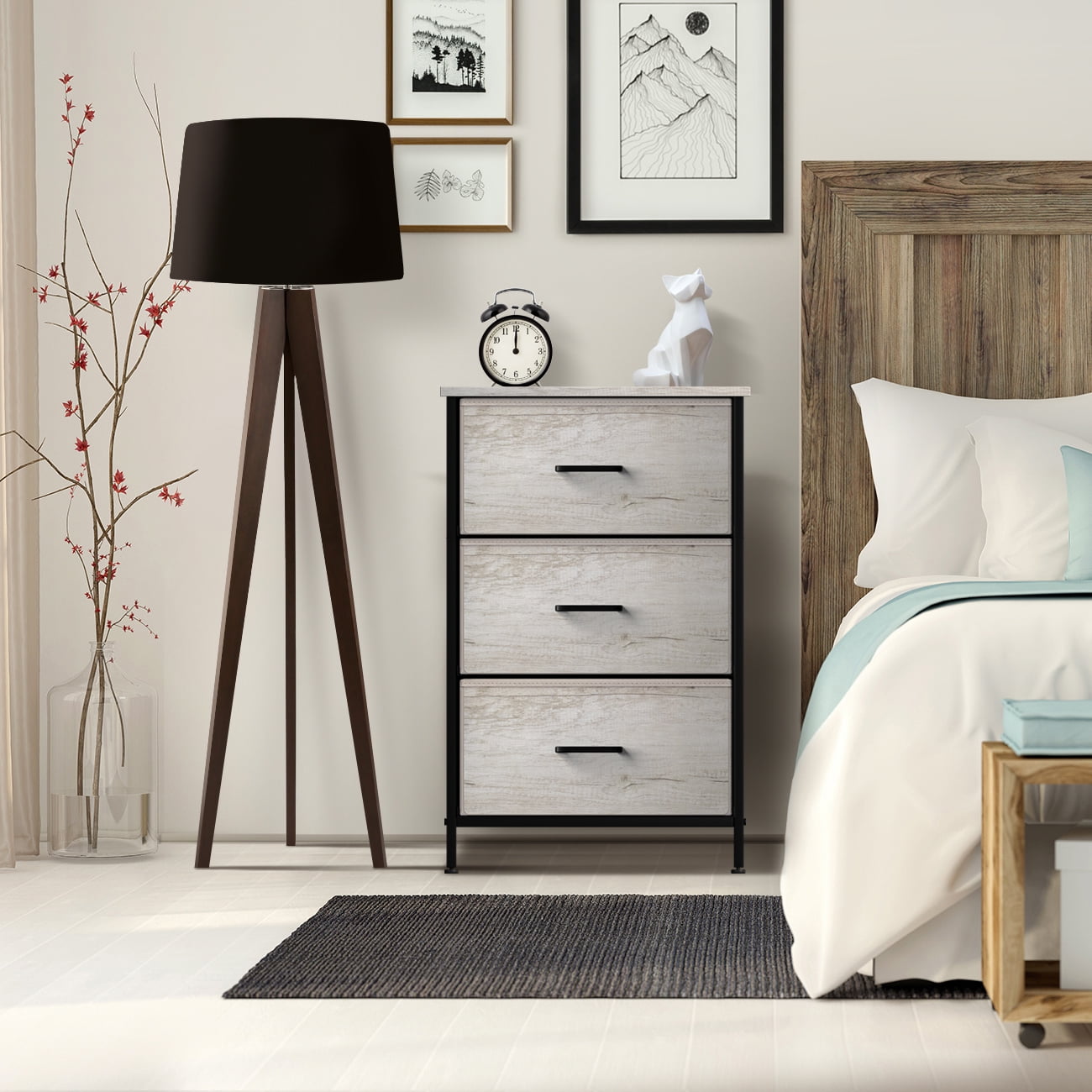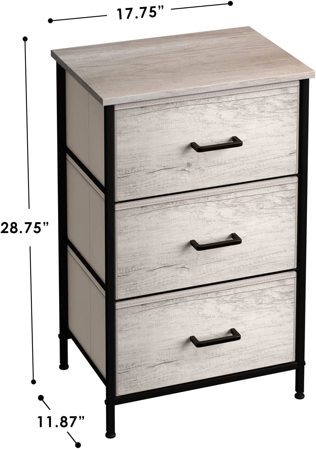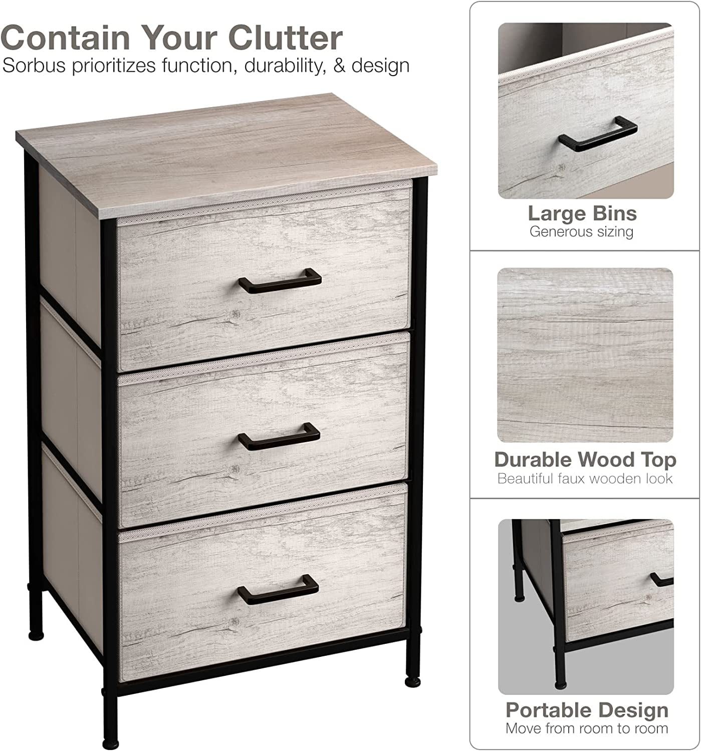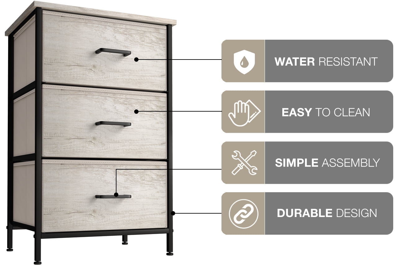 3 Drawer Fabric Storage Dresser — Sorbus Tall Storage Dresser Tower features a sturdy steel frame, non-woven fabric drawers, durable handles, and a wooden, water-proof top. Display & Organize — Store clothes, blankets, crafts, linens, baby clothes, lingerie, purses, scarves, socks, accessories, gadgets, toiletries, makeup, cosmetics, office supplies, toys, knitting supplies, and more Multifunctional — Suitable for the bedroom, dorm room, living room, guest room, closet, nursery, hallway, college dorm, small apartment solutions, etc — Use as a nightstand, file cabinet, dresser, and more — Complements most décor whether traditional, rustic, or modern Easy assembly — Put your dresser together in minutes so you can organize your home right away Foldable drawers — All cloth drawers are made of soft fabric and a reinforced base pull out with ease. When not in use, drawers are removable and fold flat