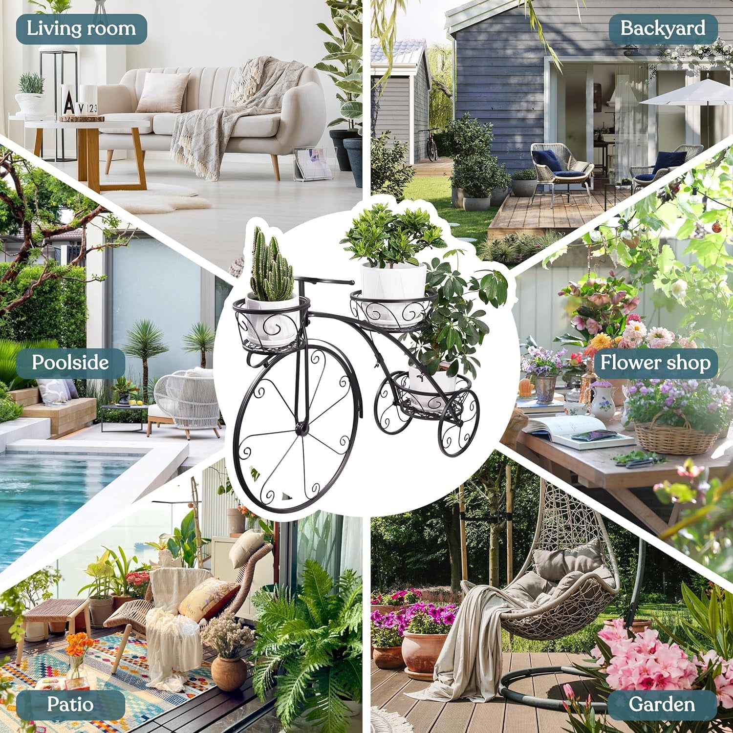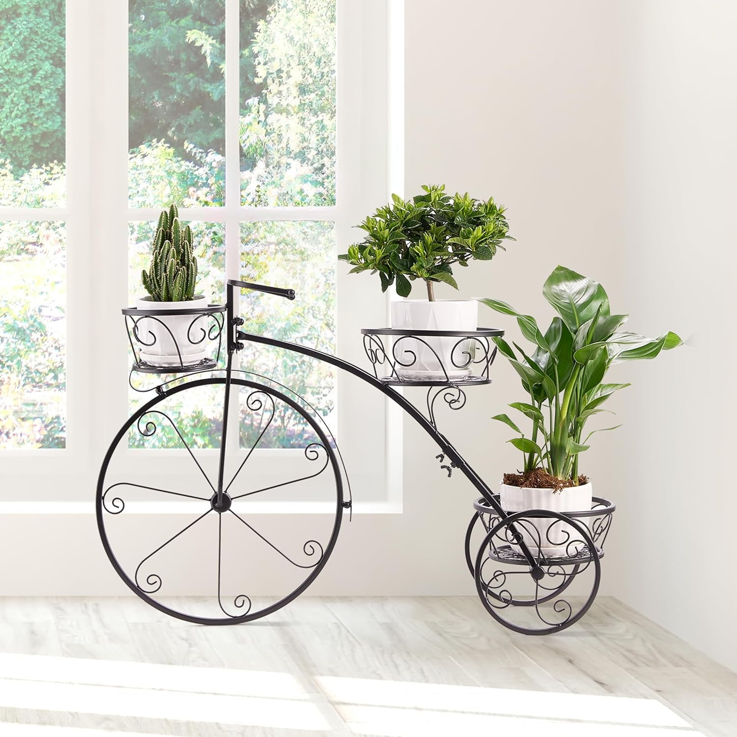 TRICYCLE PLANT STAND (BLACK) — Beautifully display plants, flowers, and garden decorations on a decorative tricycle stand—Features 3 round, basket-style tiers to keep planters secure and stylish STYLISH & DECORATIVE — Whimsical Parisian style Tricycle, complete with scroll wheel details—Gives a playful touch to any space — Charming focal point to patio, home, garden — Attractive way to keep plants off the floor/ground INDOOR/OUTDOOR — Place indoors: entryway, living room, sunny window, stairwell, screened patio — Place outdoors: porch, cactus garden, pool area, balcony, rooftop, terrace, flower shop GREAT GIFT IDEA — Perfect for home and garden lovers — Makes a great gift, i.e. (Mother’s Day, Birthday, housewarming) — Beautiful addition to any garden party or outdoor event STURDY & DURABLE— Made of wrought iron with powder coated finish — 3 round basket Holders —Holds a variety of smaller sized planters — (Wheels are decorative only and do not roll) — Flowers NOT INCLUDED — Minimal Assembly Required — Measures approximately 30.5″ L x 10″ W x 20.5″ H