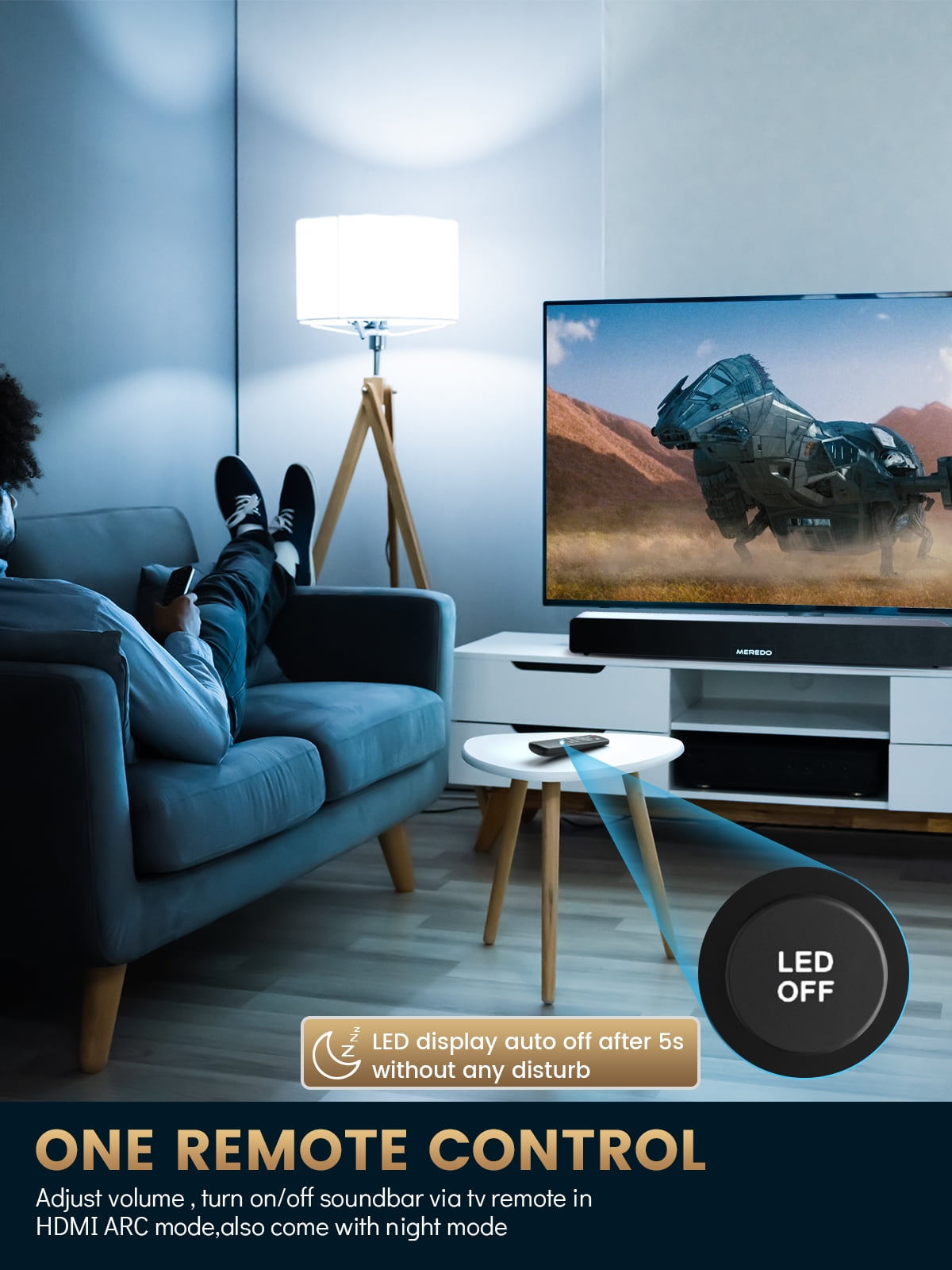 2.1ch 180W 2 in 1 Separable Sound Bar with Subwoofer Premium wooden 2.1 sound bar: MEREDO peak power 150W soundbar is made of high-density wood materials, can provide large power carrying capacity, and makes the sound thick and powerful, without distortion. Extra bass: As a real built-in 2.1 channel sound bar, MEREDO made a bass duct structure, and a built-in 4-inch subwoofer speaker. It emphasizes bass for an incredible sound that hits deeper. Optimized sound for various scenes: MEREDO Soundbar provides 5 EQ modes(Film, News, Music, Bass, Game), whether it’s a loud sports match or a drama with quiet dialogue, you can count on the best soundbar to provide clear sounds for optimized TV view. 5 connection modes: Upgrade 5.0 Bluetooth no lag, No delay, Only freedom, also supports HDMI-ARC, Optical, AUX, and USB. With HDMI ARC, you can hear quality, lossless sound even when connected to other devices via your TV like UBD players or game consoles. Craftsmanship beyond sound: A sound system designed to be part of your home. The wood texture together with cutting-edge technology matches the exceptional feeling of room-filling sound. Note: MEREDO Wooden Soundbar does not support wall mounting. Product Dimensions:71.8 x 13.97 x 7.62 cm, Please refer to the measurement to confirm whether you can leave enough space for placement. Note: If you have any questions about setting up your Sound Blaster and TV, please feel free to contact us. MEREDO Soundbar does not support Dolby/DTS sound. What’s the difference between MEREDO 2.1 CH Built-in 4 in subwoofer at the bottom, to deliver the robust low-end frequencies. Create a real separation structure between channels for holistic 2.1 audio in a single soundbar. An all-in-one system saves space, you won’t need to find a space for a big sub and still get a big sound. MEREDO Soundbar easily fits your living room, bedroom, or family room space. 5 Smart EQ Modes Just set the mode to suit your mood, and memory mode will automatically save your favorite settings. Film Mode: To create an immersive sound, take you transported into the movie. News Mode: Lets you hear the voice clearly from news, speech, and the TV talk show Music Mode: Emphasizes balance, highlights the original sound quality, and immerses you in the world of music Bass Mode: Suitable for music or games with prominent bass, movie scenes, enjoy robust bass impact. Game Mode: Powerful bass can enhance the game scene and provide incredible surround sound, helping you to hear the subtle details