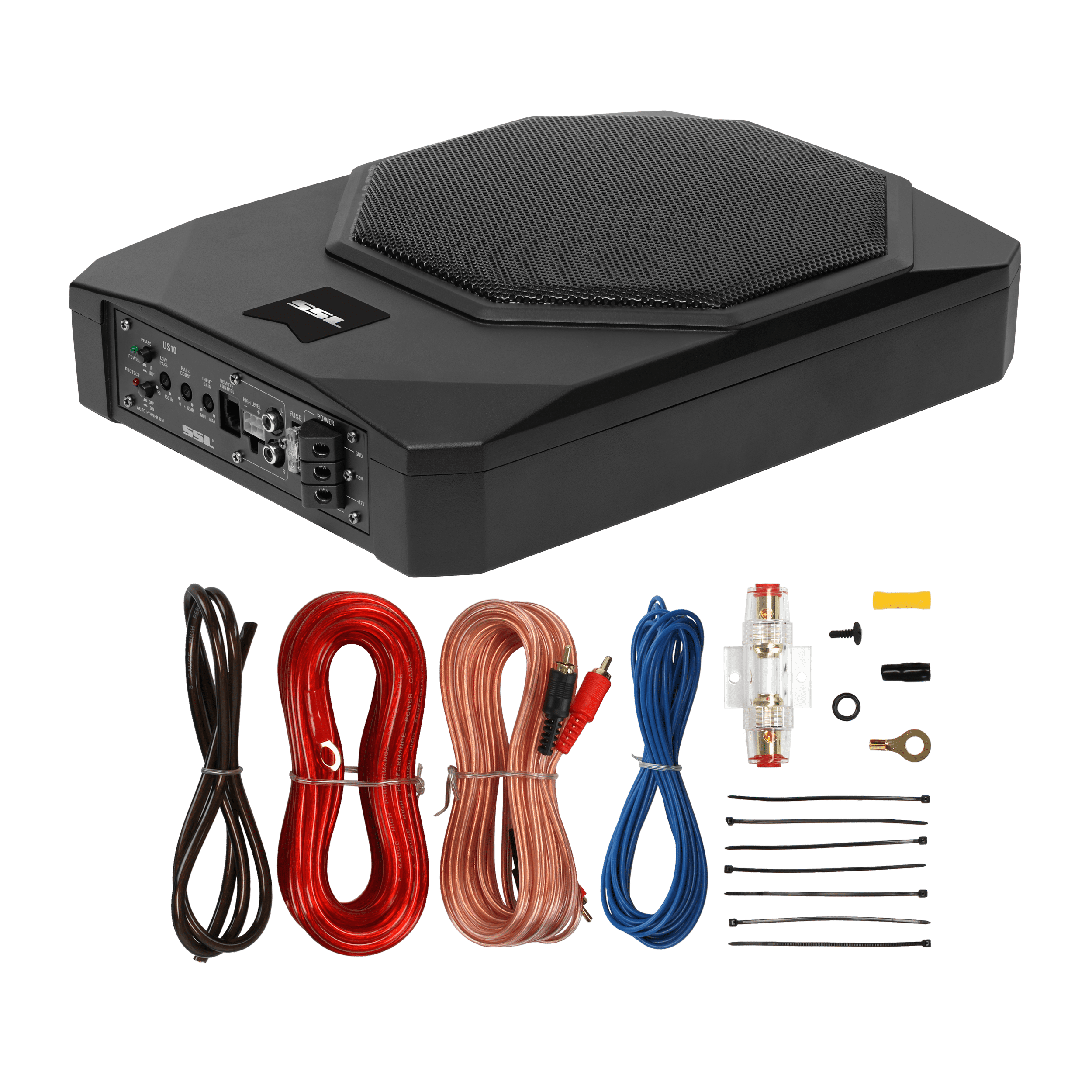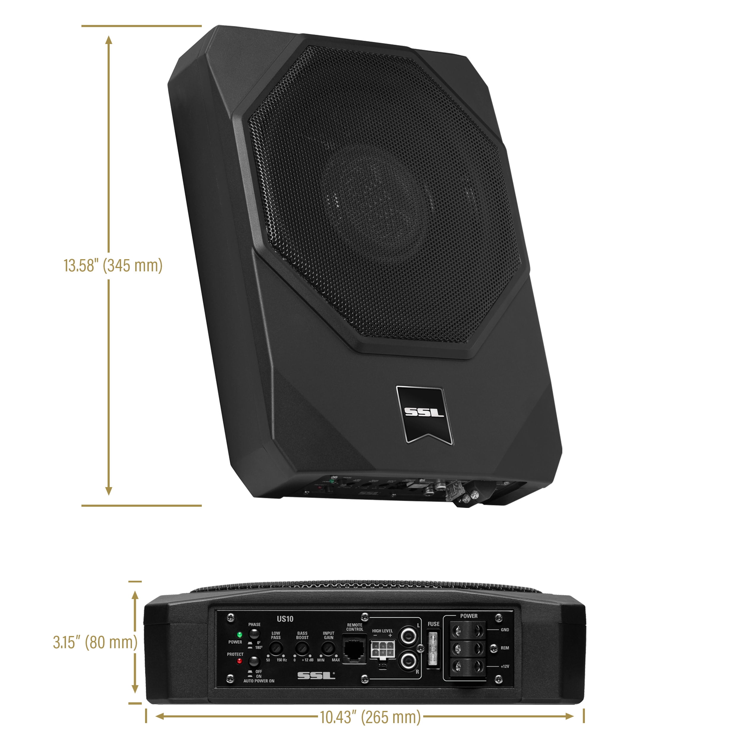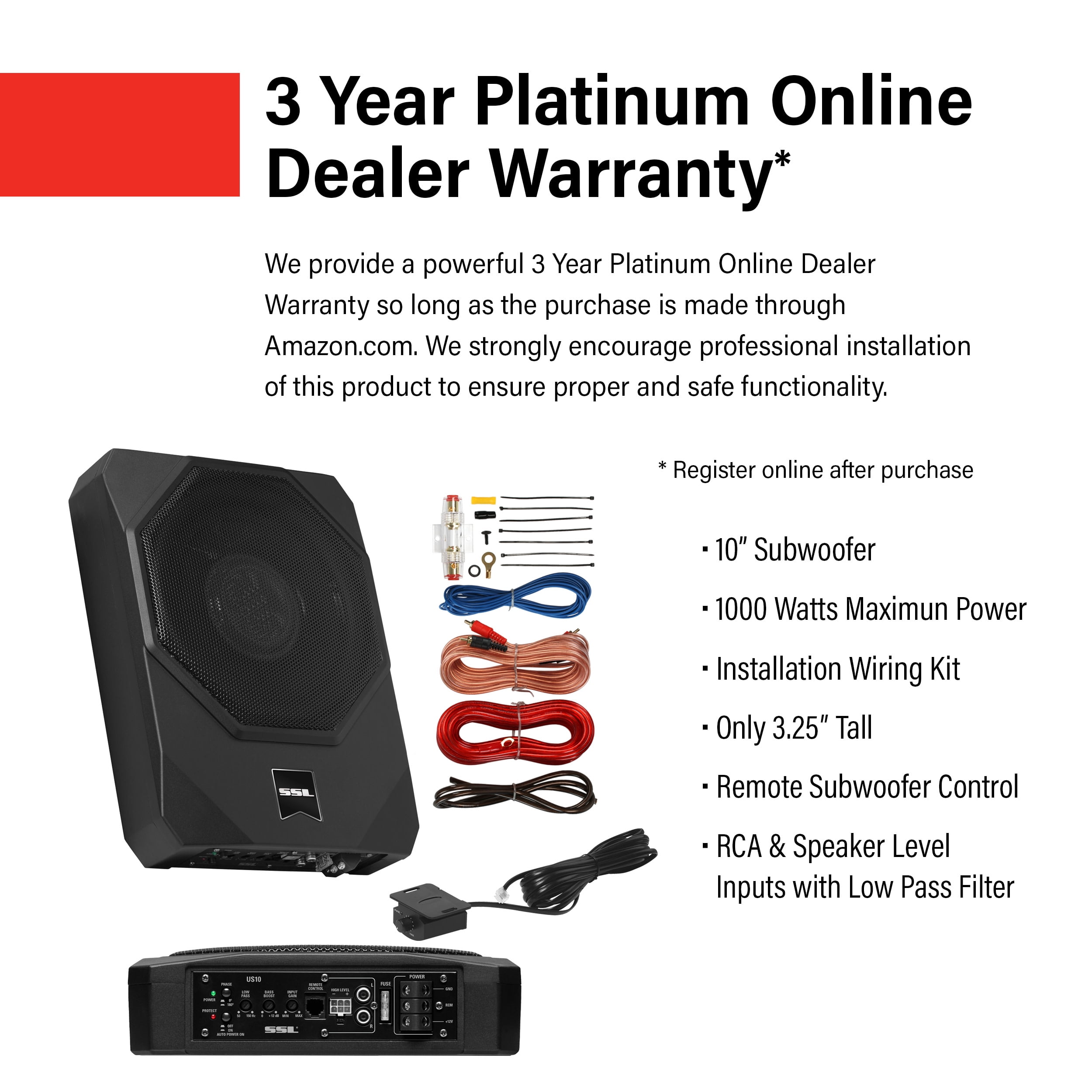 Built-in Amplifier – With a MOSFET power supply you get improved switching speeds, better performance with less power from the driver, lower gate-to-drain feedback capacitance, lower thermal impedance for higher switching frequencies PWM – Pulse Width Modulated design simplifies power supplies. It controls the output voltage and current precisely by removing the output current sensing loss & eliminating all secondary feedback circuitry. It’s efficient & reliable Variable Low-Pass Filter – A low-pass filter is an electronic circuit that removes all the notes below the filter’s frequency setting. You will use the Low-pass filter to primarily keep high notes out of your subwoofer(s) High Level Inputs – Speaker level inputs are commonly referred to as high-level inputs. It will be used to connect the US10 to your factory radio or an aftermarket radio that does not have low-level (RCA) inputs Low-Level Inputs – Line level inputs, also known as RCA inputs or low-level inputs, use RCA interconnect cables to link the US10 with the source unit. Most aftermarket radios have multiple pairs of RCA outputs that can connect to multiple amplifiers Built-in Amplifier – With a MOSFET power supply you get improved switching speeds, better performance with less power from the driver, lower gate-to-drain feedback capacitance, lower thermal impedance for higher switching frequencies PWM – Pulse Width Modulated design simplifies power supplies. It controls the output voltage and current precisely by removing the output current sensing loss & eliminating all secondary feedback circuitry. It’s efficient & reliable Variable Low-Pass Filter – A low-pass filter is an electronic circuit that removes all the notes below the filter’s frequency setting. You will use the Low-pass filter to primarily keep high notes out of your subwoofer(s) High Level Inputs – Speaker level inputs are commonly referred to as high-level inputs. It will be used to connect the US10 to your factory radio or an aftermarket radio that does not have low-level (RCA) inputs Low-Level Inputs – Line level inputs, also known as RCA inputs or low-level inputs, use RCA interconnect cables to link the US10 with the source unit. Most aftermarket radios have multiple pairs of RCA outputs that can connect to multiple amplifiers Variable Bass Boost – Variable Bass Boost allows you to adjust the low bass within the boost range to just the way you like it Phase Control – Phase control lets you adjust the speaker phase with the amplifier if your speakers or subwoofer are hooked up “out of phase” Specs – 13.58” x 10.43” x 3.15”. 10.6 Lbs. LED Status Indicator. Thermal, Short and Overload Protection Circuits. High performance voice coil. Rubber surround. Aluminum cone. The all-in-one combo makes this ideal for spatially challenged vehicles Warranty – Sound Storm provides a powerful 3-year Platinum Online Dealer Warranty so long as the purchase is made through Amazon.com. We strongly encourage professional installation of this product to ensure proper and safe functionality One 10″ Woofer with SINGLE 2.6 ohm Voice Coil 1000 Watts MAX 500 Watts RMS Power Handling RCA & Speaker Level Inputs, High Level Inputs Thermal, Short and Overload Protection Circuits, Power & Protection LEDs Phase Control, Low Pass Crossover, Variable Bass Boost, Input Gain Control S/N Ratio> 90 dB, Frequency Response 30Hz to 150Hz Remote Subwoofer Control