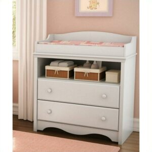The practical Pure White Andover Changing Table by South Shore offers total safety thanks to its rounded contours and front panel. It also has an open storage compartment ideal for keeping your essentials close at hand. It features two drawers fitted with attractive wood handles and an open storage. Its top is not removable and it has been designed to support a child of up to 35 pounds. The drawers are equipped with polymer glides that include dampers and catches for enhanced safety.