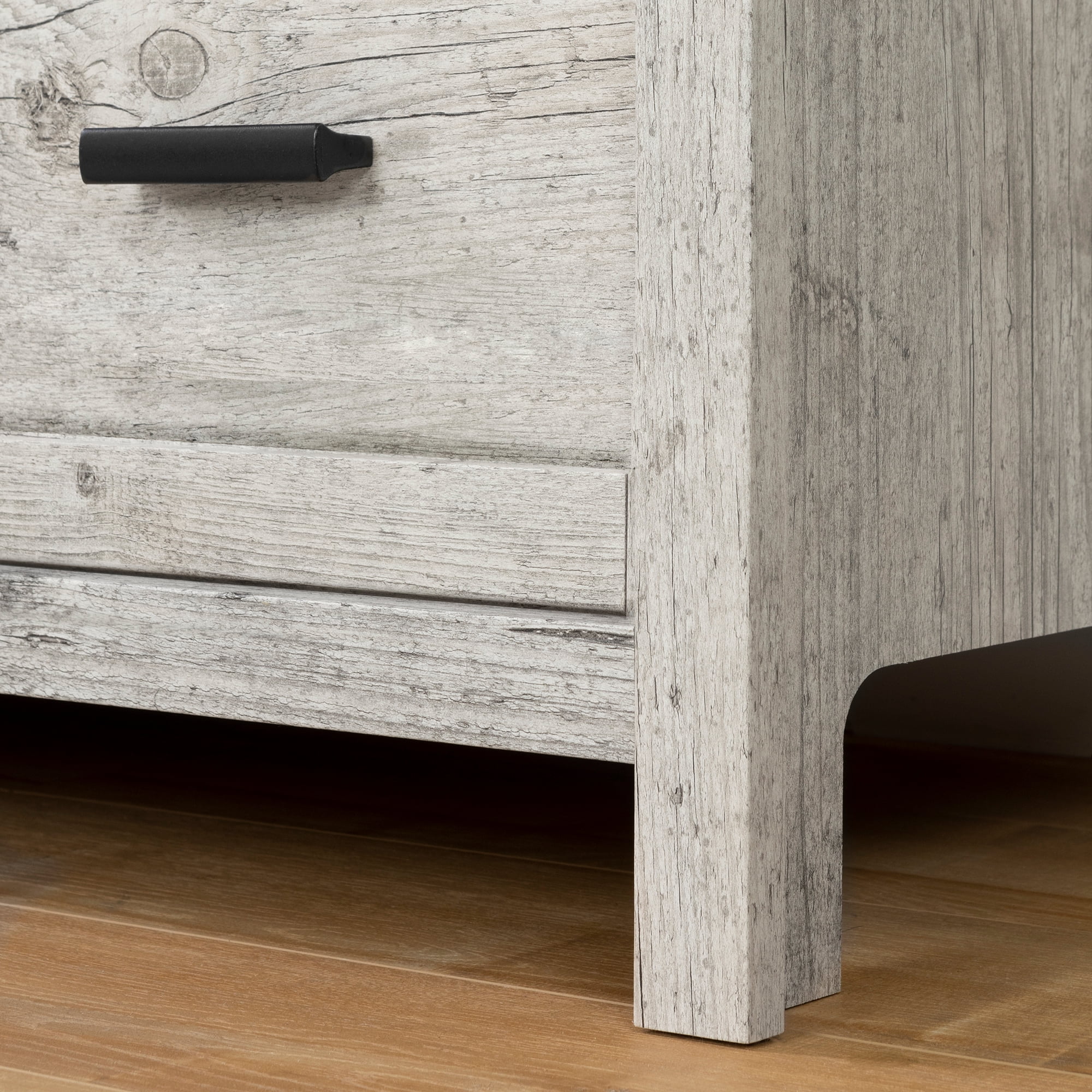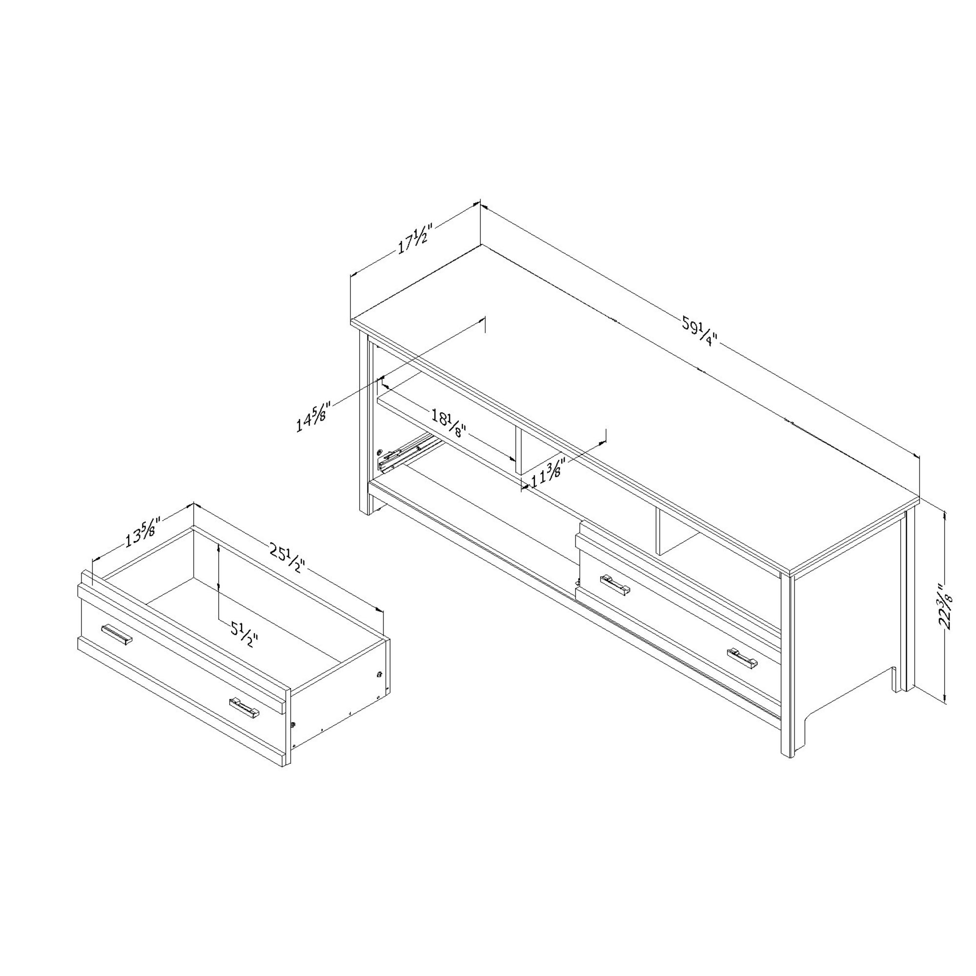 For REPLACING PARTS and HELP DURING ASSEMBLY, please contact us by phone at 1-800-290-0465, text message at 915-800-2833 (USA) (fees may apply), email at [email protected] or fill a part request form on . South Shore Exhibit, Farmhouse TV Stand, Seaside Pine FUNCTIONAL STORAGE: Accommodating LCD and plasma televisions up to 60”, this TV stand features 2 spacious drawers, and 3 open storage compartments. TRANSITIONAL STYLE: Combining contemporary lines and metal handles, this TV stand will complement any home décor. ADAPTED FOR MODERN LIVING: With plenty of compartments to hold all your media devices, the wide, open storage spaces ensure easy wire management and adequate ventilation for electronics. Features a hole in the back panel for easy and convenient wire and power bar management Metal drawer slides Made in North America with non-toxic, laminated particleboard. 5-year limited warranty. Any questions? Contact South Shore, available 7/7: 1-800-290-0465 or Assembly is required and tools are not included. All products come with a clear assembly document that will guide you through all steps. If you have any questions during the assembly do not hesitate to contact South Shore Furniture for immediate support. This item is shipped in 1 box. Box dimensions : 67″ (L) x 18.5″ (W) x 5.75″ (H) 88 lb All our products meets or exceeds North American safety standards and our packaging are tested and certified to reduce the risk of damage during shipment. Clean with a dry cloth