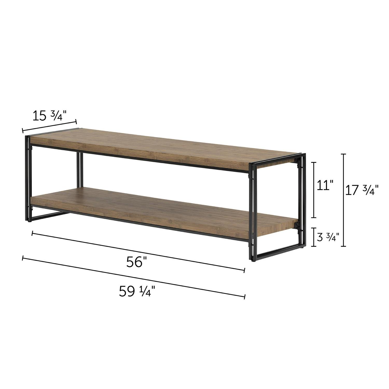 This industrial style piece is great for any TV up to 65 . It s fully open in the back, so you can easily manage the hook-ups for your electronics. And it s finished on all sides, so you can also use it as a coffee table. The bottom shelf is great for keeping books or a throw for those cozy nights!