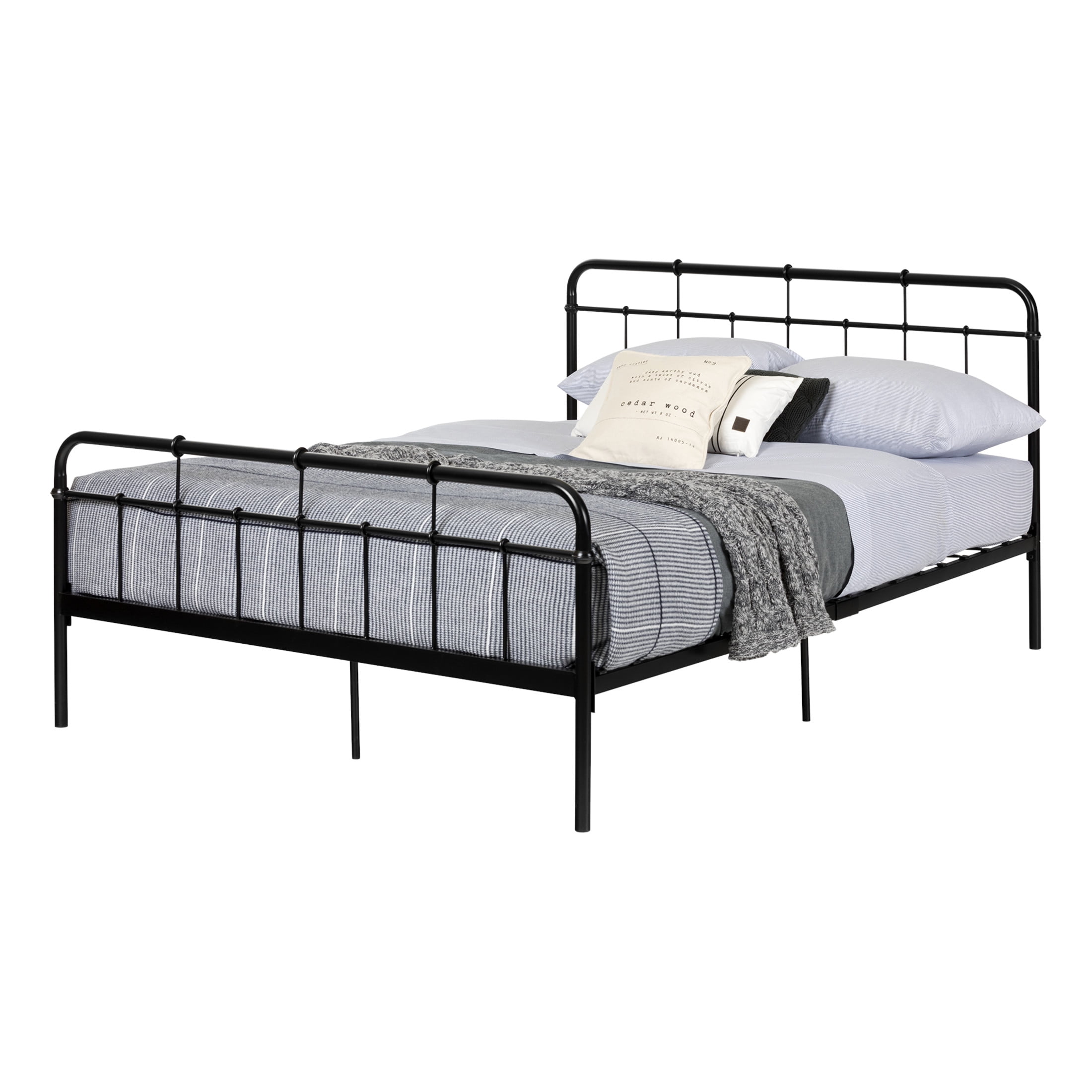For REPLACING PARTS and HELP DURING ASSEMBLY, please contact us by phone at 1-800-290-0465, text message at 915-800-2833 (USA) (fees may apply), email at [email protected] or fill a part request form on . South Shore Holland, Contemporary Metal Platform Bed, Pure Black Includes bed, headboard, and footboard Each crossbar has a small decorative ring at the end Metal slatted bed base Space under bed can be used for storage Total weight capacity: 500 lbs. We recommend that you check with your mattress supplier about their warranty when using a metal slatted bed base South Shore beds can support a weight capacity of 250 lb for a twin size bed and 500 lb for a full, queen and king size bed Made in China. 1-year limited warranty. Any questions? Contact South Shore, available 7/7: 1-800-290-0465 or Assembly is required and tools are not included. All products come with a clear assembly document that will guide you through all steps. If you have any questions during the assembly do not hesitate to contact South Shore Furniture for immediate support. This item is shipped in 1 box. Box dimensions : 64″ (L) x 32.75″ (W) x 4.5″ (H) 59 lb All our products meets or exceeds North American safety standards and our packaging are tested and certified to reduce the risk of damage during shipment. Clean with a damp cloth