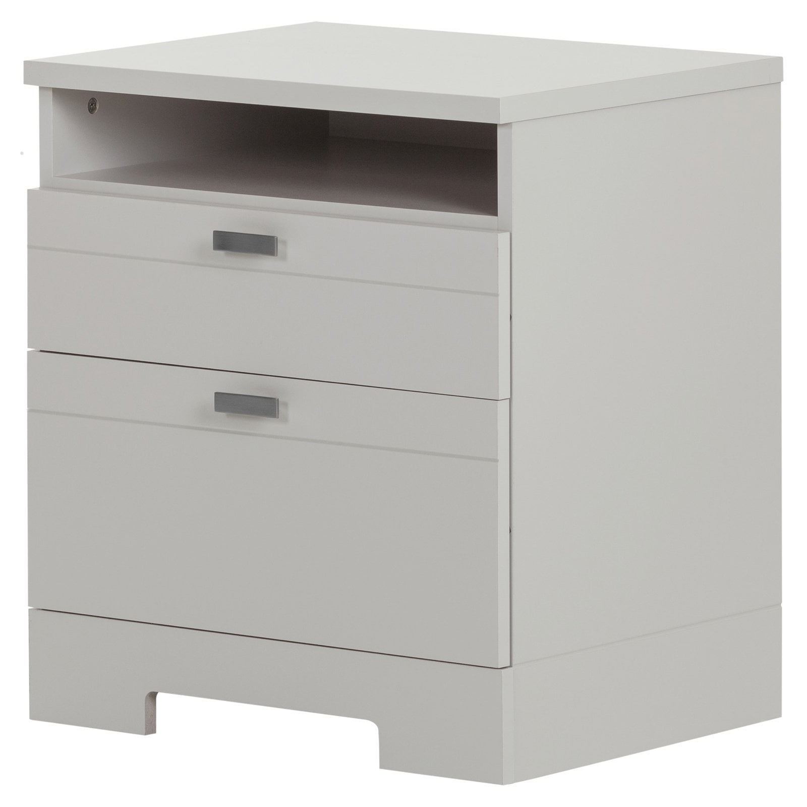 This nightstand with cutout kickplate will give your bedroom a contemporary and neutral look. In order to maximize bedside storage it features two drawers decorated with elegant metal handles and an open area at the top. With a sturdy table top suitable for a lamp, cell phone and glass of water, the bedroom cabinet has an open space in the back for easy wire management.