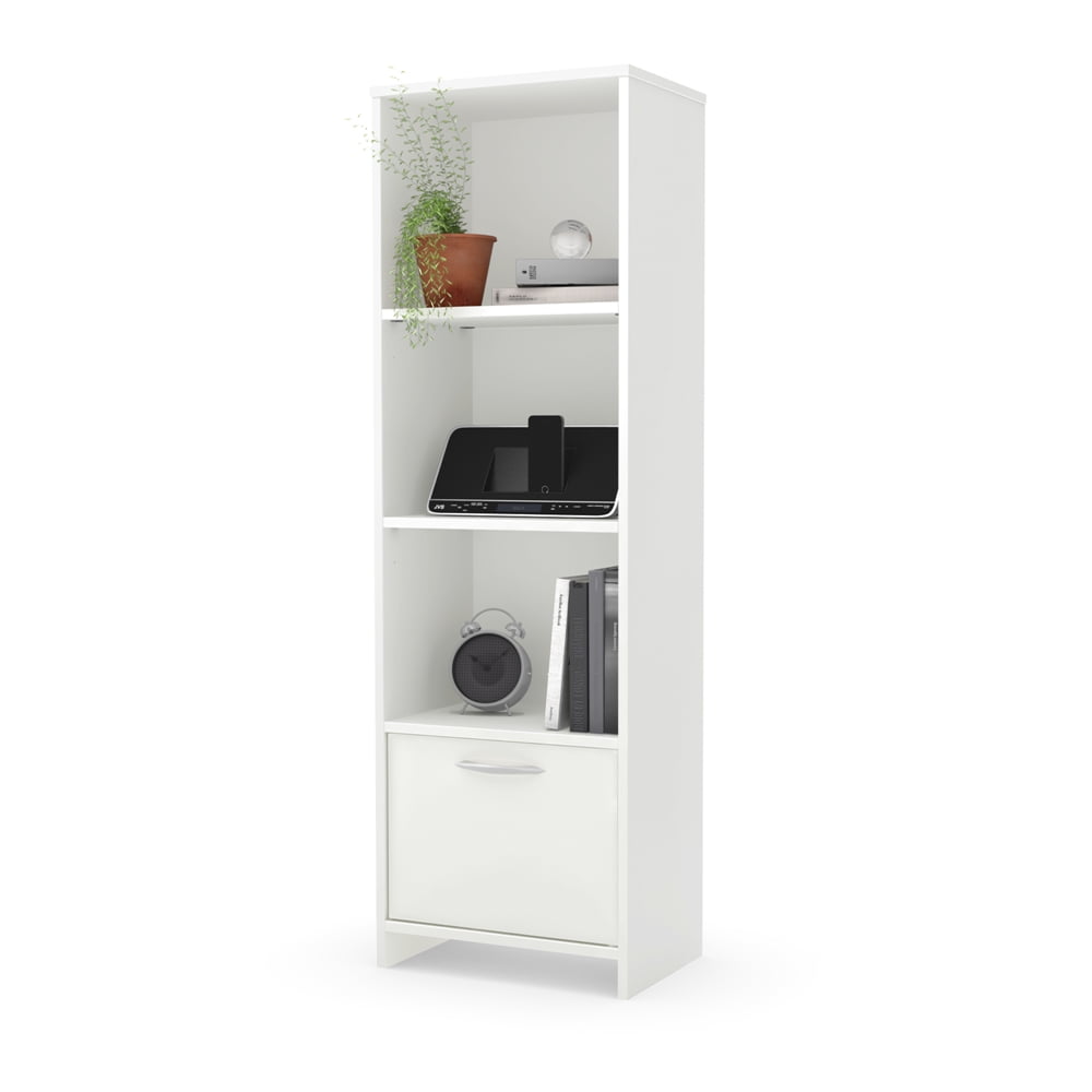 For REPLACING PARTS and HELP DURING ASSEMBLY, please contact us by phone at 1-800-290-0465, text message at 915-800-2833 (USA) (fees may apply), email at [email protected] or fill a part request form on . South Shore Step One, Contemporary 3-Shelf Bookcase with Door, Pure White Elegant metal handle in a Matte Chrome finish Multiple uses: Media tower, shelving unit, bookcase, nightstand 3 open, practical and accessible storage spaces, separated by 2 adjustable shelves (can support up to 25 lb each) 1 hole in the back for better wire management Closed storage space at the bottom concealed by a non-reversible door Made in North America with non-toxic, laminated particleboard. Accessories not included. 5-year limited warranty. Any questions? Contact South Shore, available 7/7: 1-800-290-0465 or Assembly is required and tools are not included. All products come with a clear assembly document that will guide you through all steps. If you have any questions during the assembly do not hesitate to contact South Shore Furniture for immediate support. This item is shipped in 1 box. Box dimensions : 64.25″ (L) x 12.5″ (W) x 3.25″ (H) 45 lb All our products meets or exceeds North American safety standards and our packaging are tested and certified to reduce the risk of damage during shipment. Clean with a dry cloth