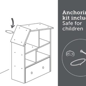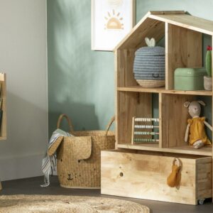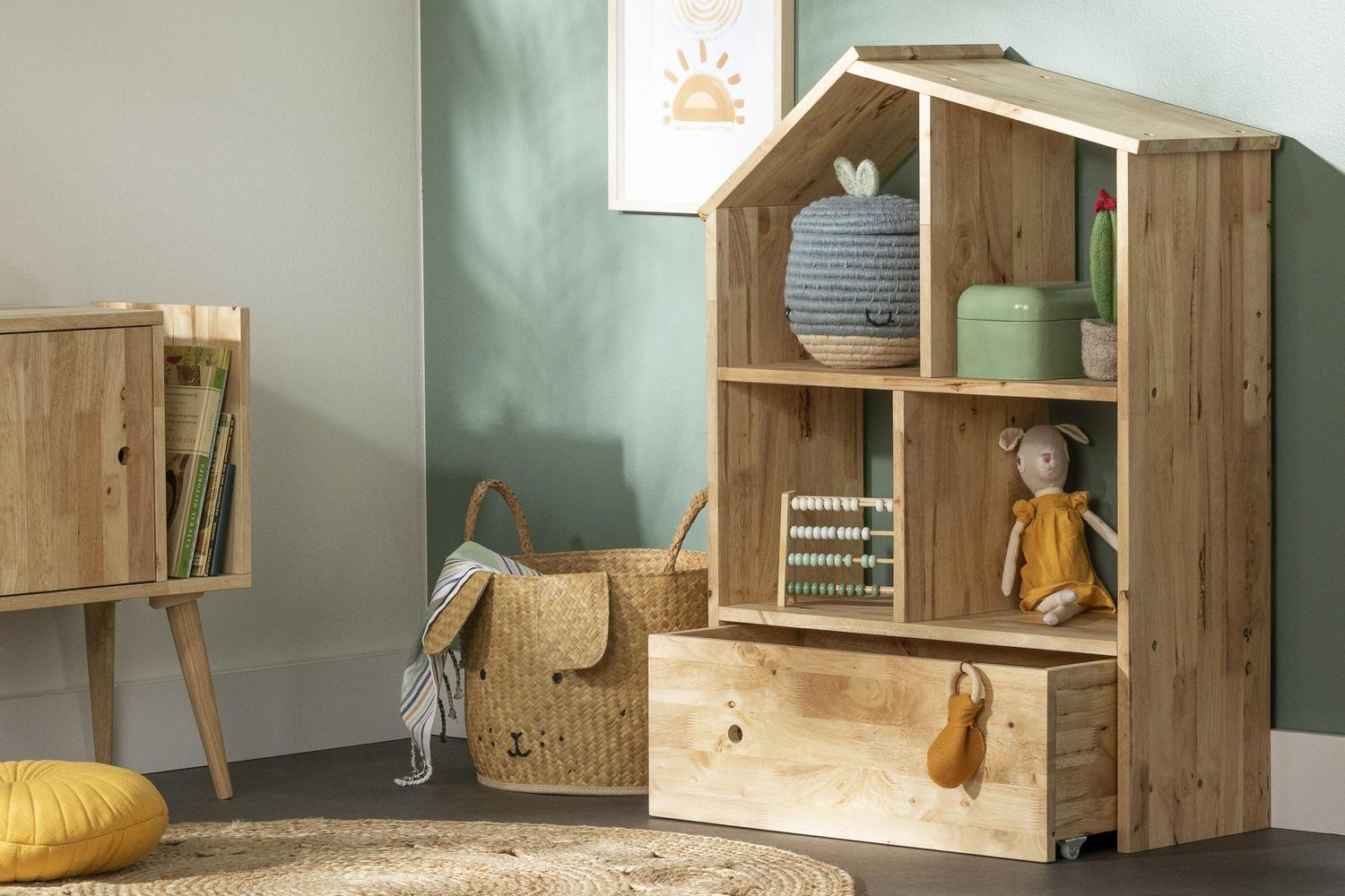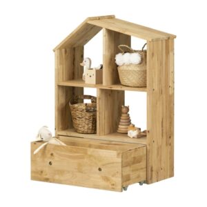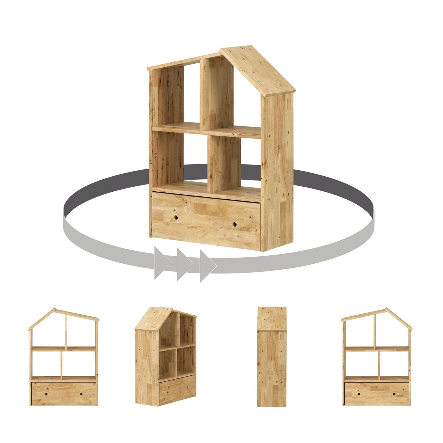 This house-shaped rubberwood bookstand is just the right height for your little one to keep stuffed animals, and books within easy reach. Place some beautiful baskets and your child s favorite plushies in the four open compartments. The spacious drawer on wheels will be ideal for costumes or arts and crafts accessories and the kids can put everything away once the play date is over!