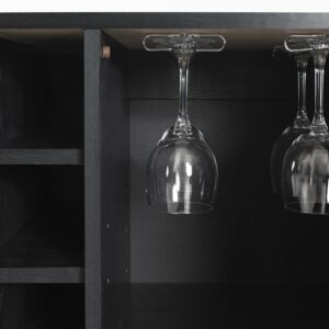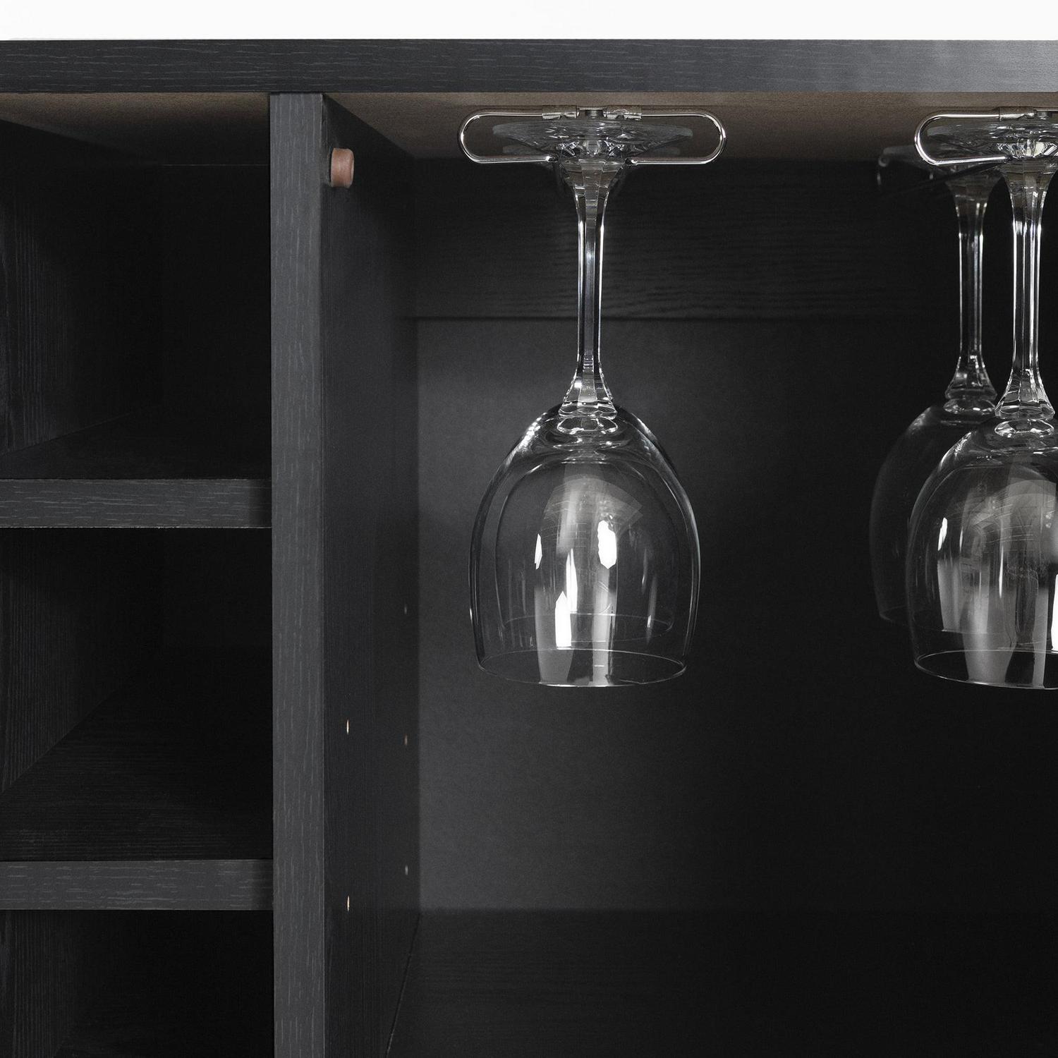 The Vietti bar cabinet has a large drawer with specialized storage for wine and liquor bottles. There s also a smaller drawer for storing coasters, bottle openers, and other accessories or gadgets. This piece also has a closed compartment, fitted with a shelf and glass holders, where you can hang your stemware so it s nicely aligned and well ordered. Something else you ll like: the built-in rack with 6 open spaces ideal for storing more bottles, but easy to access. The final touch is a towel holder on the side.