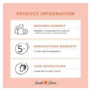- 5-year limited warranty. Any questions Contact South Shore, available 7/7: 1-800-290-0465 or www.southshorefurniture.com
