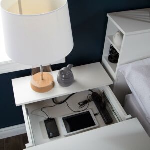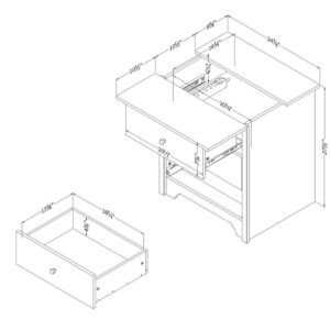 For REPLACING PARTS and HELP DURING ASSEMBLY, please contact us by phone at 1-800-290-0465, text message at 915-800-2833 (USA) (fees may apply), email at services@South Shore Furniture.com or fill a part request form on https://form.jotform.com/South Shore Furniture/replacement-form South Shore Vito Nightstand Charging Station White BUILT-IN CHARGING STATION: Slide a tray to conceal messy cords, keeping your devices charged and within easy reach inside this elegant bedroom cabinet. CONTEMPORARY STYLE: The nightstand features modern styling and sleek metal knobs that will complement any bedroom décor. SPACIOUS DRAWERS: Organize books, electronics, accessories and necessities within easy reach in your bedroom with the 2 smooth gliding drawers on metal slides. 5-YEAR LIMITED WARRANTY: South Shore is proud to stand behind this nightstand with charging station and drawers with an exclusive 5-year limited warranty. Shop with confidence knowing your purchase is always covered. EASY ASSEMBLY INSTRUCTIONS: All products come with a clear assembly document that will guide you through all steps. If you have any questions during the assembly do not hesitate to contact South Shore Furniture for immediate support.This item is shipped in 1 box, make sure to have a friend with you Wipe with a dry cloth This product is made in North America with Laminated Particleboard BOX INFORMATION: Box #1 : 33.5″ D x 19.5″ W x 6″ H, 57 lb.